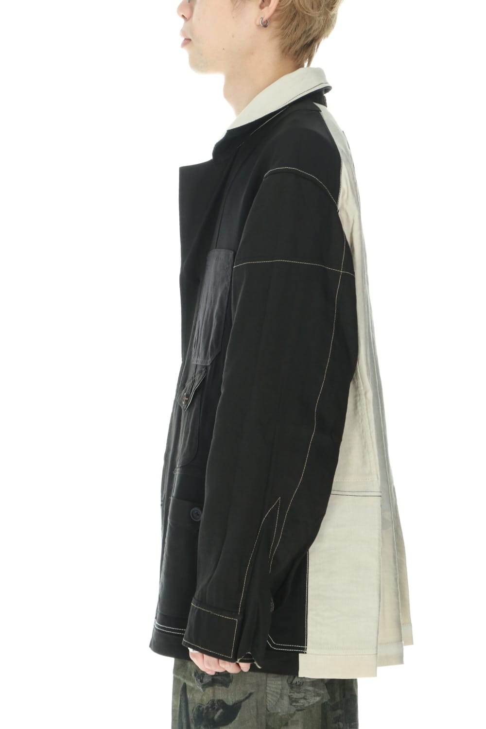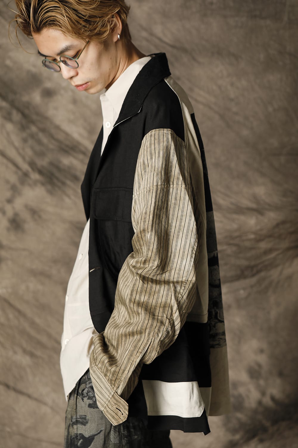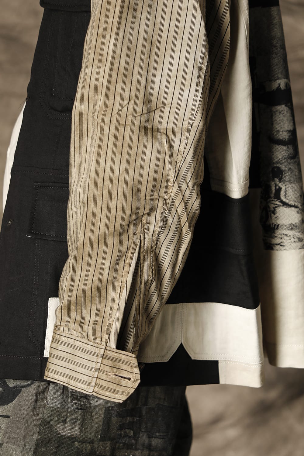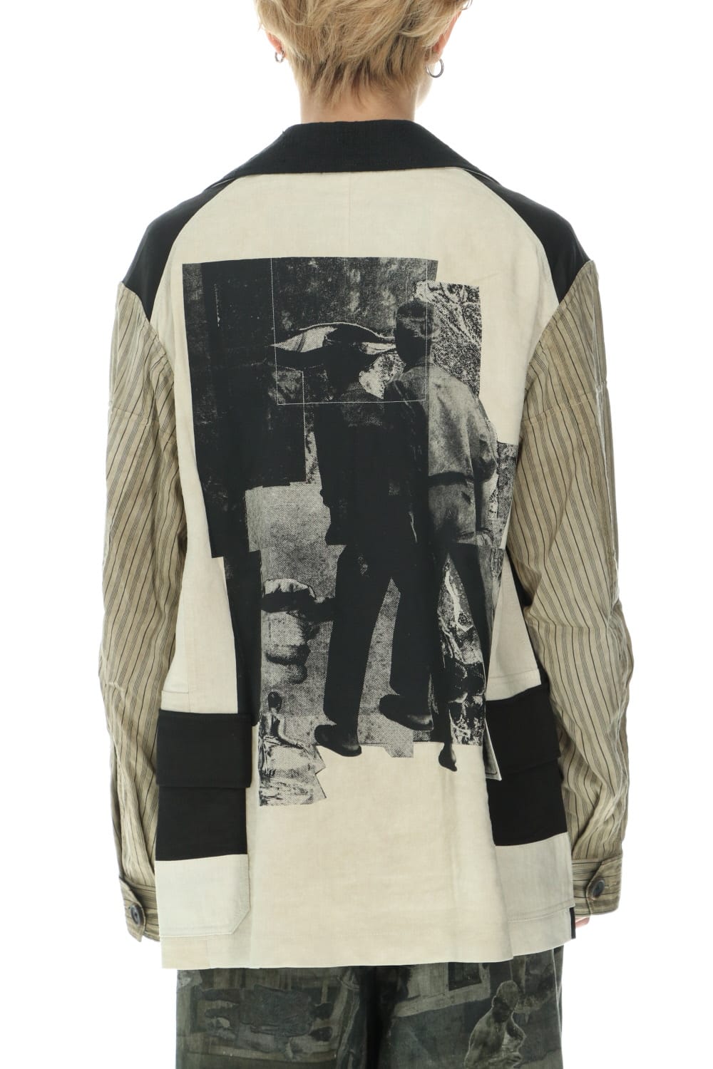Inspired by the collage work of German artist Hannah Höch, this collection attempts to reconstruct the image by cutting and pasting the photograph, to express the realism of the photograph and the abstraction of the memory by interweaving. This oversized safari jacket is characterized by its inside-out design, which is made with a lining. The shape is relatively simple, but the collage of the details expressed by the combination of multiple pocket details and the collage print on the backside expresses the seasonality of the 21 SS collection. This is a ramie viscose twill that has a dry body, yet the lightness and smooth expression of rayon. The sleeves are dyed with a cold dye at the fabric stage, giving it a vintage-like uneven texture with a smooth striped cotton Cupra fabric for a lining design. It is not a reversible design, but it is a jacket with a high degree of perfection that accentuates the pocket details and beautiful sewing on the back.