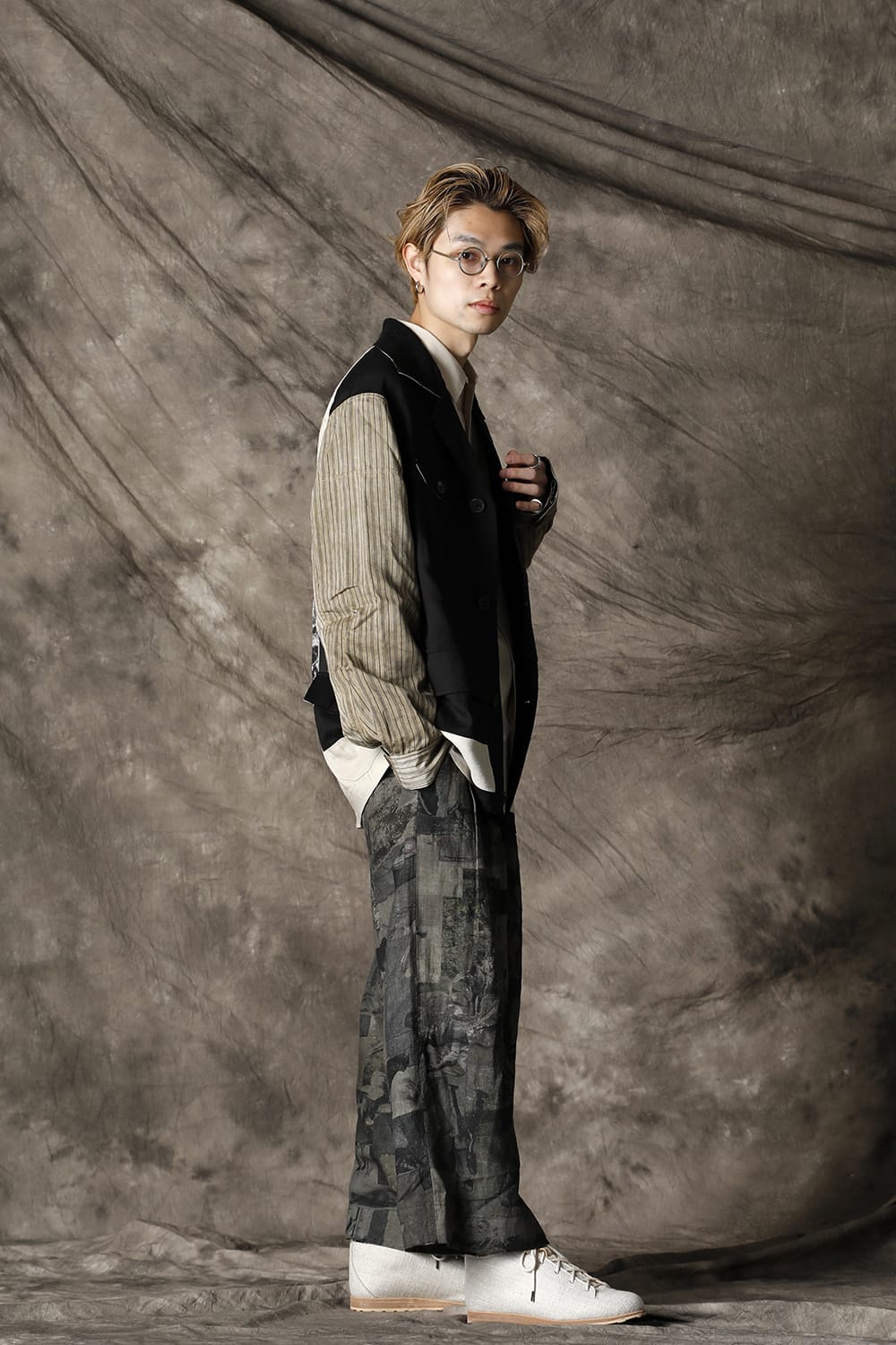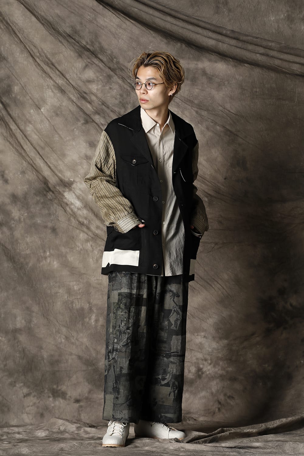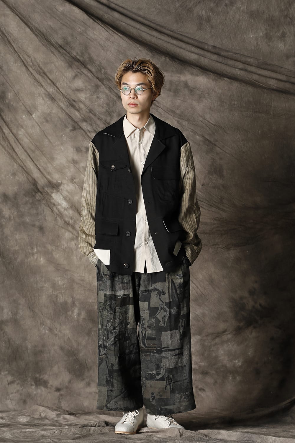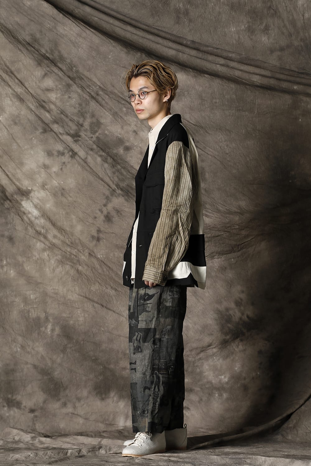 Inspired by the collage work of German artist Hannah Höch, this collection attempts to reconstruct the image by cutting and pasting the photograph, to express the realism of the photograph and the abstraction of the memory by interweaving. This oversized safari jacket is characterized by its inside-out design, which is made with a lining. The shape is relatively simple, but the collage of the details expressed by the combination of multiple pocket details and the collage print on the backside expresses the seasonality of the 21 SS collection. This is a ramie viscose twill that has a dry body, yet the lightness and smooth expression of rayon. The sleeves are dyed with a cold dye at the fabric stage, giving it a vintage-like uneven texture with a smooth striped cotton Cupra fabric for a lining design. It is not a reversible design, but it is a jacket with a high degree of perfection that accentuates the pocket details and beautiful sewing on the back.