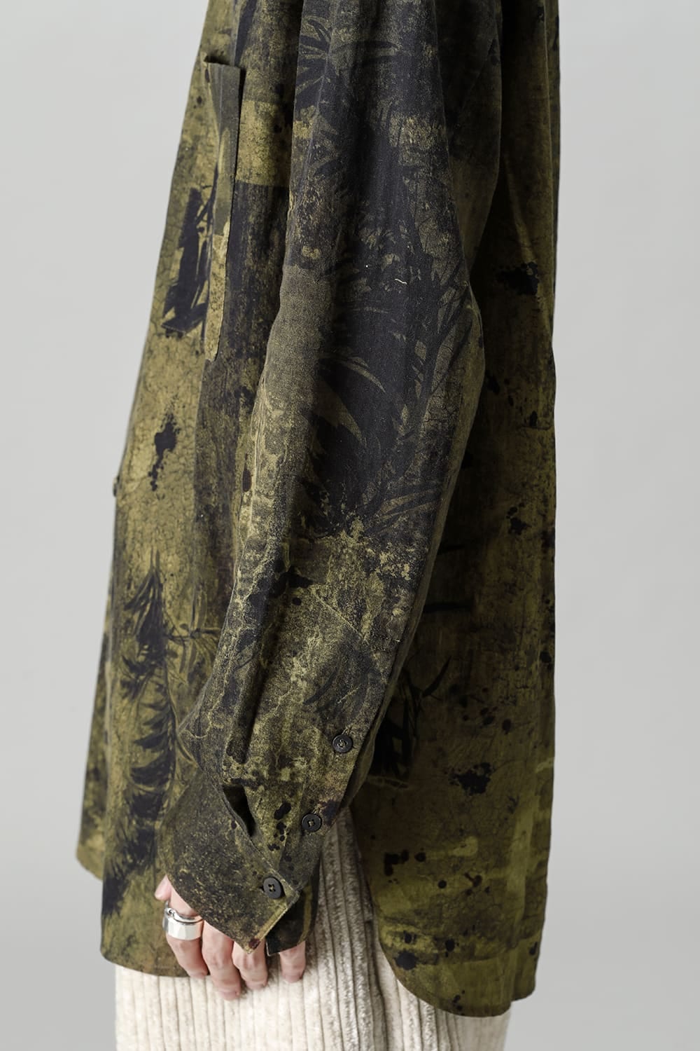 This is a spread collar shirt made of cotton wool light twill fabric with a print all over. The print is a graphic based on the designer's own photograph of the scenery of Suzhou Classic Garden, the origin of this season's concept "SUGARDENS". The printing method uses a digital print to express the nuance of the color and the fineness of the photograph, and by printing the entire fabric without being aware of the pattern or parts beforehand, when finished as a shirt, the design becomes like a collage. In addition, this shirt is made of a thin cotton wool material, which makes use of the characteristic that the print appears on the back, and the special color of the same shirt is white by using the lining. The lining of the yoke is made of cotton cupra stripe fabric, which has been used since 20 SS season, with the intention of making the seasonality vague. This fabric was originally developed in Italy by ZIGGY CHEN, who designated it from the machine shop to the dyeing factory.