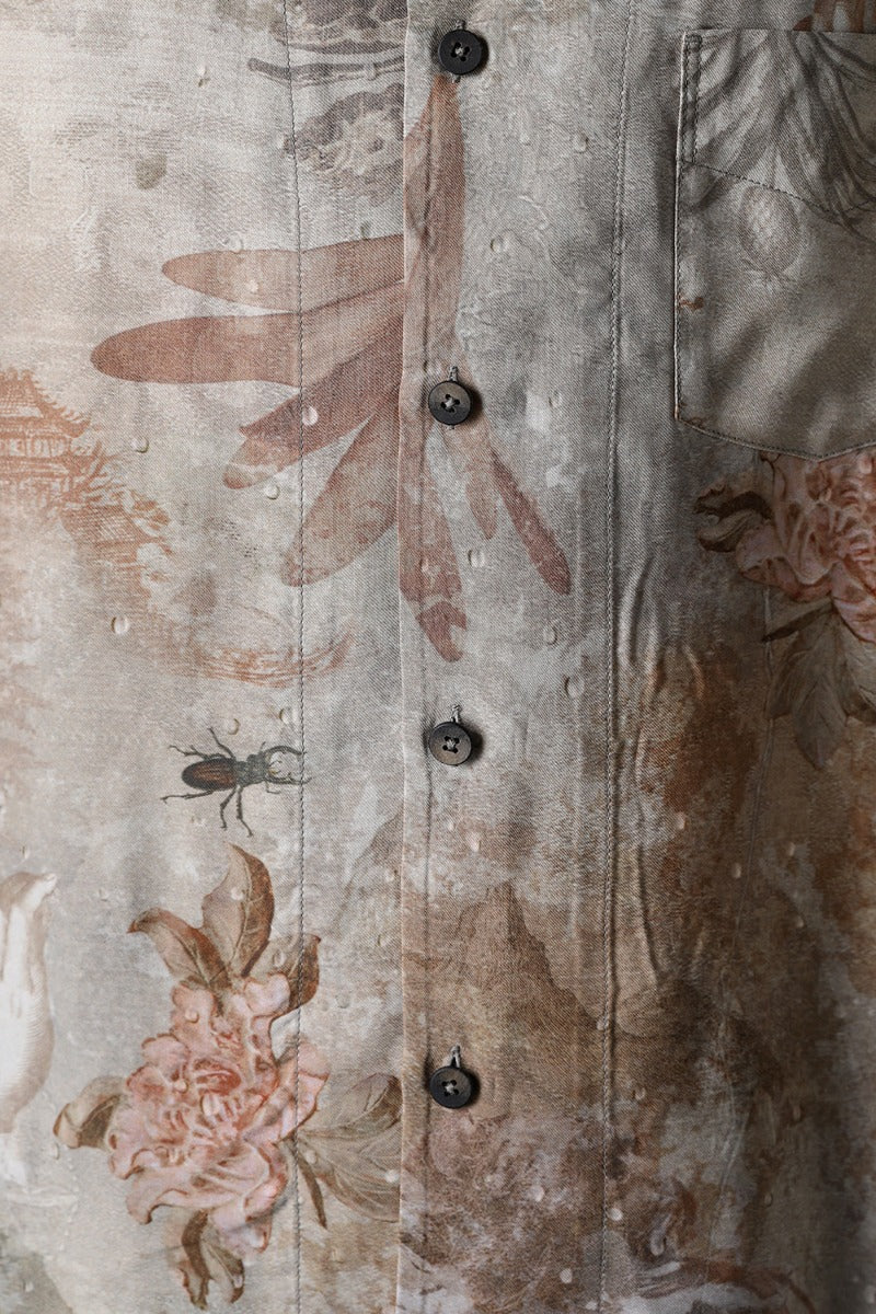 The elegant yet earthy colors, print motifs, and detailing create a well-balanced design that never touches too much on either side, The open collar shirt, which tends to be finished in a resort casual style, has been transformed into something unique.