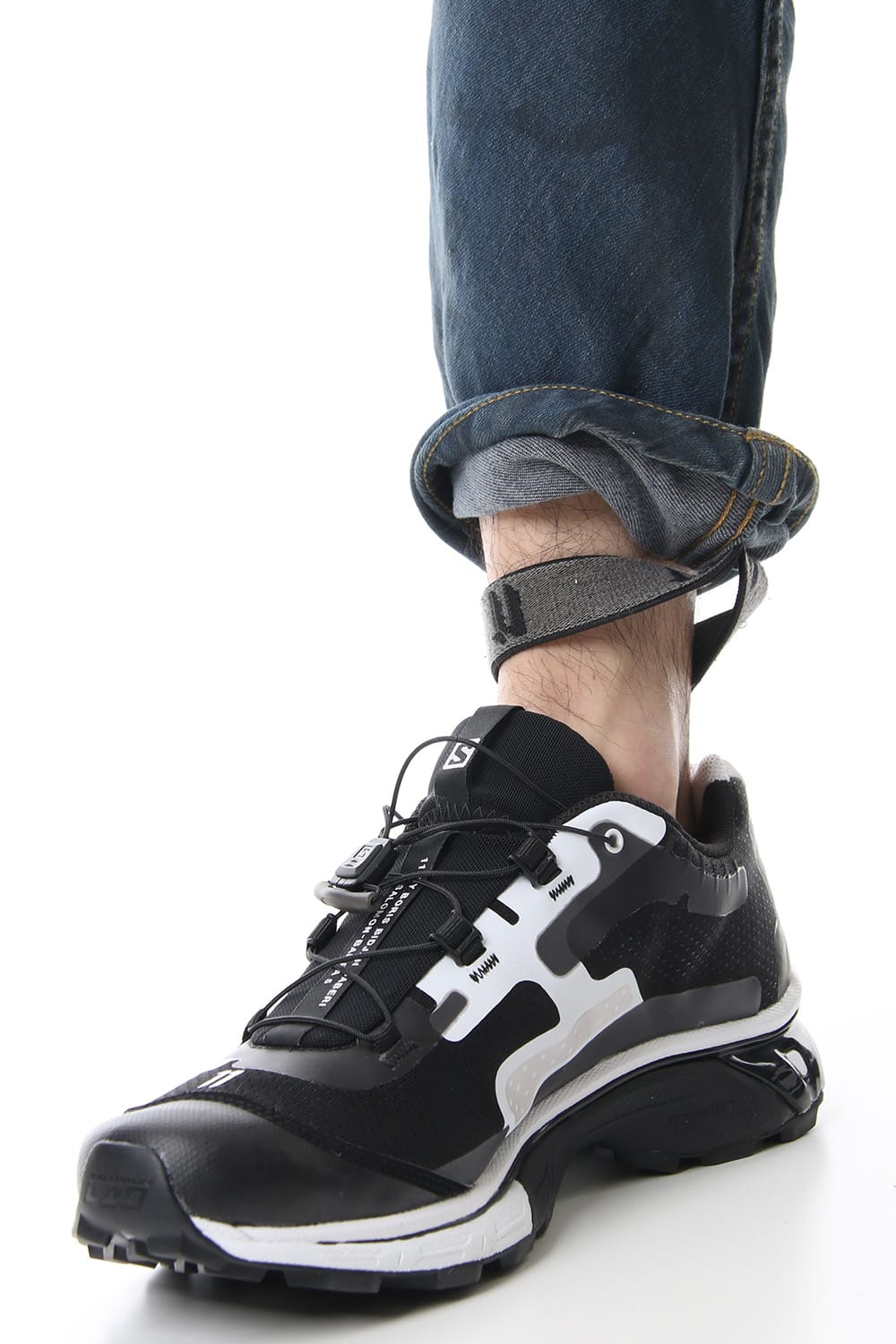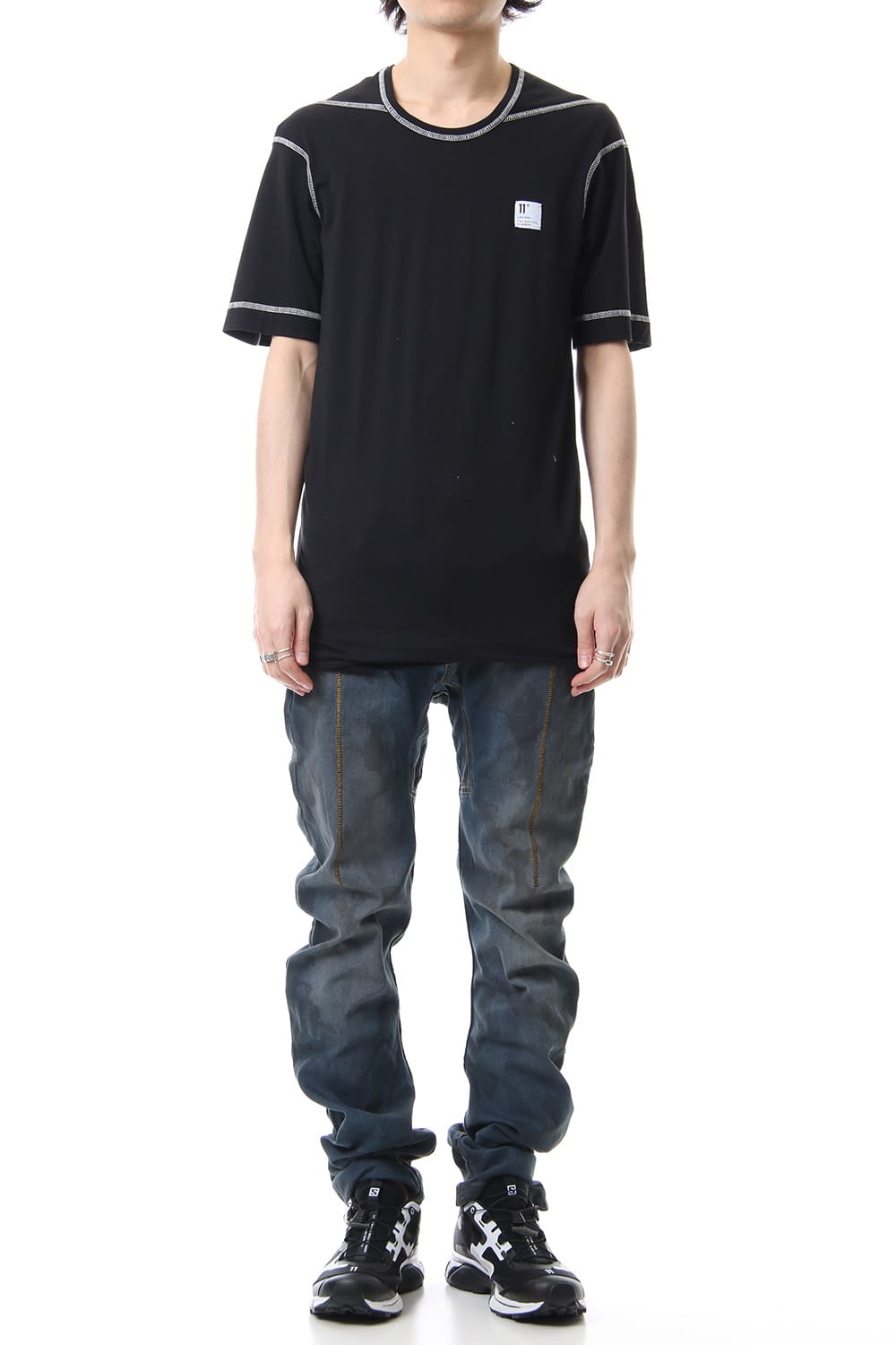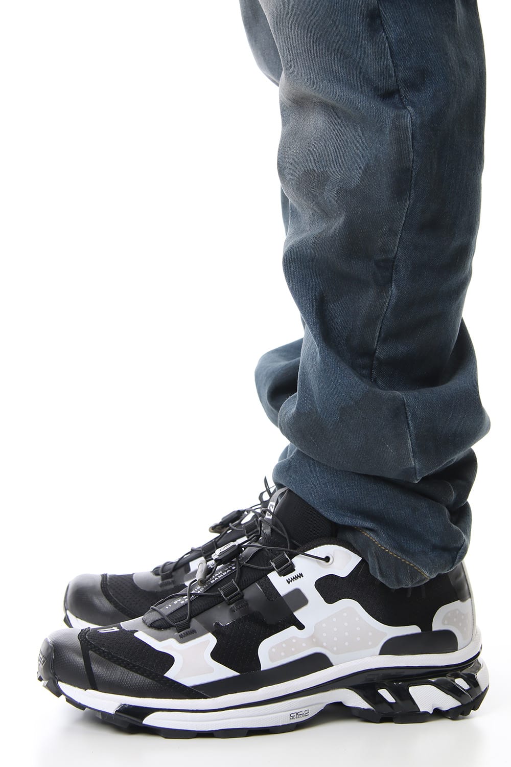 Washed on the whole using yellow stitching denim pants. The hip area has a little room and is tapered towards the hem. The thighs and back pockets also features overlock stitchings which are unique to the brand. In addition, it is designed to produce a beautiful silhouette when worn across the curve as a whole. There is a logo print on rubber on the hem lining, it is designed so that the logo print can be seen when rolled up.