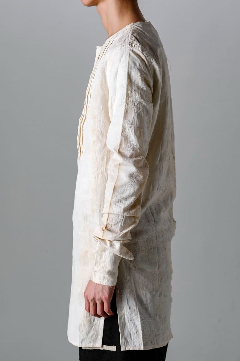 This model is made of dead stock curtain fabric from the 1950s. It features a unique floral jacquard that does not exist today. Wearing a long shirt under a jacket and layering it is a typical OLUBIYI THOMAS styling. The pleats on the front and the rather long sleeves are inspired by the details of Victorian shirts.