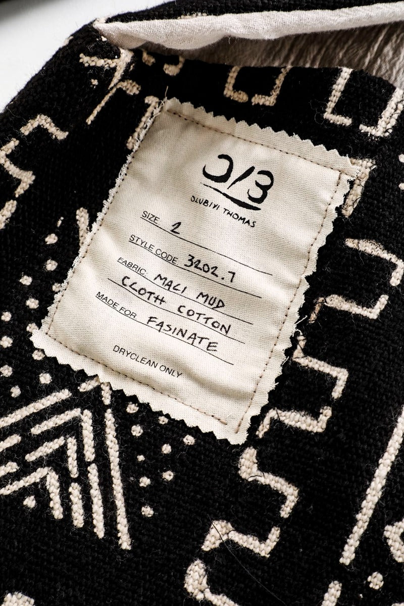 This is an iconic model in the OLUBIYI THOMAS collection. As the name suggests, this item is inspired by the Japanese kimono. The textiles used are indigenous to Mali, a country in West Africa, the designer's home area. This textile, one of the designer's most cherished textiles, originally had a width of only 10 cm to 15 cm, and was sewn together one by one. Each piece is hand-dyed with mud, hand-spun, and hand-woven, and each piece has a different pattern.