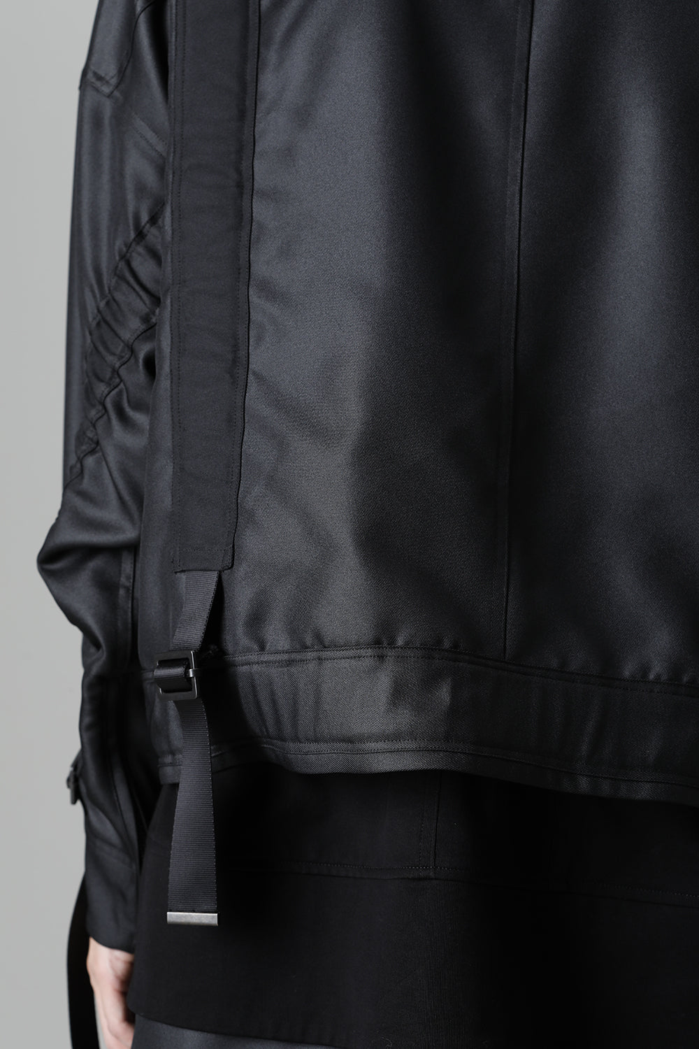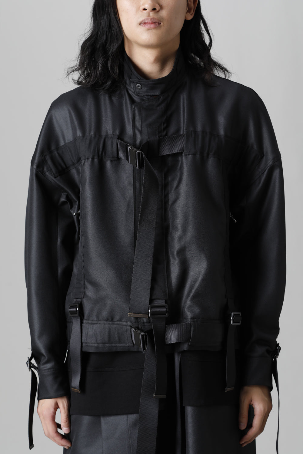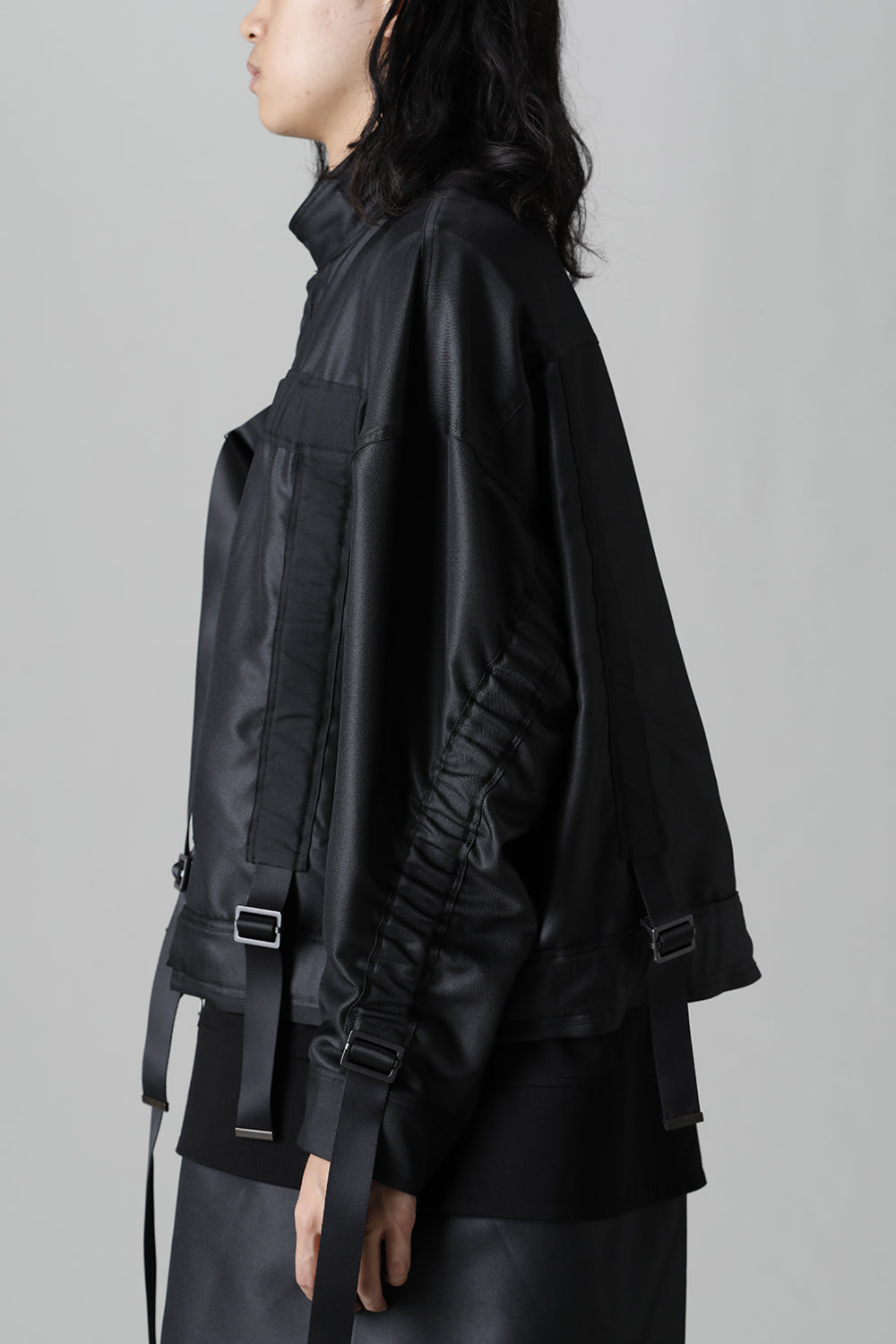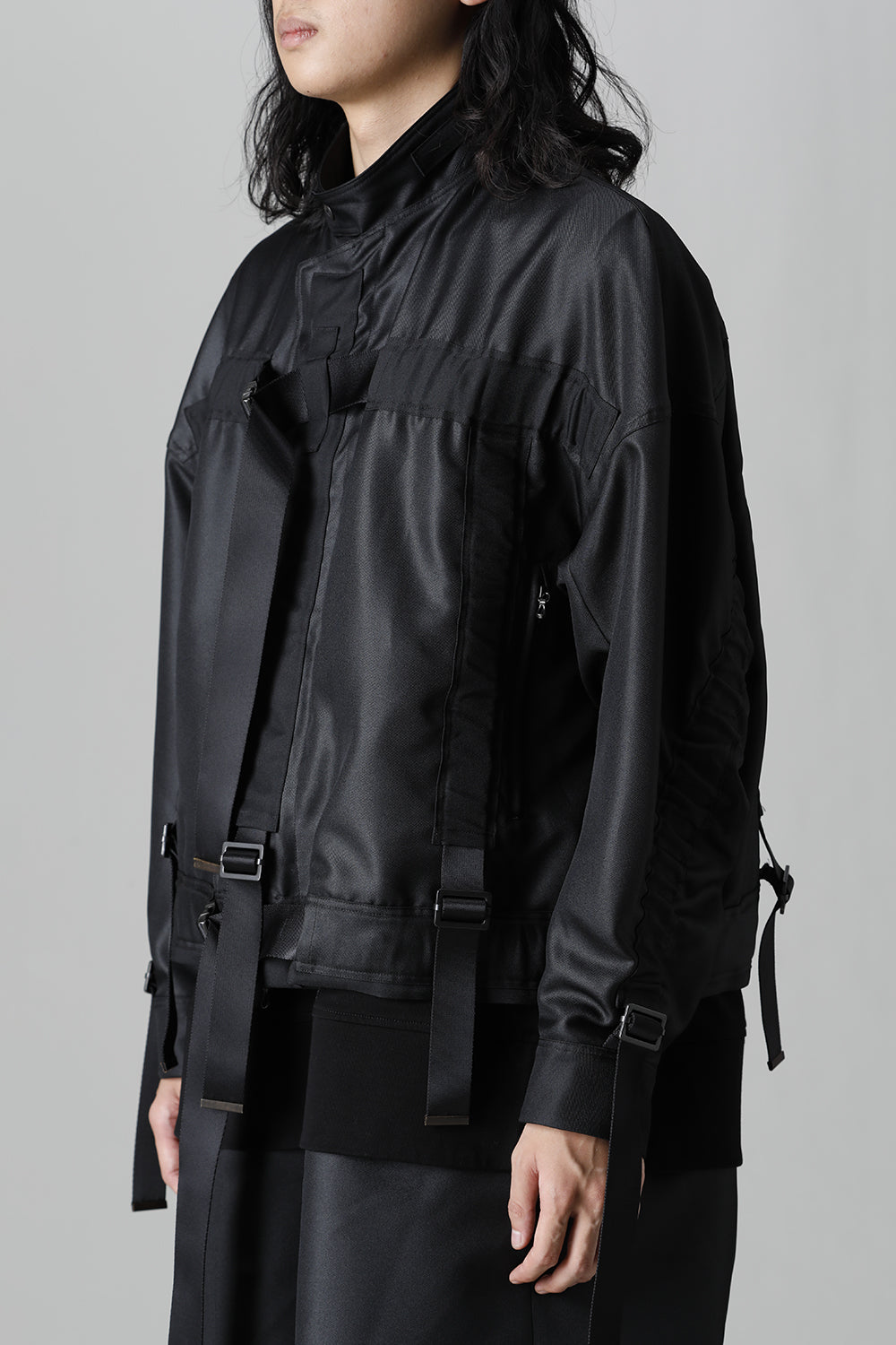 A blouson with belts of details on every part of it.