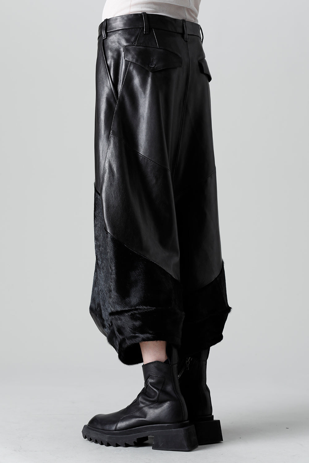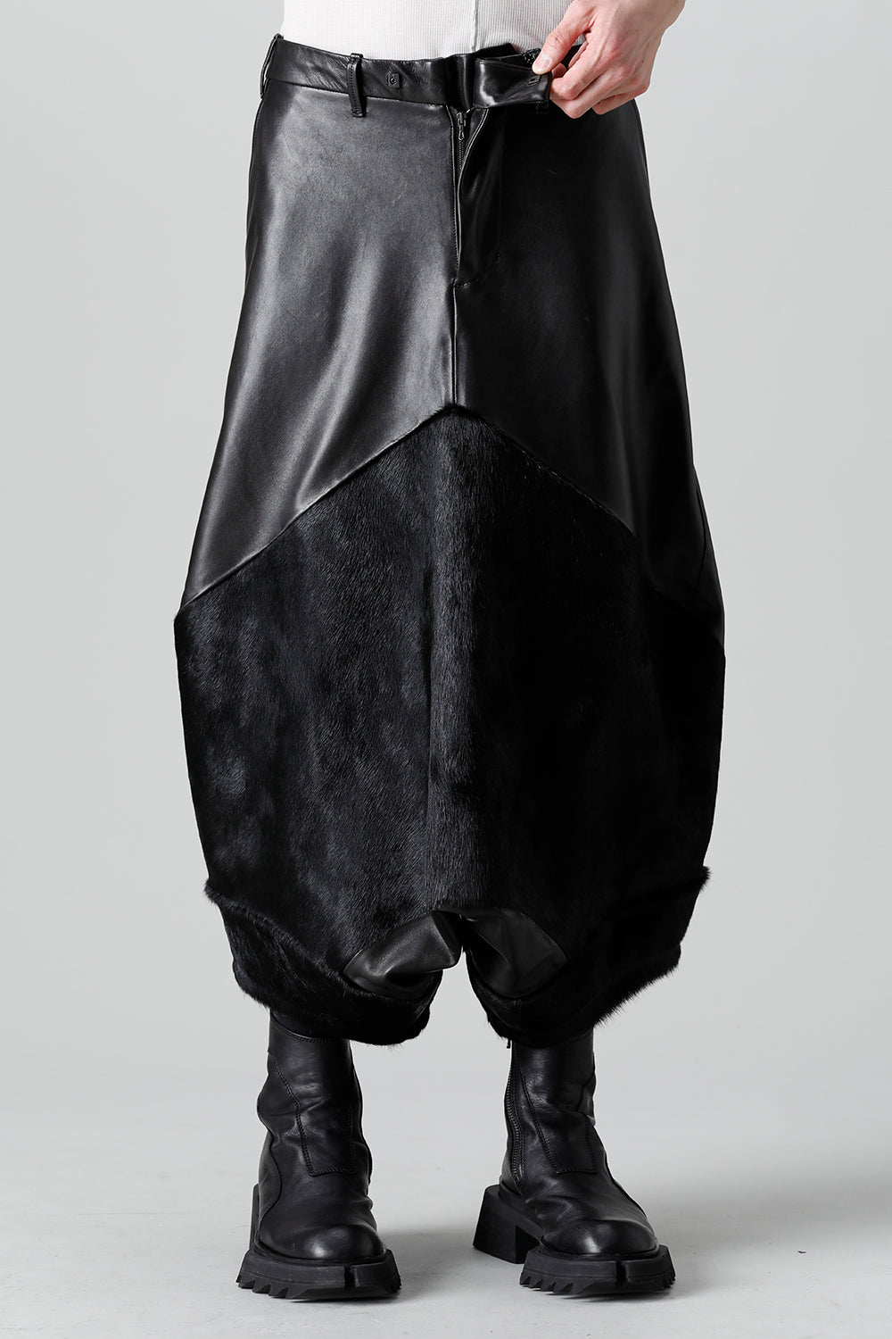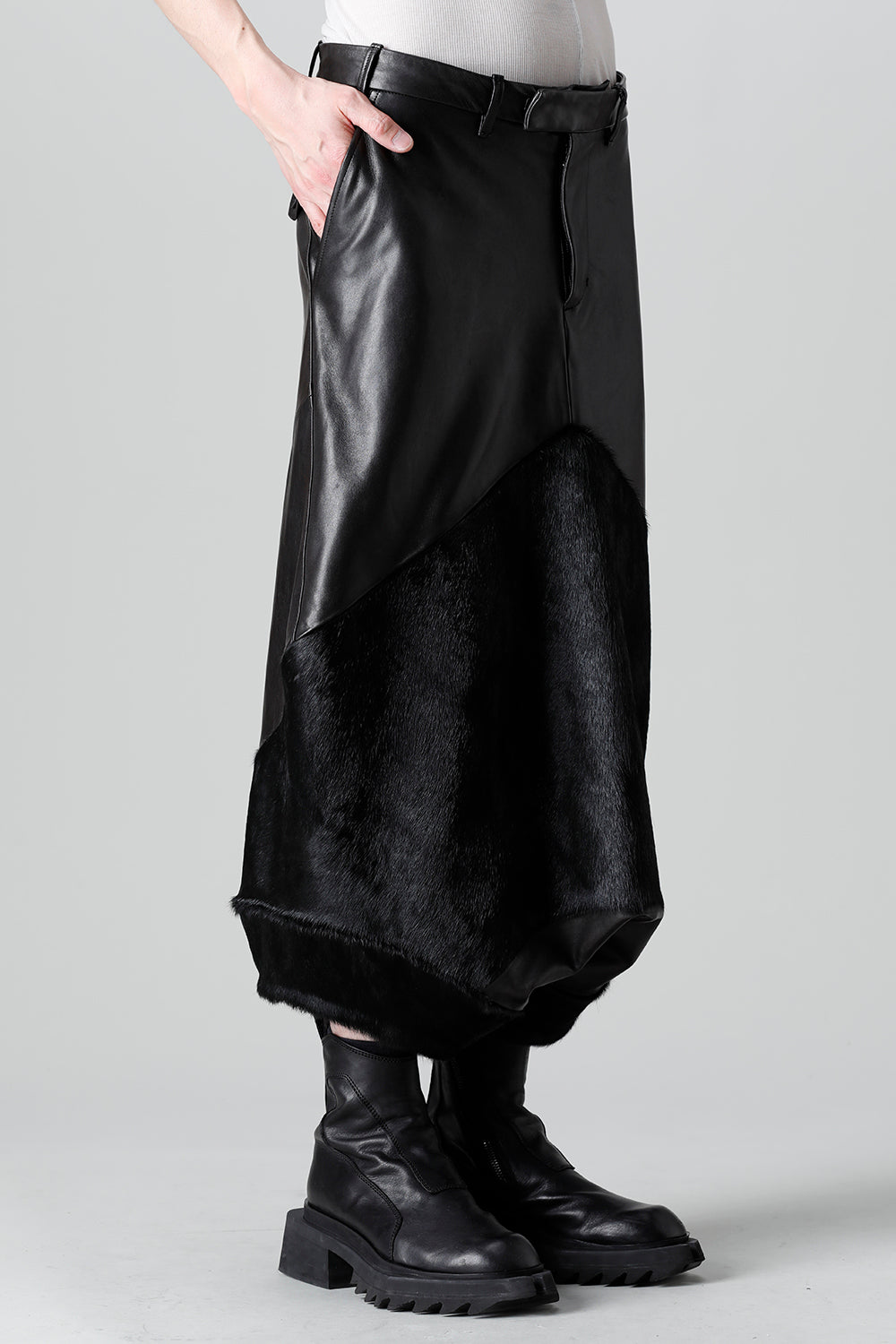 Expressing this season's collection theme [ EREBUS; ], this pants is made of lambskin and deployed with cowhair.