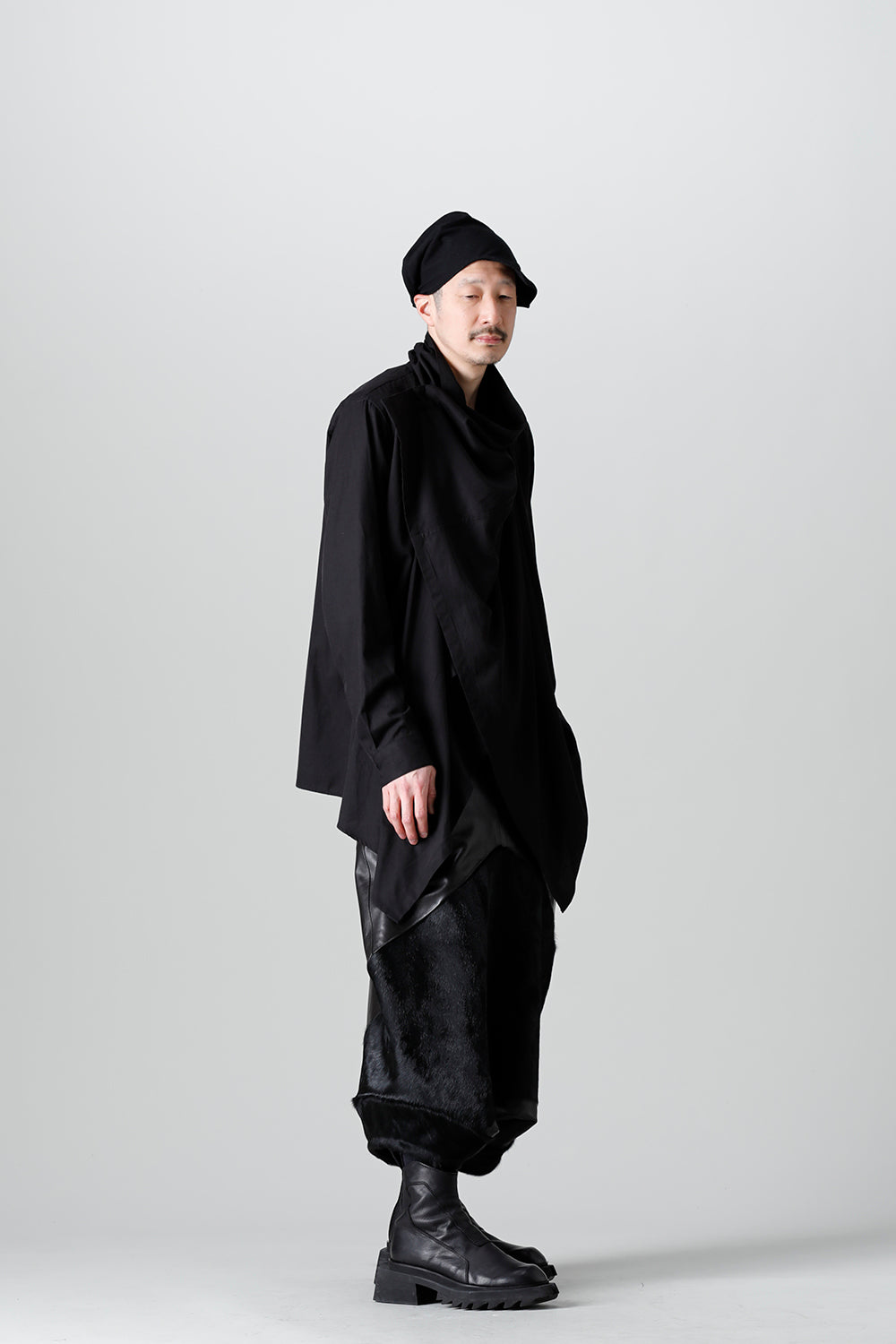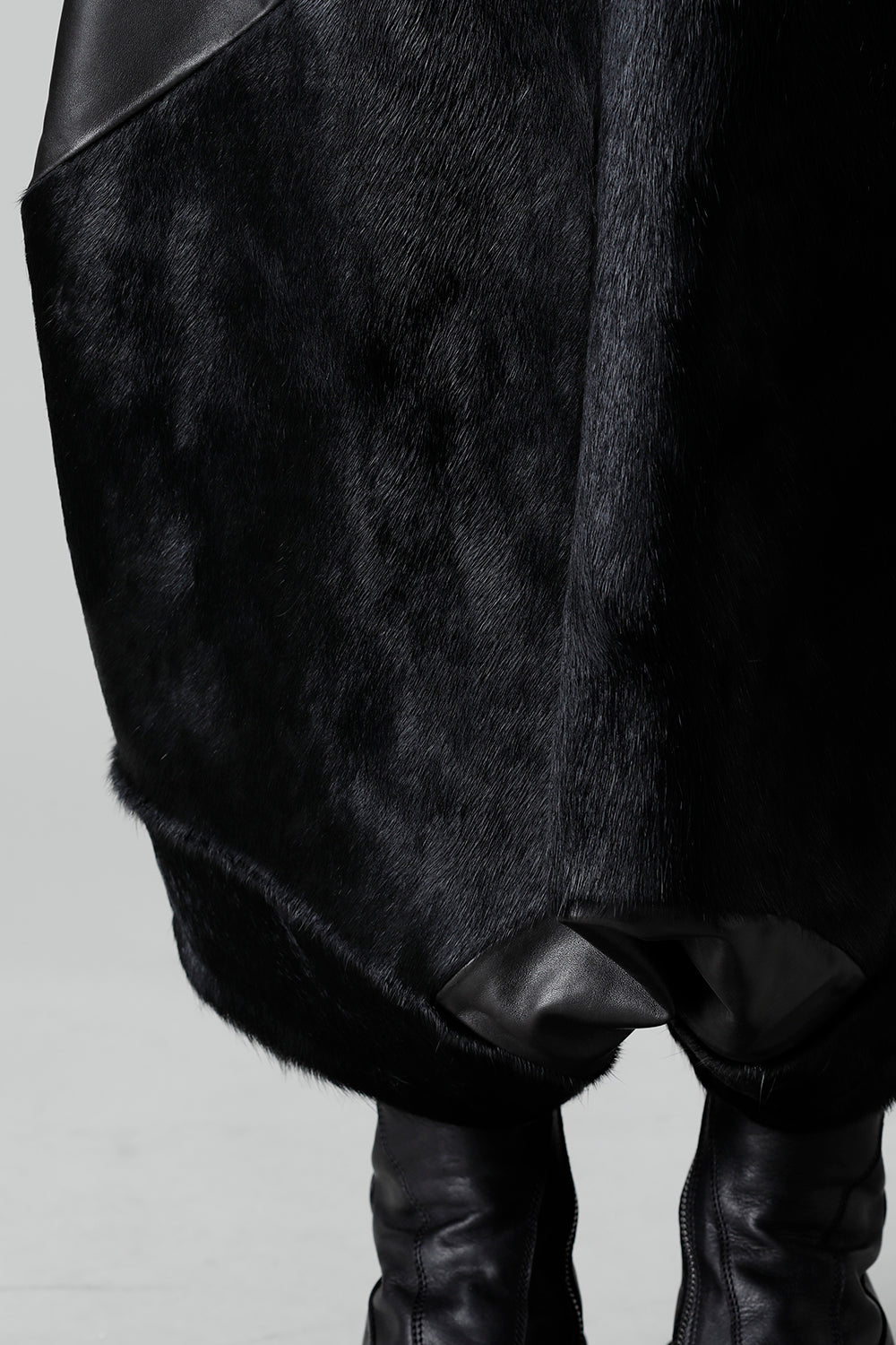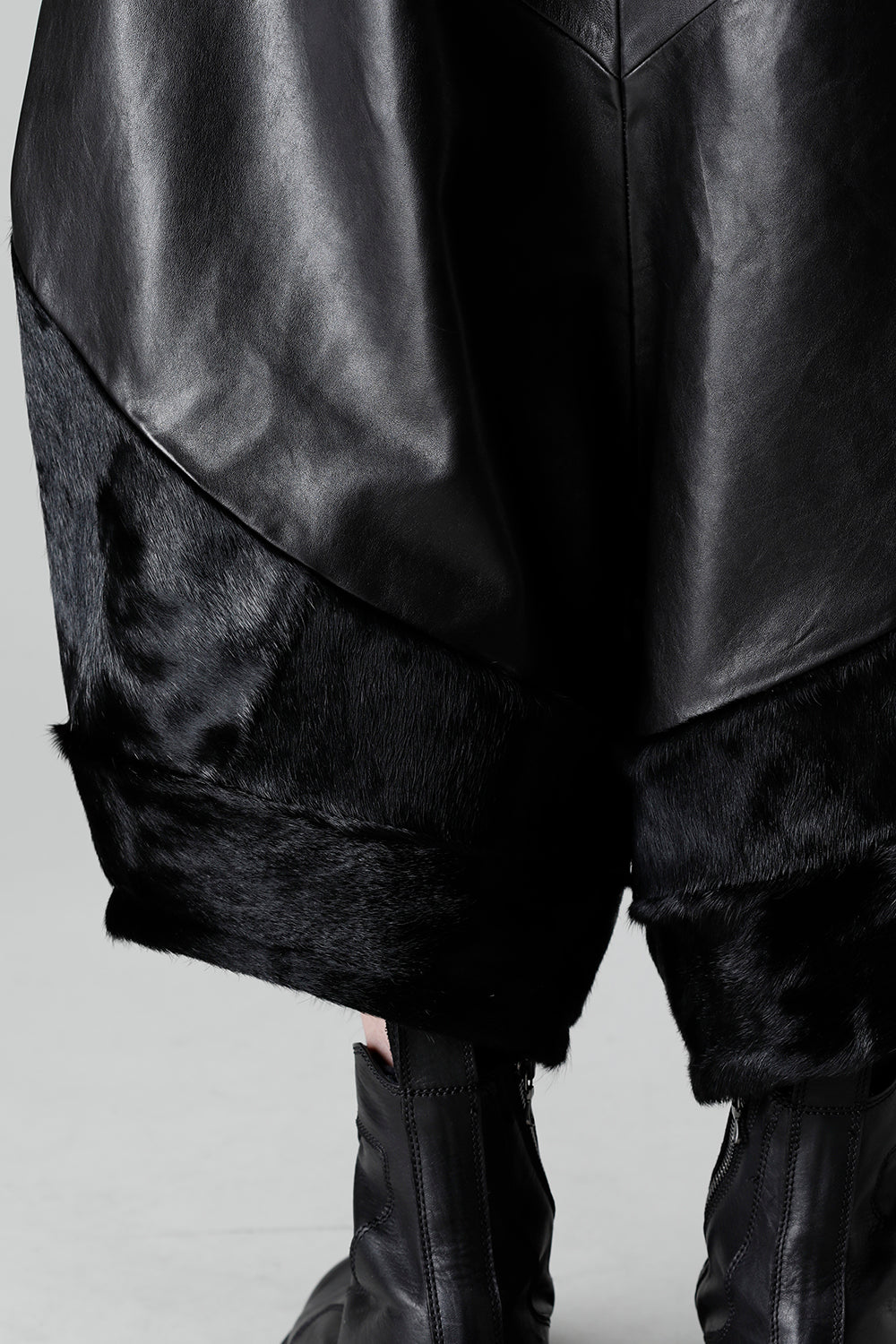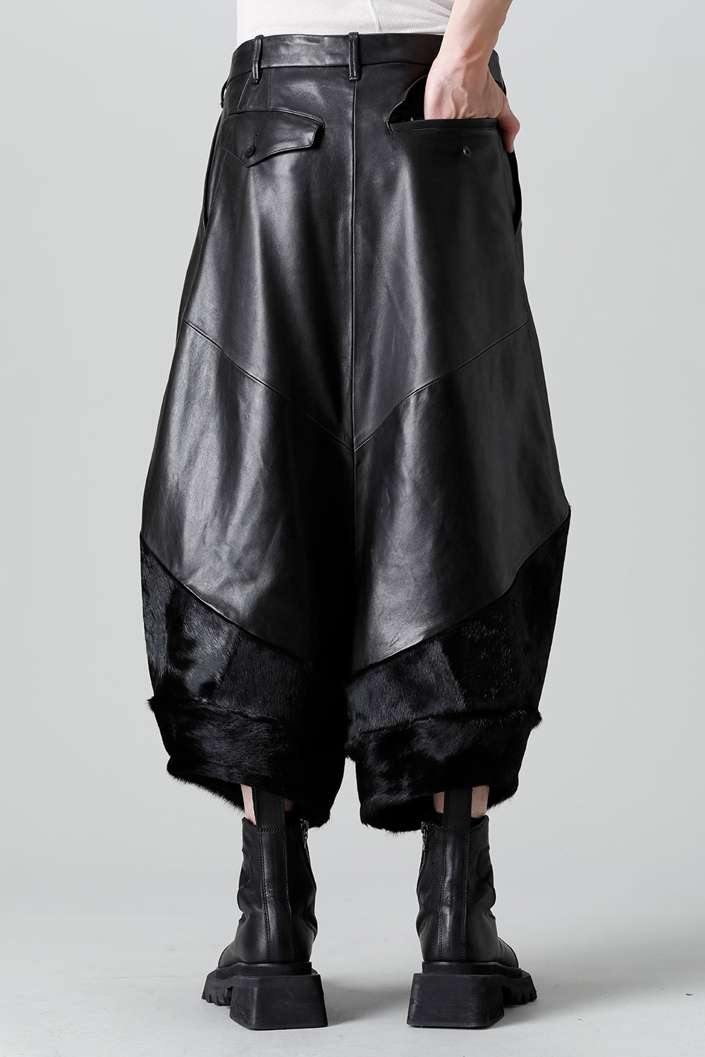 Expressing this season's collection theme [ EREBUS; ], this pants is made of lambskin and deployed with cowhair.