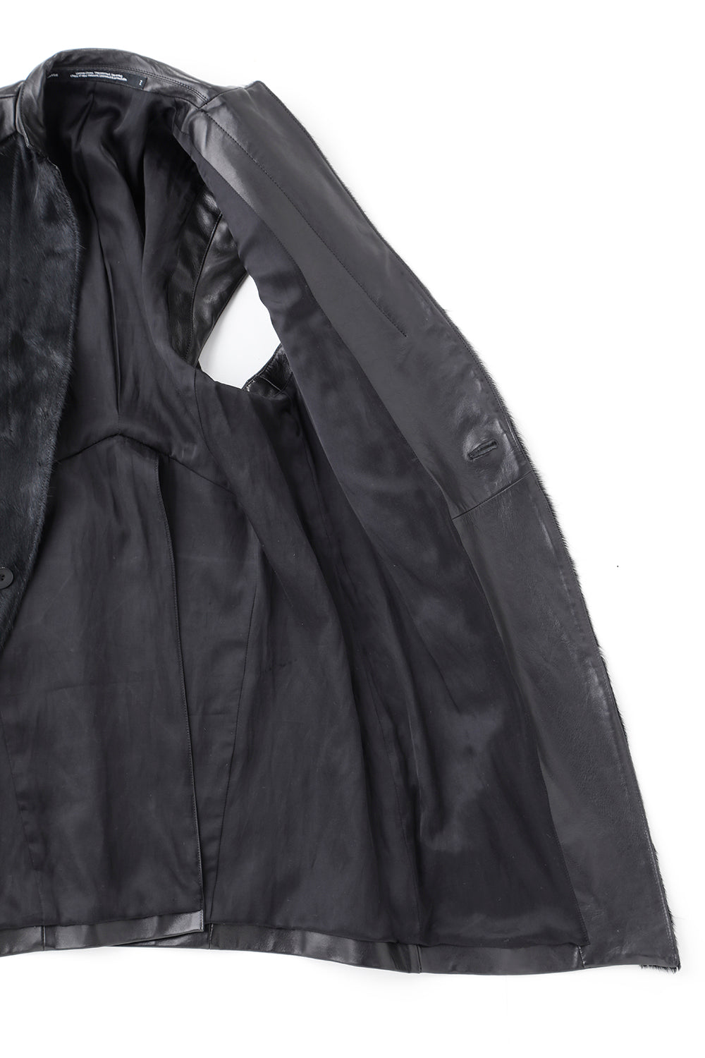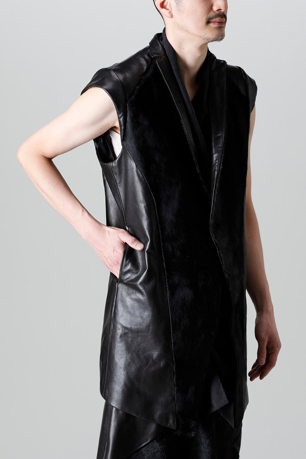 Expressing the theme of this season's collection [ EREBUS; ], this vest is made of lambskin and cowhair.