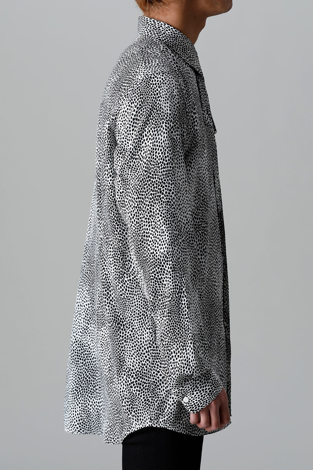 The high count thread is used to print a graphical leopard pattern on the crepe de Chine material which is characterized by its bulging and draping.