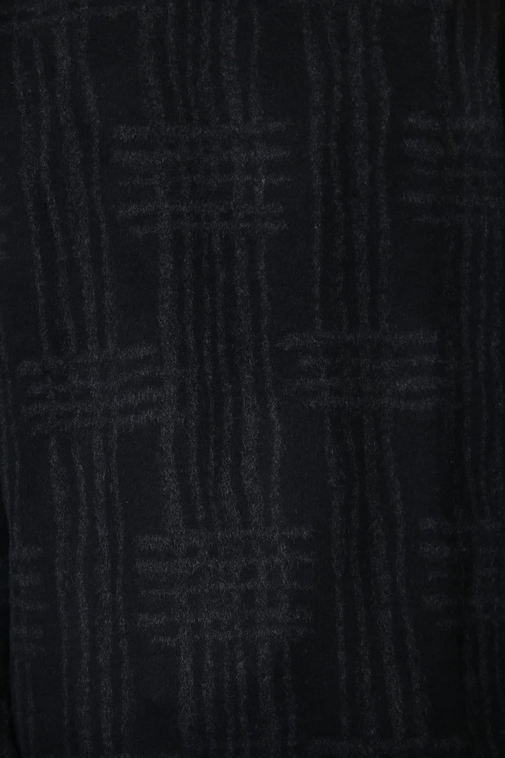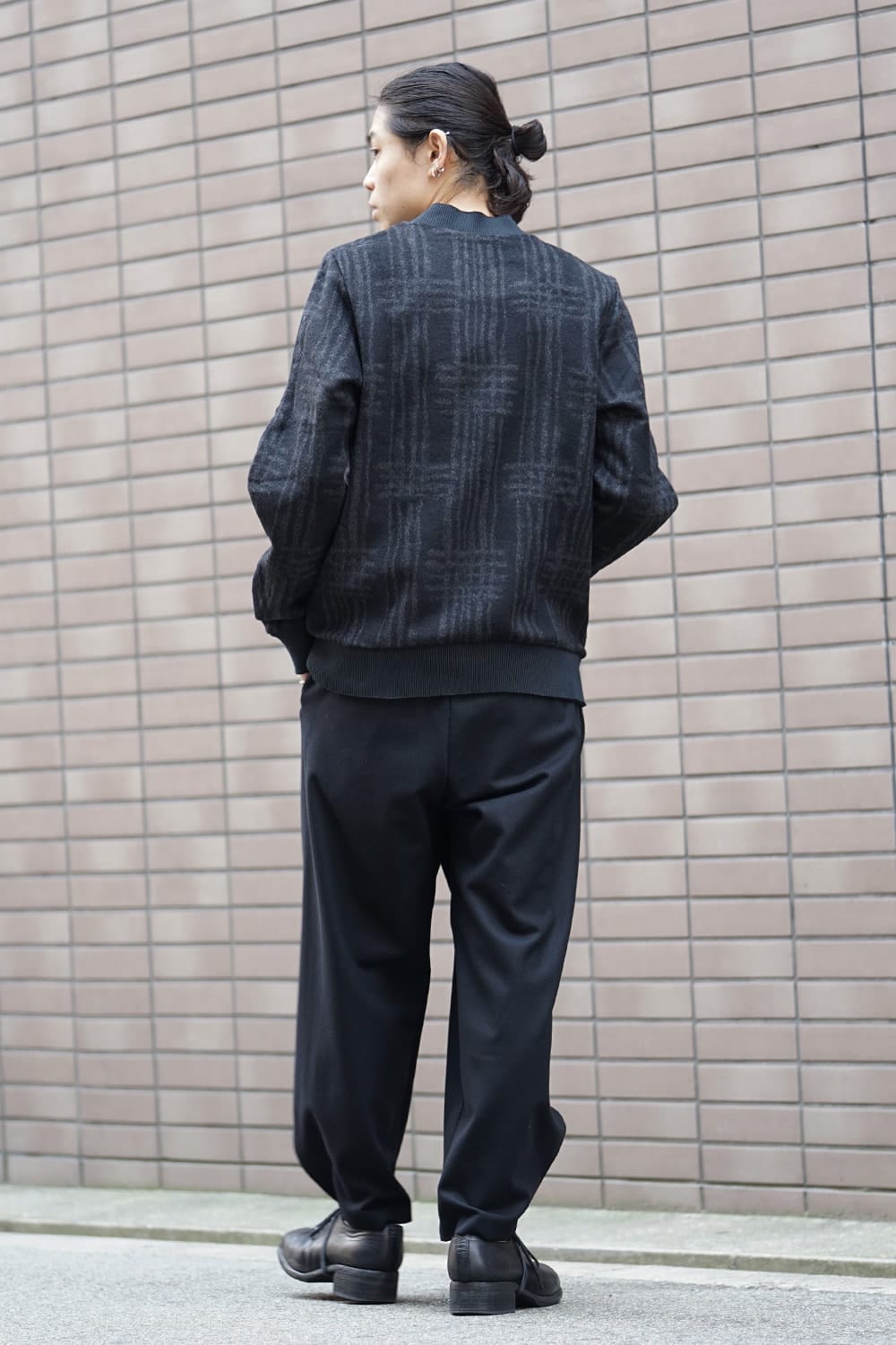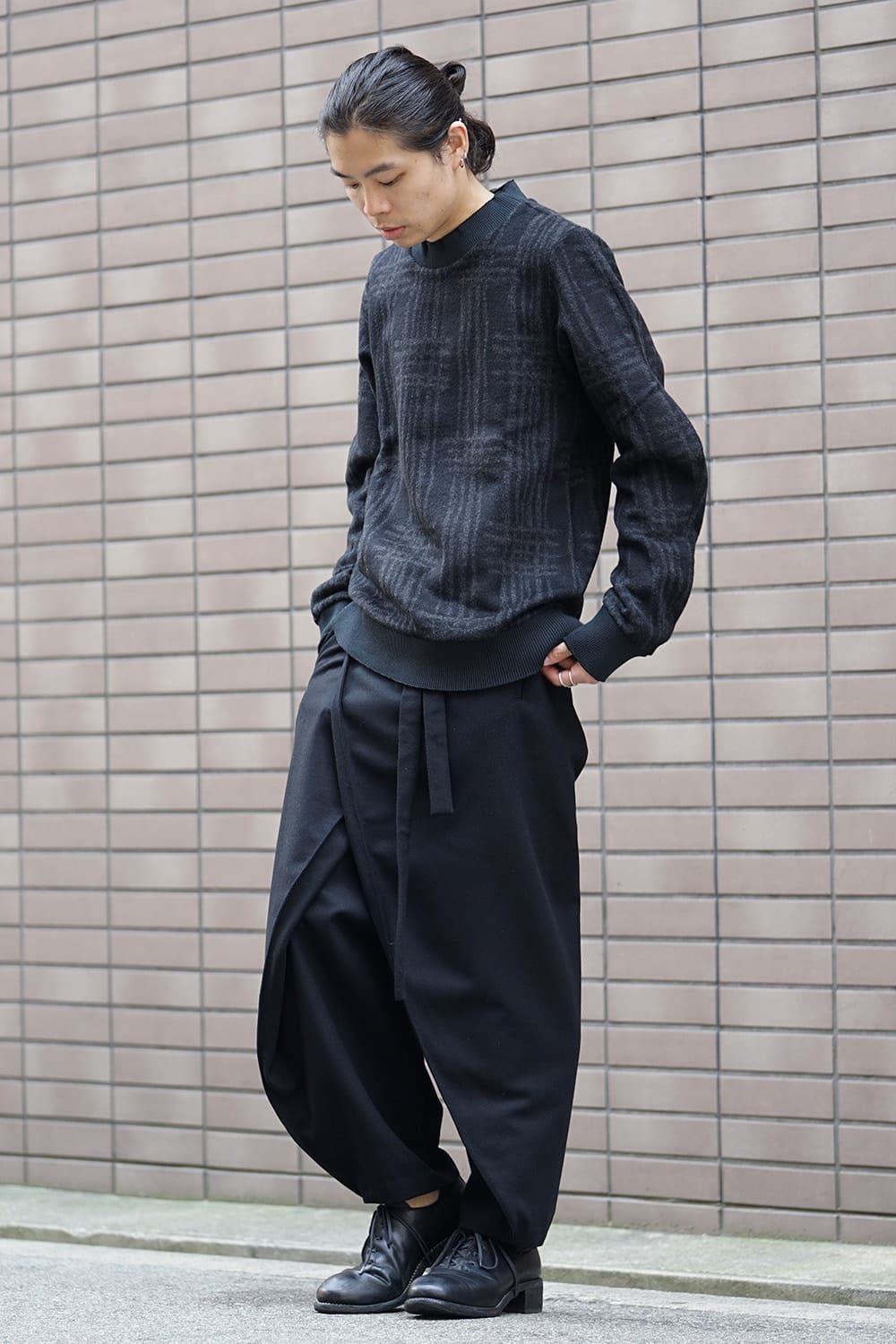 This is a pull over sweat with distorted lines drawn like handwriting, made with Jacquard woven fabric wool cashmere with beaver finish. Switching between the cuffs and hem, it has a fake layered design. There are 2 colours, navy black and gray green, this is the navy black colour.
