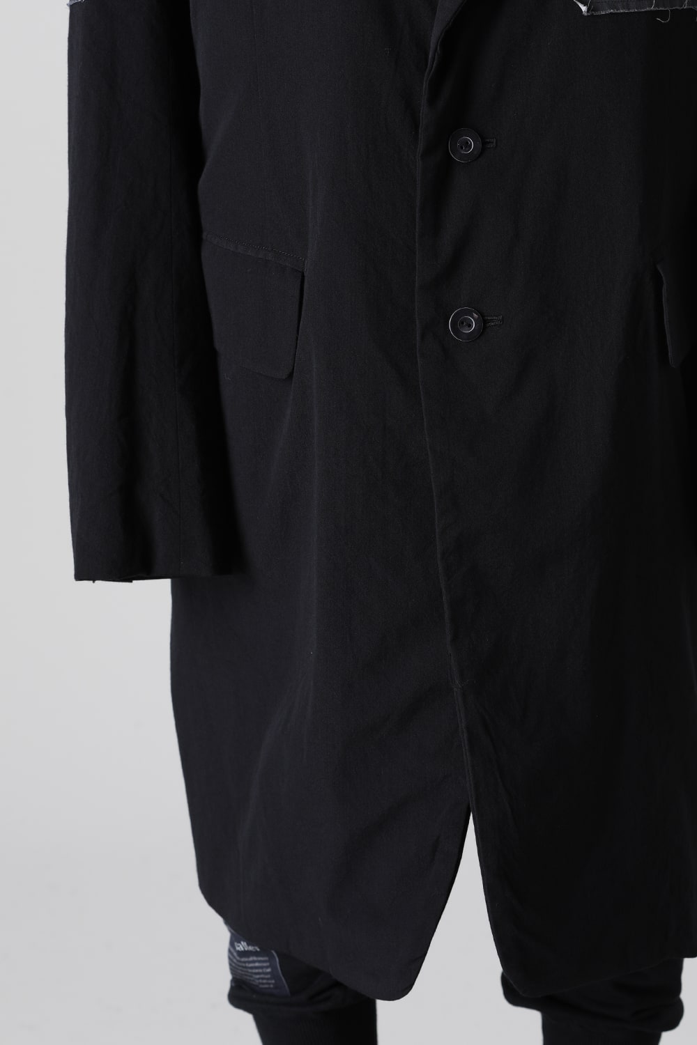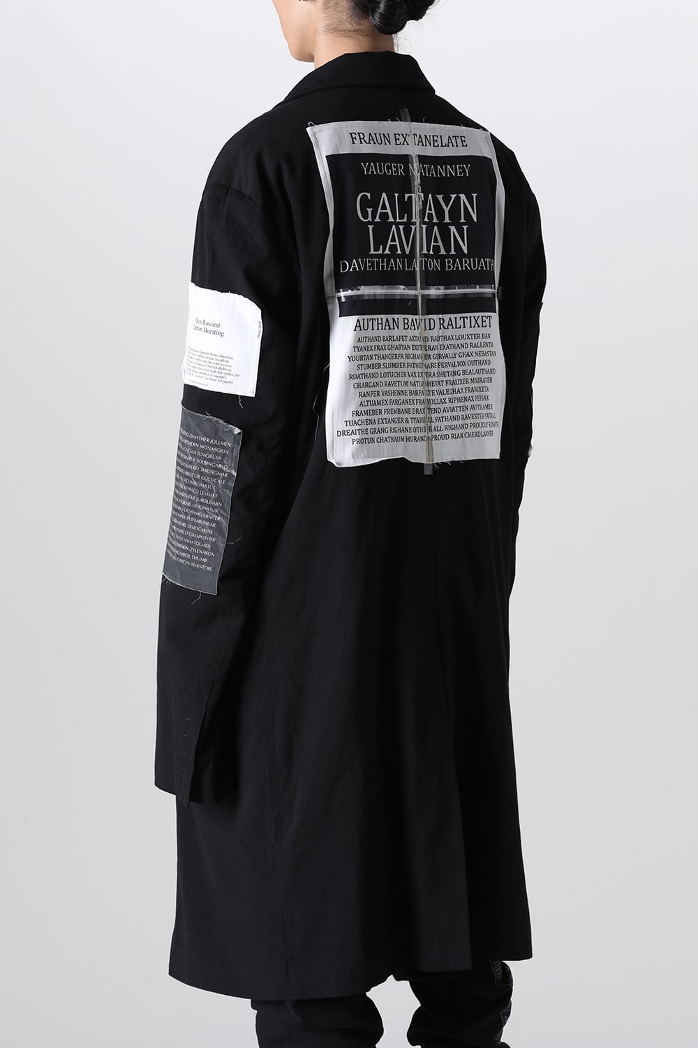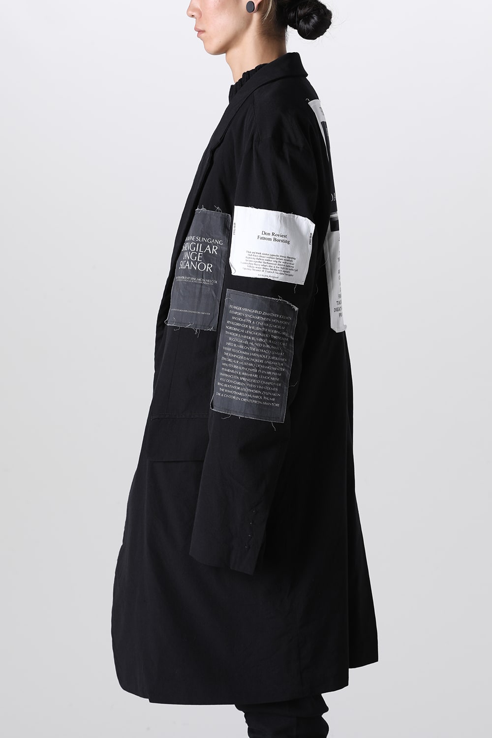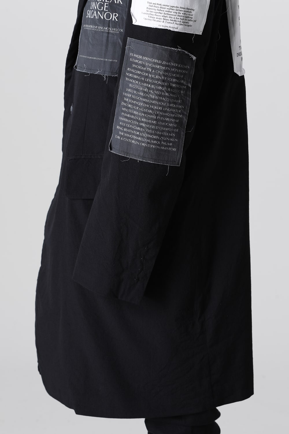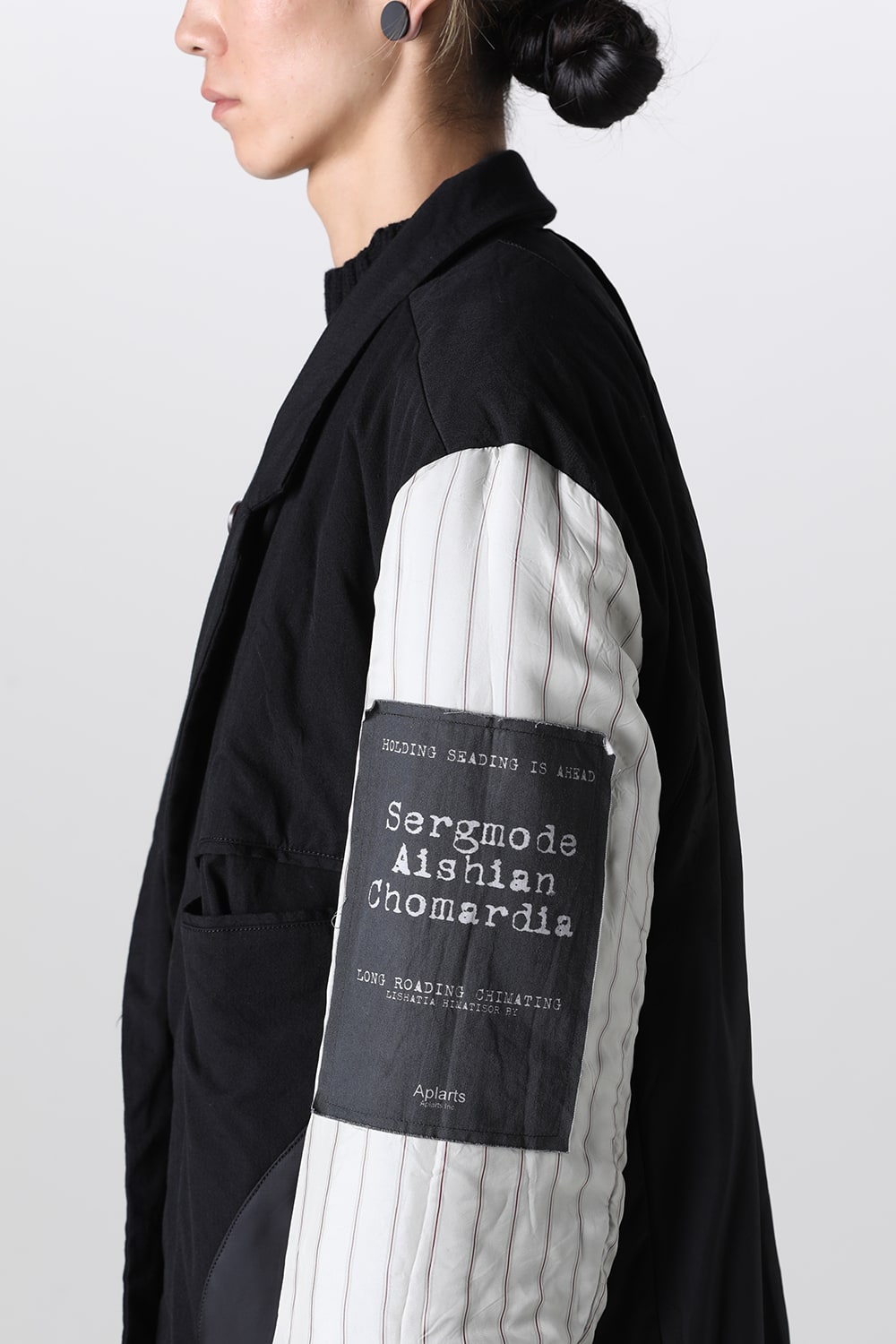 An oversized long jacket featuring the artwork of artist YUKI KAMITSUCHIBASHI from yamanami workshop. The fabric with KAMITSUCHIBASHI's artwork is sewn onto the jacket, and a processing that resembles tape is applied to the tape areas of the artwork. The oversized long jacket has a generous fit and features a striped lining on the sleeves, allowing for roll-up styling. Additionally, a printed fabric is sewn onto the lining sleeves, enabling reversible wear.