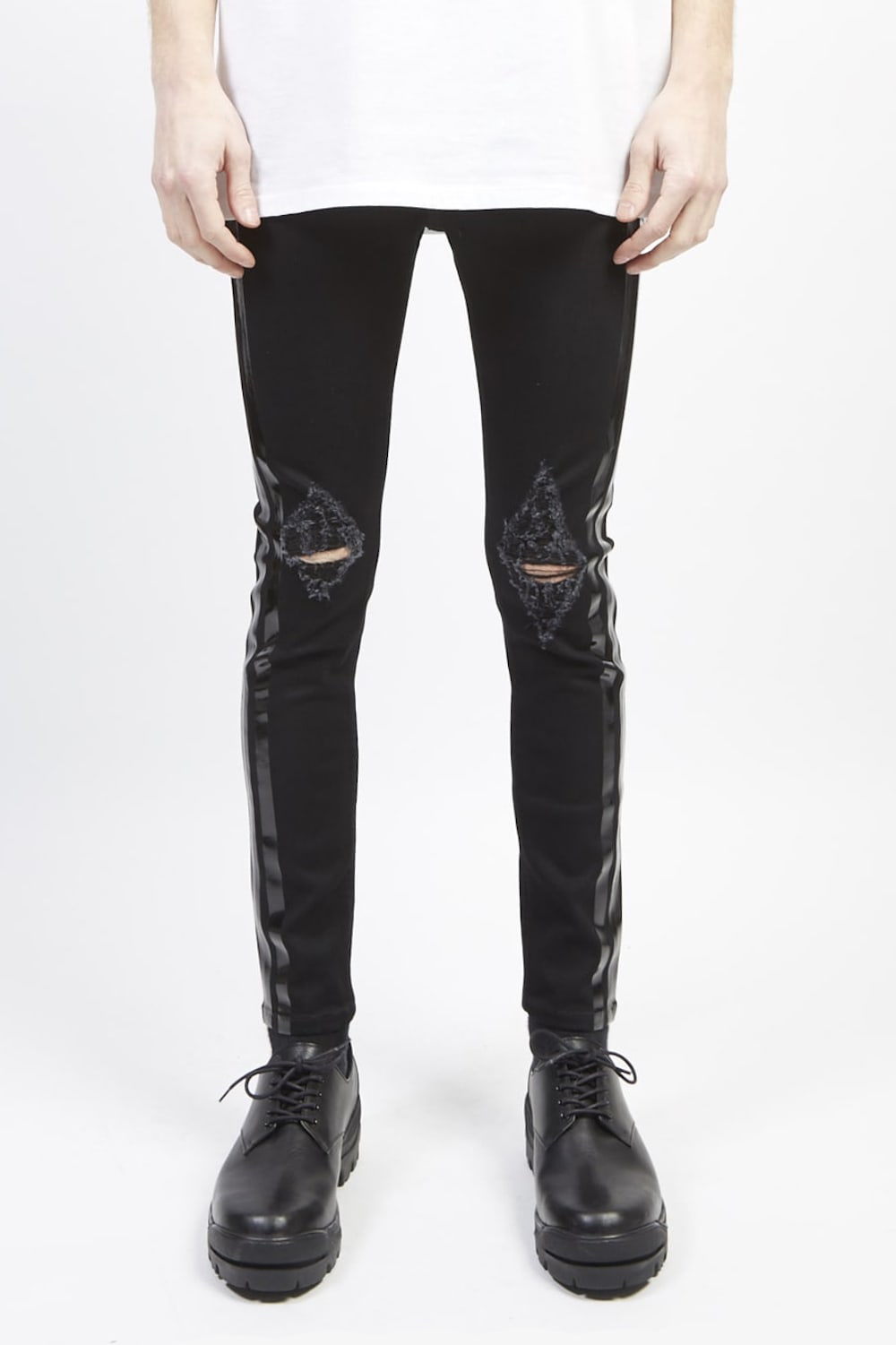 EX fit denim side line leggings pants (knee crash) Black × Black
