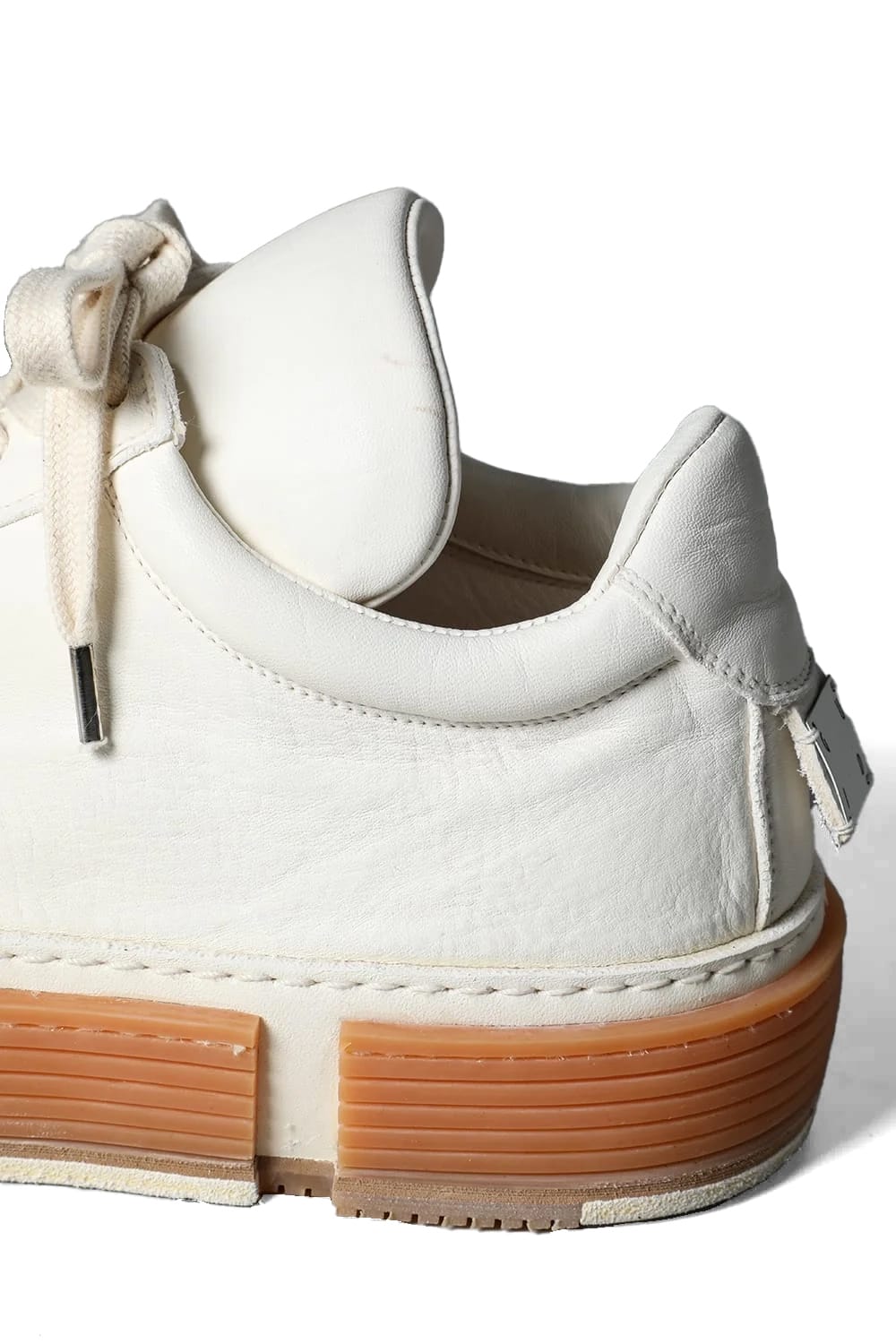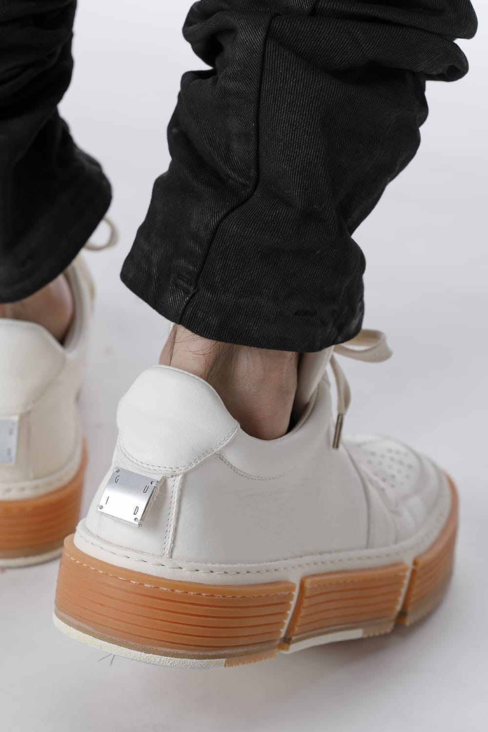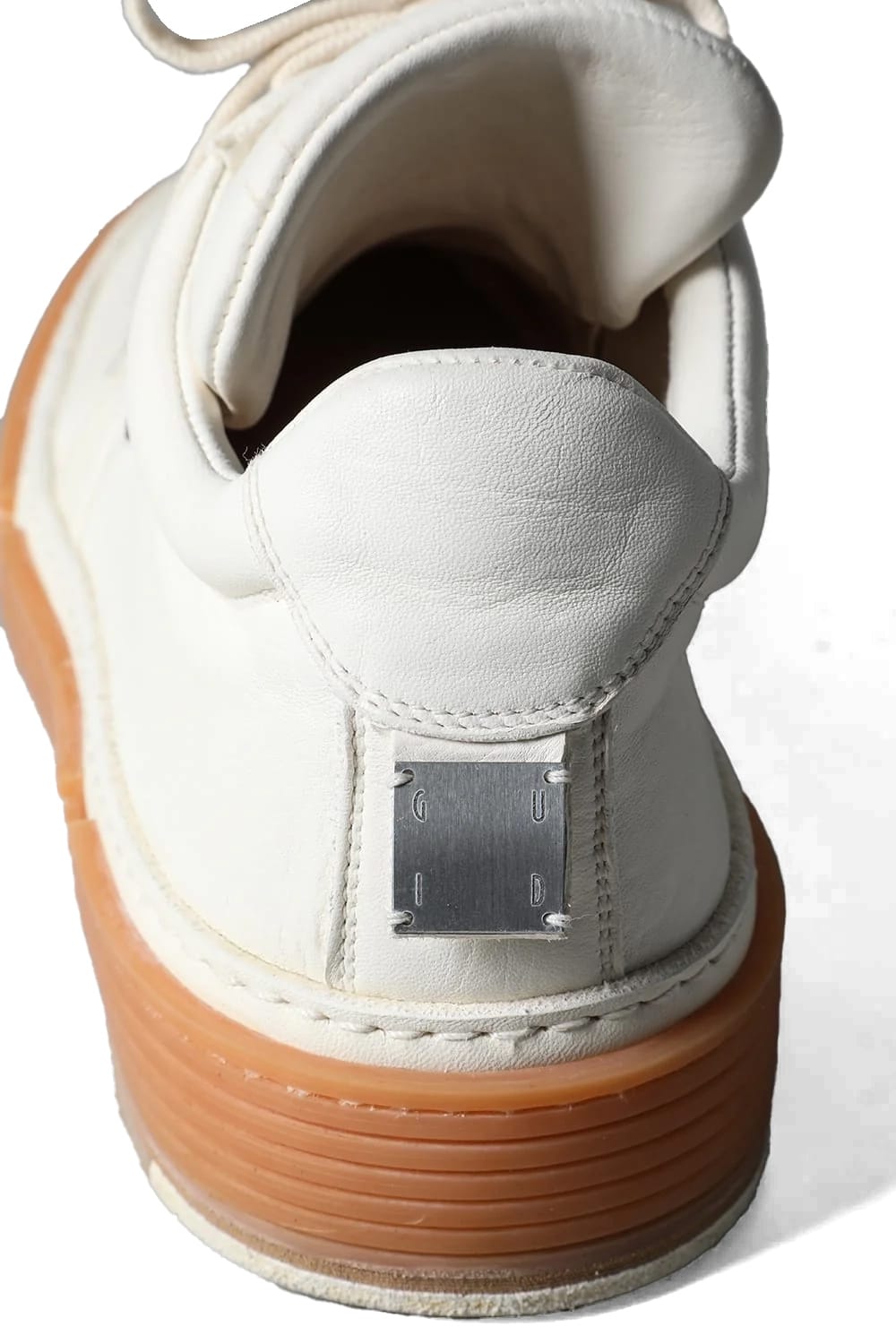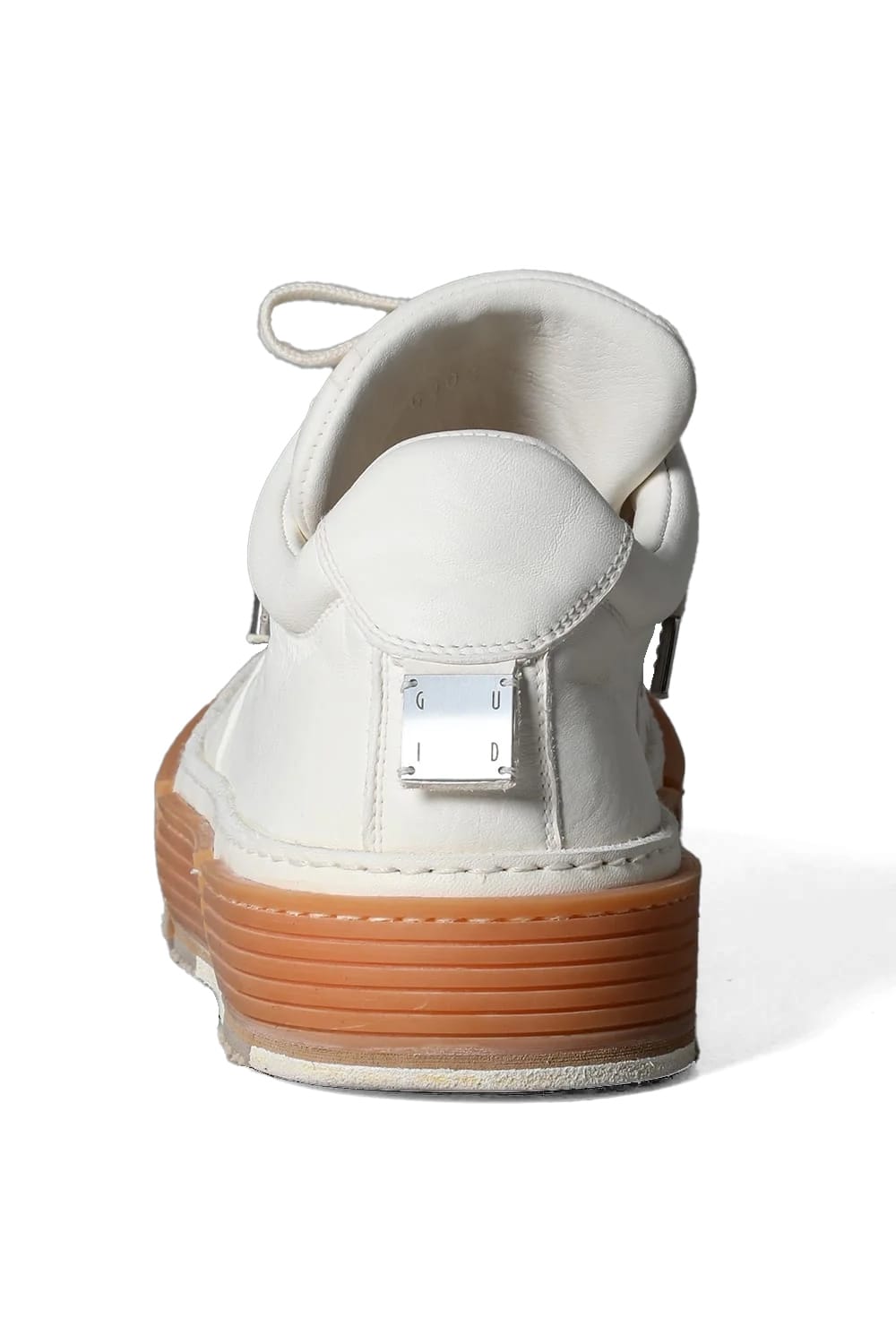 These authentic low-cut sneakers feature a round toe, perforations, and thick cotton shoelace detailing. The tongue and cuff are padded, and the insole is cushioned for improved comfort. The midsole is made of leather with rubber parts sewn in, and the soles alternate between leather and Vibram soles. A GUIDI logo plate is attached to the heel. The leather is horsehide. The shoes are made without using the tumbler-dye method (a method in which shoes are molded and then placed in a drum-like container and slowly dyed with liquid while being rotated) often used by GUIDI, so they have a taut look.