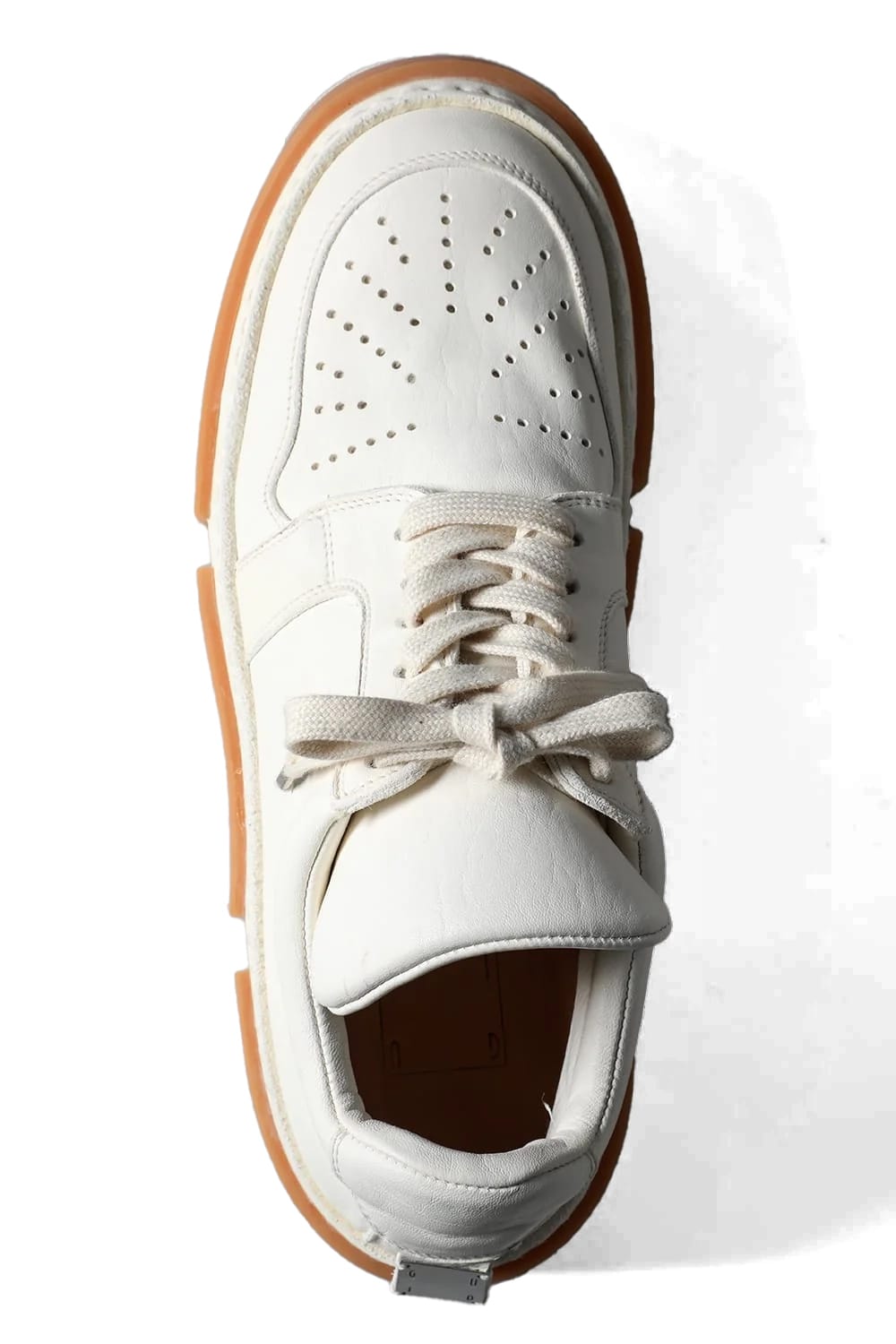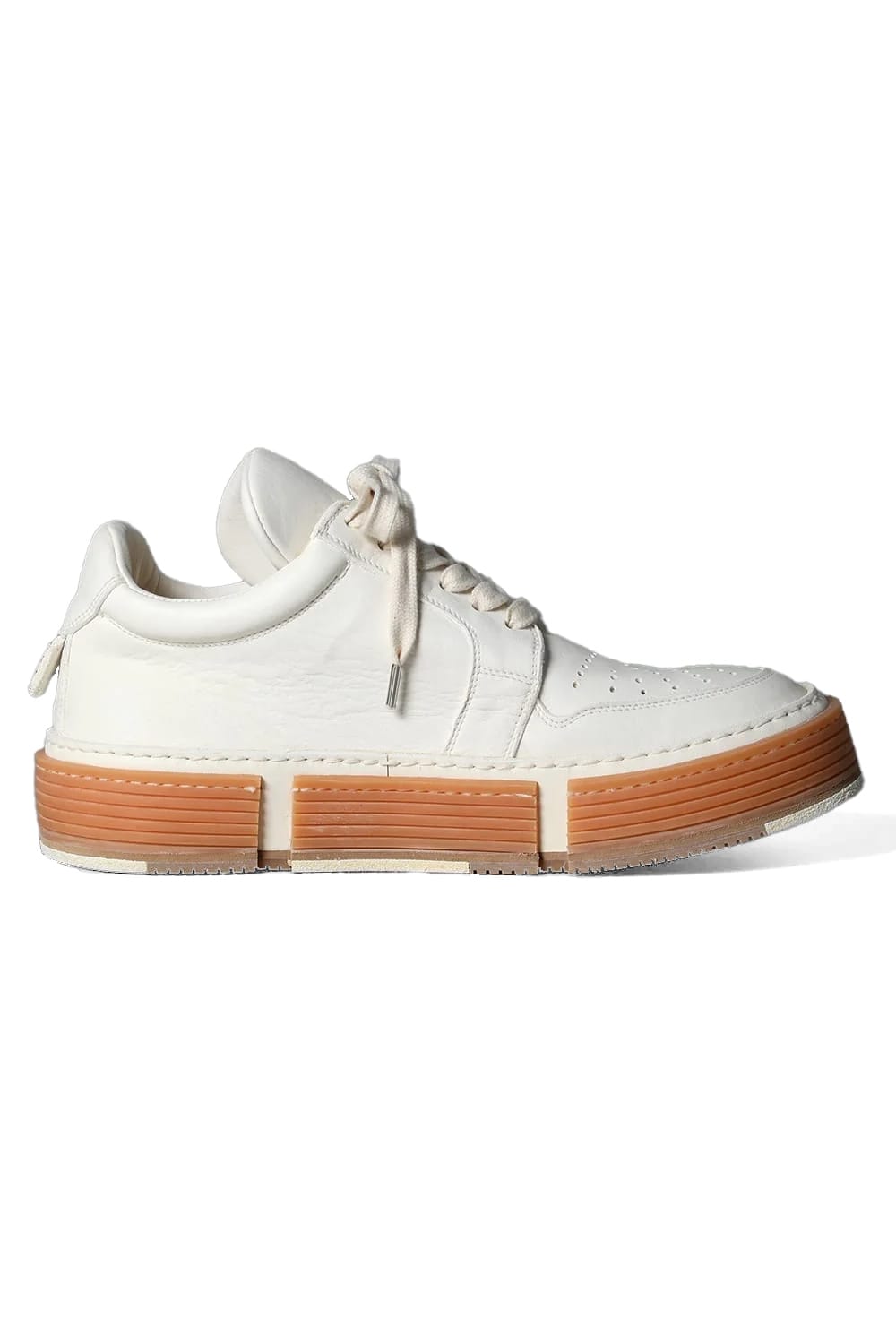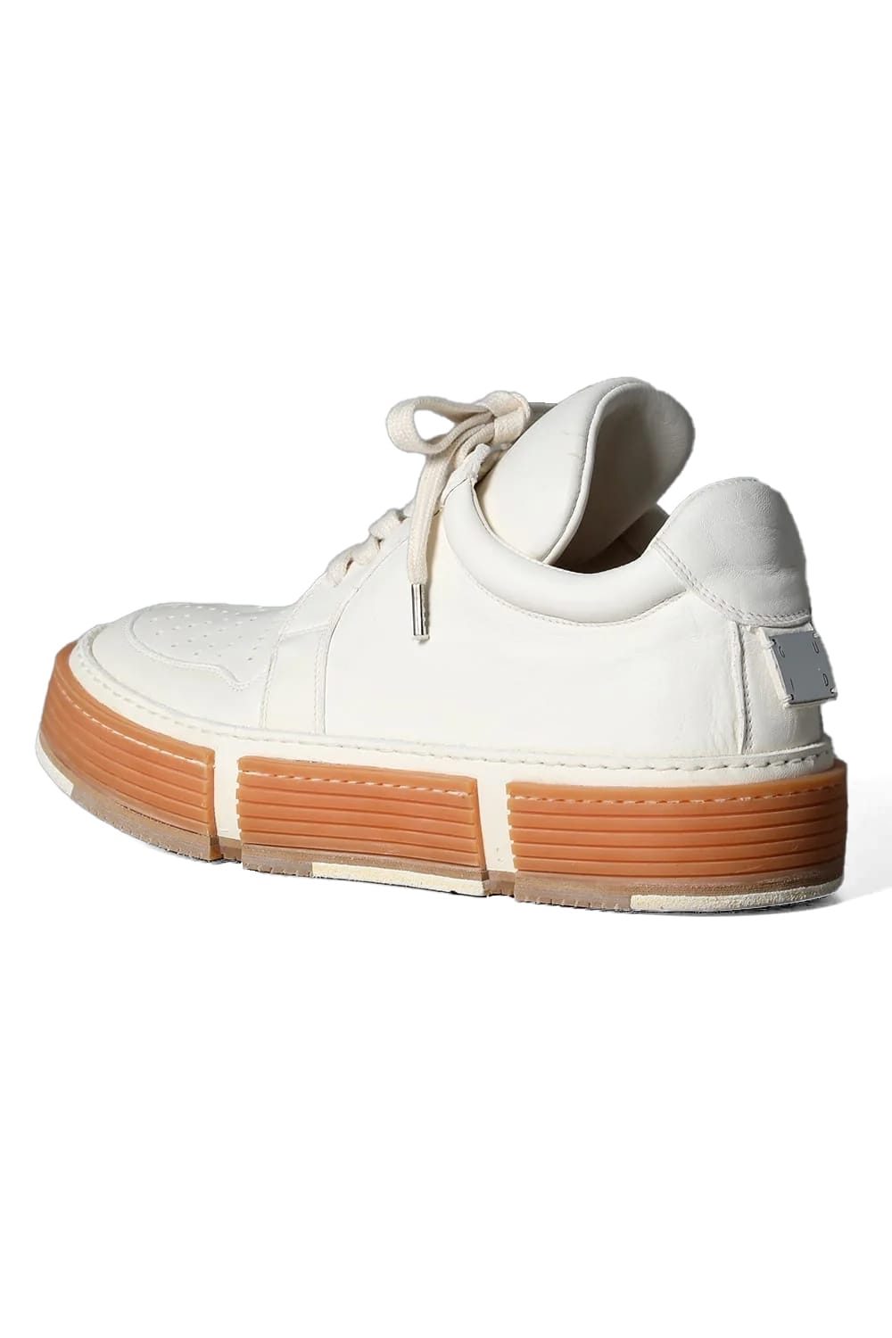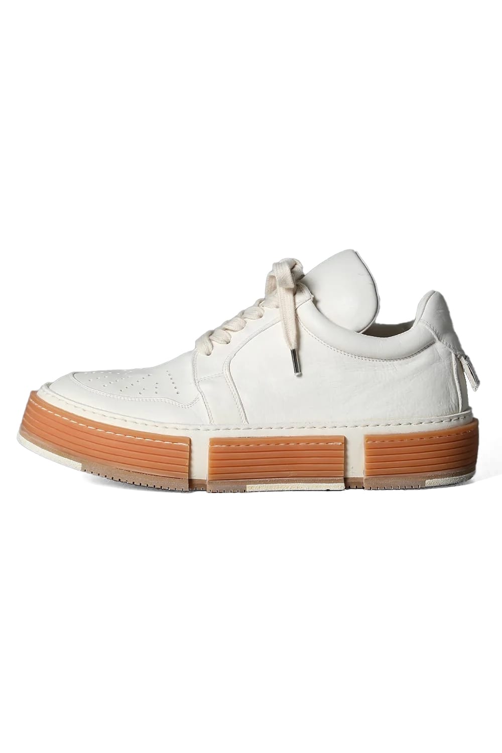 These authentic low-cut sneakers feature a round toe, perforations, and thick cotton shoelace detailing. The tongue and cuff are padded, and the insole is cushioned for improved comfort. The midsole is made of leather with rubber parts sewn in, and the soles alternate between leather and Vibram soles. A GUIDI logo plate is attached to the heel. The leather is horsehide. The shoes are made without using the tumbler-dye method (a method in which shoes are molded and then placed in a drum-like container and slowly dyed with liquid while being rotated) often used by GUIDI, so they have a taut look.