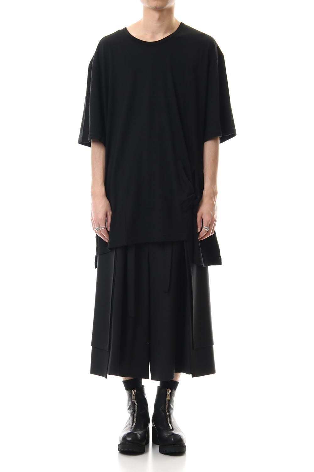 This is a pair of cropped pants with a wrapped skirt that can be adjusted with a belt on both sides.