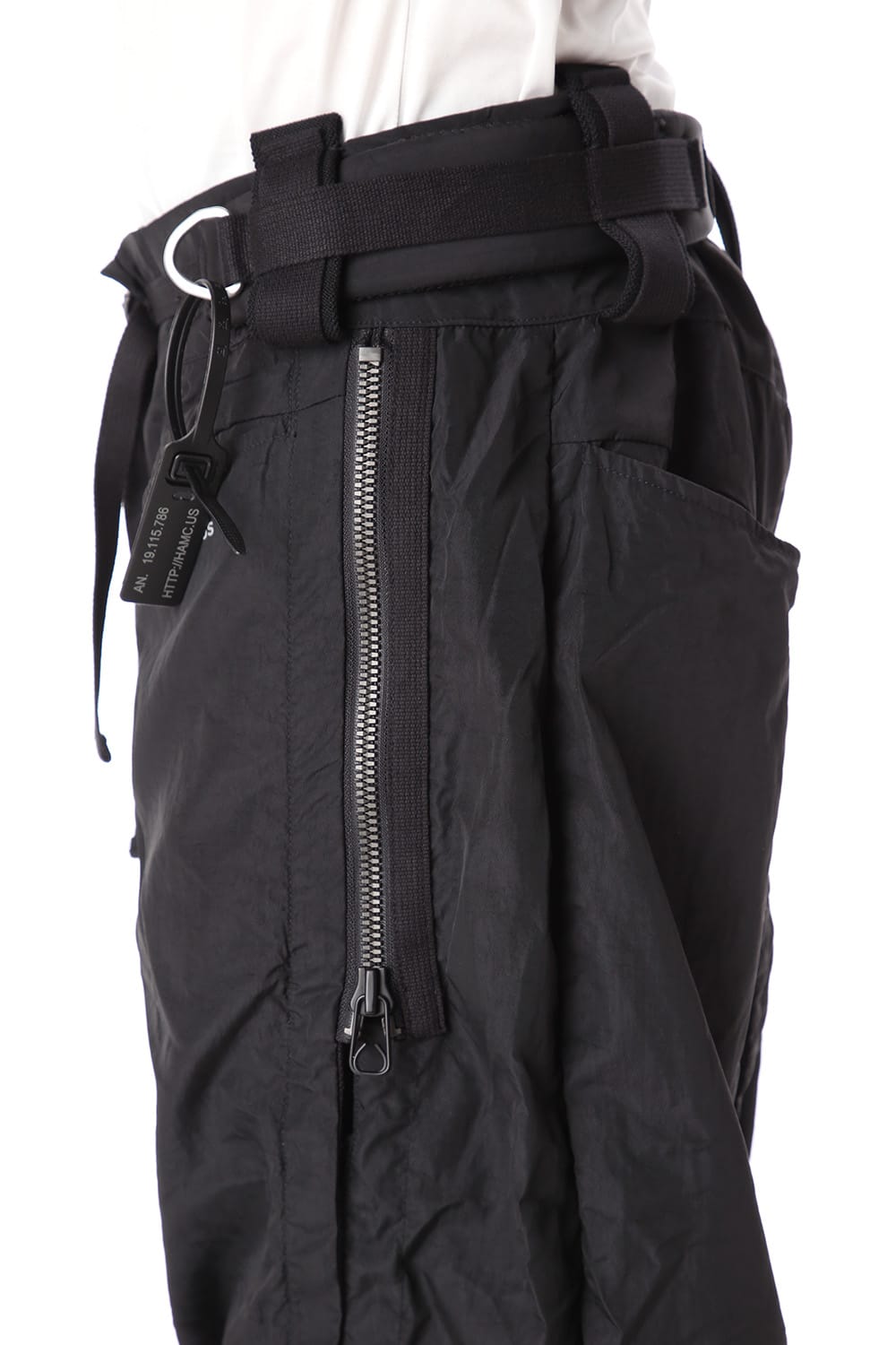 サイドのドローコードによりギャザーを寄せ、レングスを調整したり、内側に配備されたZIPの開閉によりスカートのようなシルエットへの変形も可能。