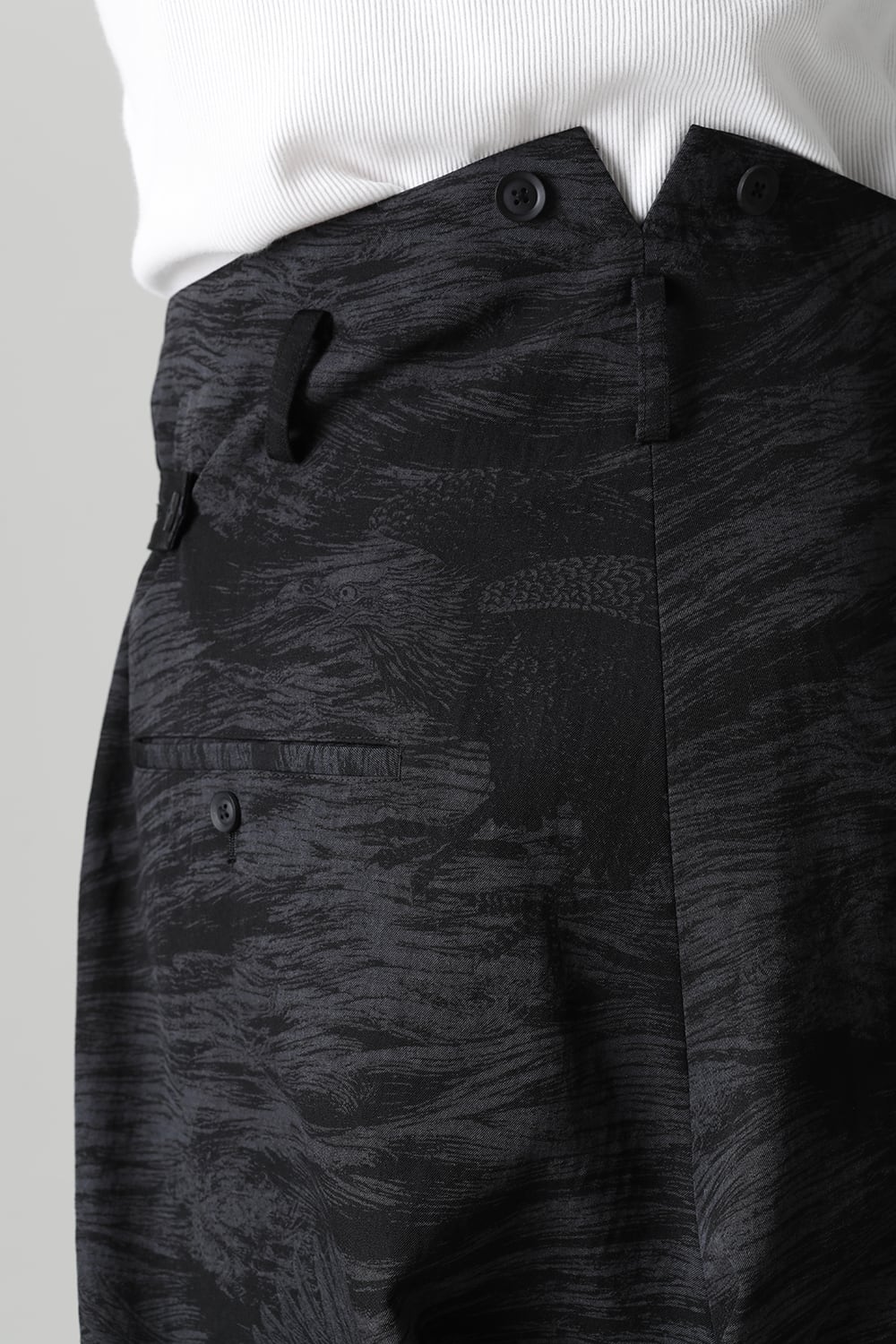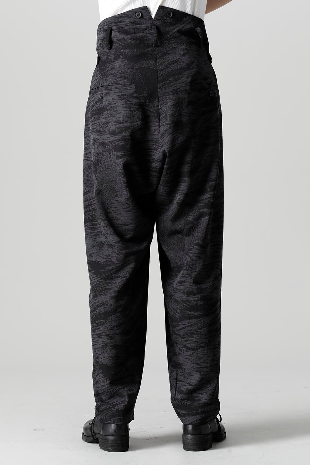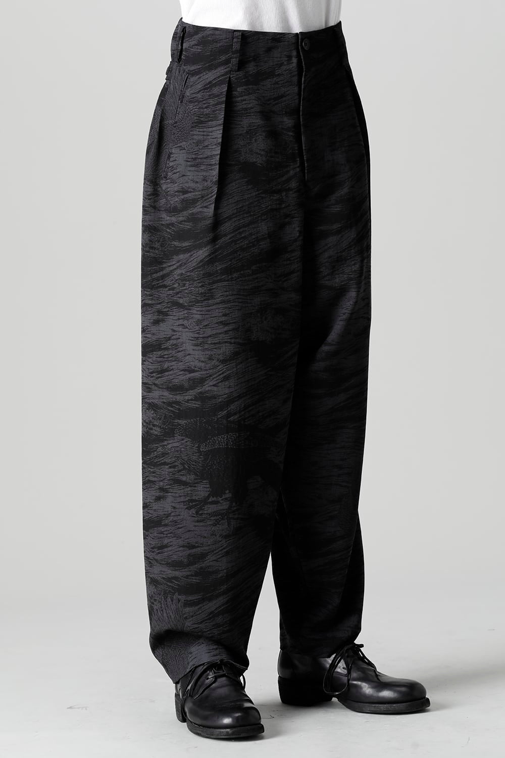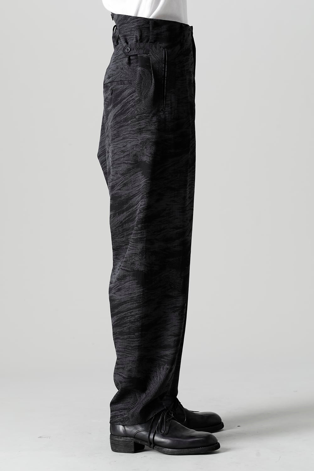 This is a beautiful Japanese modern 1 tuck trouser with a hawk motif and waves on the whole.