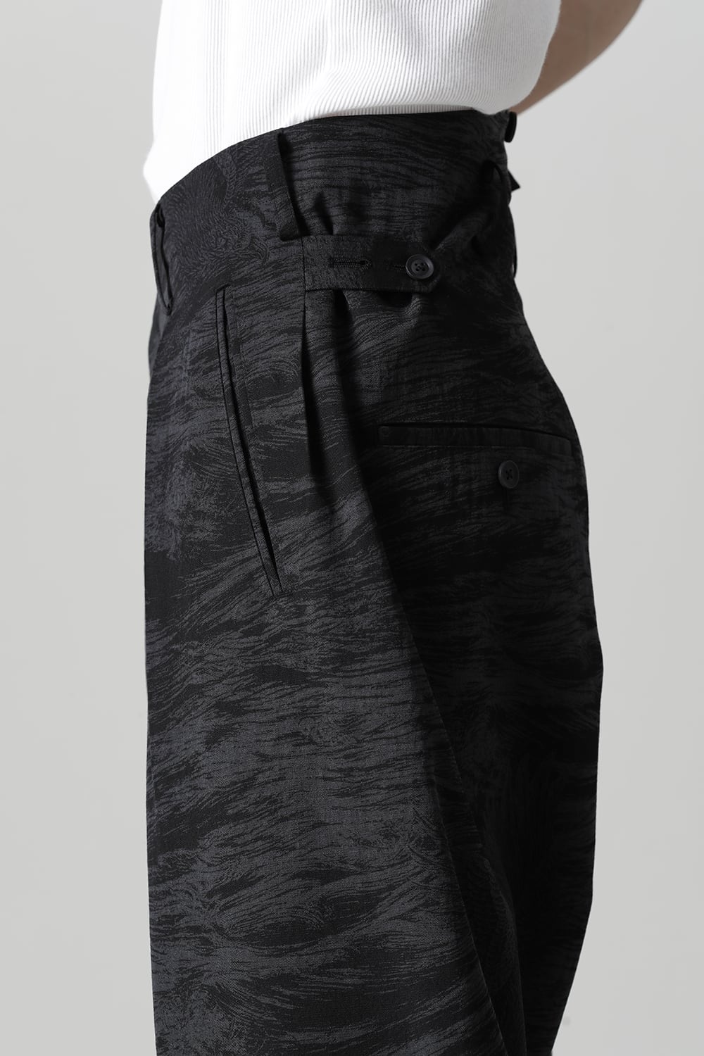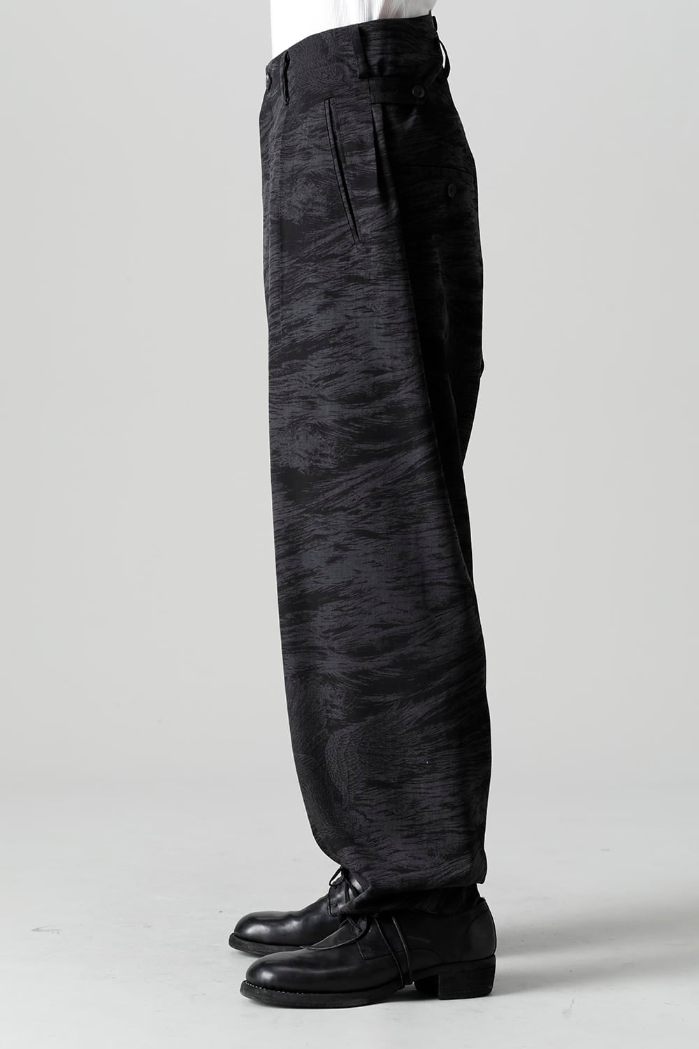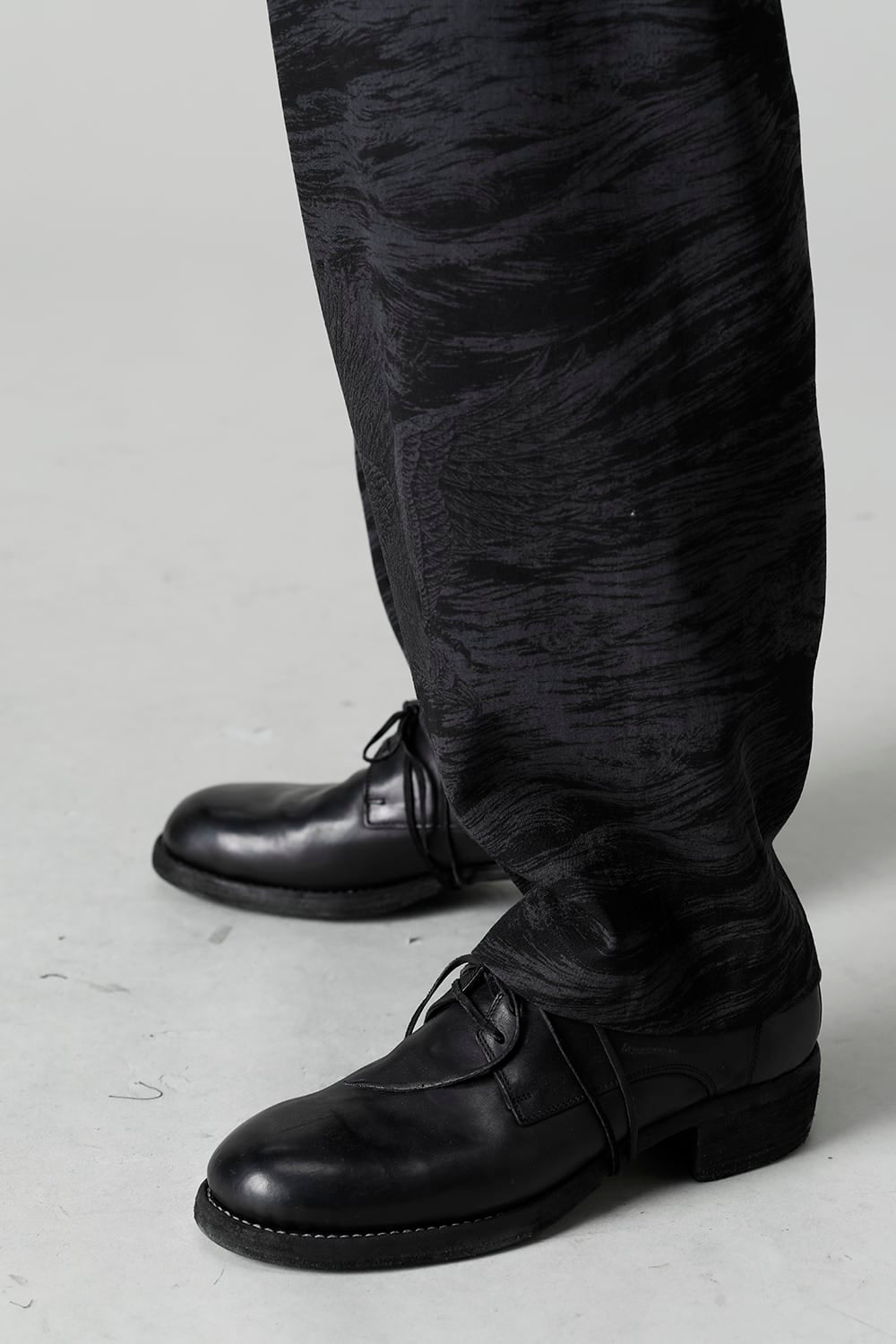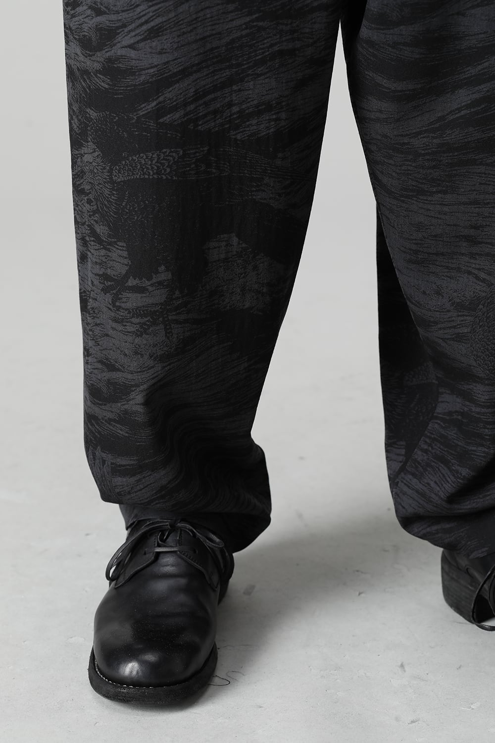 This is a beautiful Japanese modern 1 tuck trouser with a hawk motif and waves on the whole.
