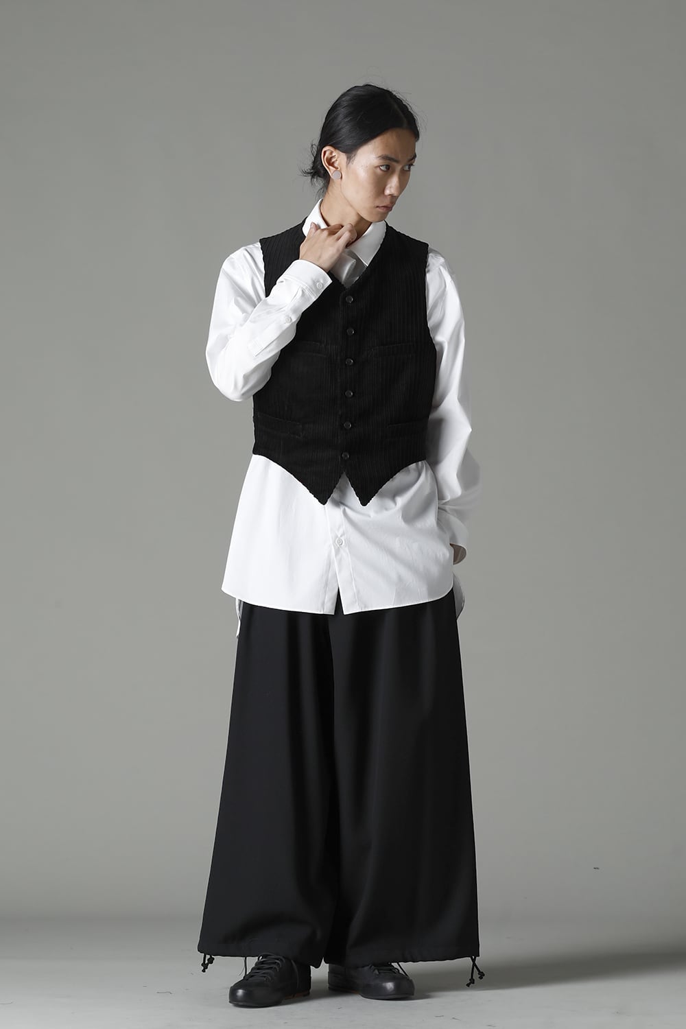 这是一款在系列的LOOK 12中穿着的灯芯绒单背心。 使用了经过水洗处理的粗条灯芯绒面料,表现出极具立体感的视觉效果。 稍短的后身设计的裁剪长度,前面有着锐利的变形剪裁。 这款单品的衬里采用了较多的衬里设计,使衬里的条纹面料可以露在外面。