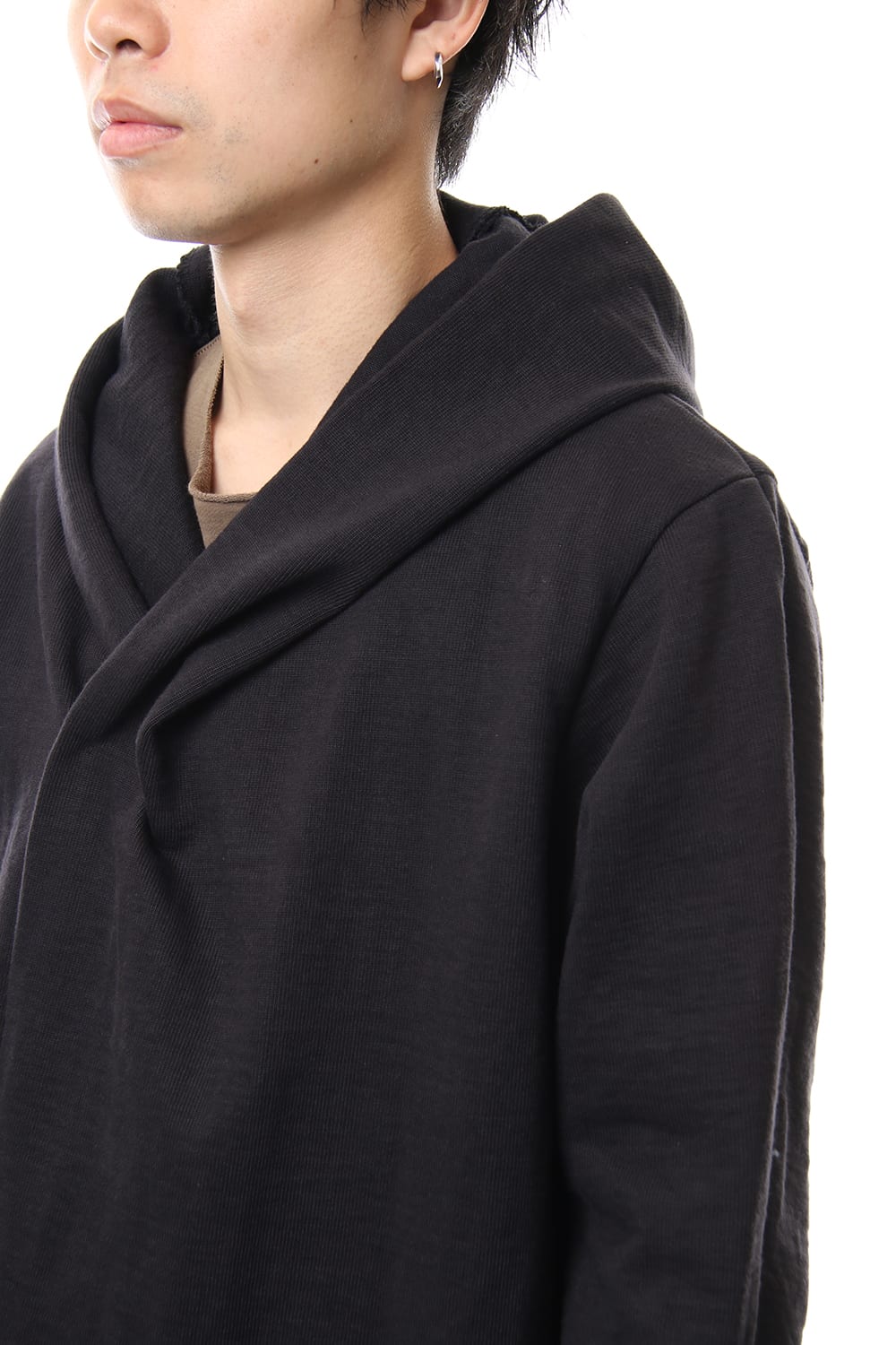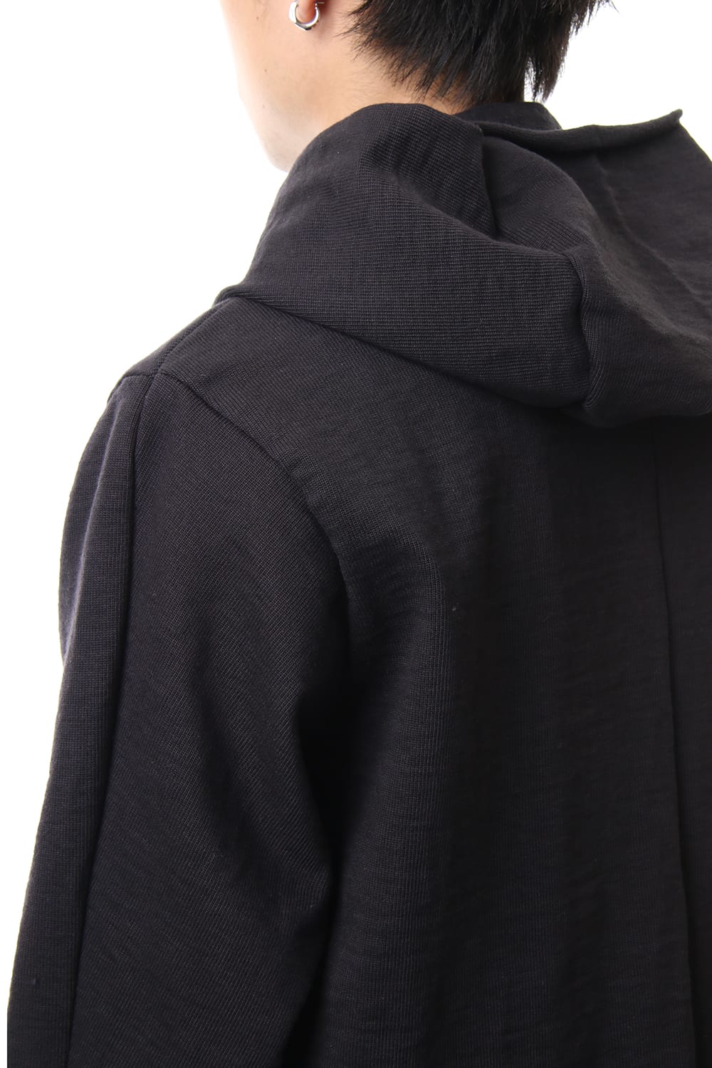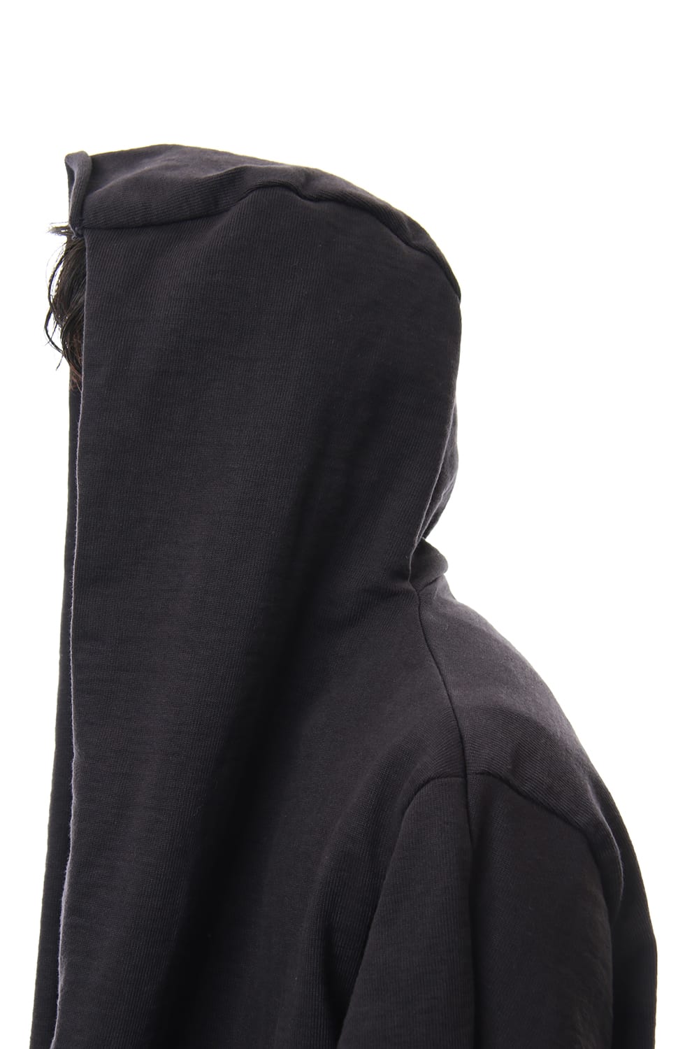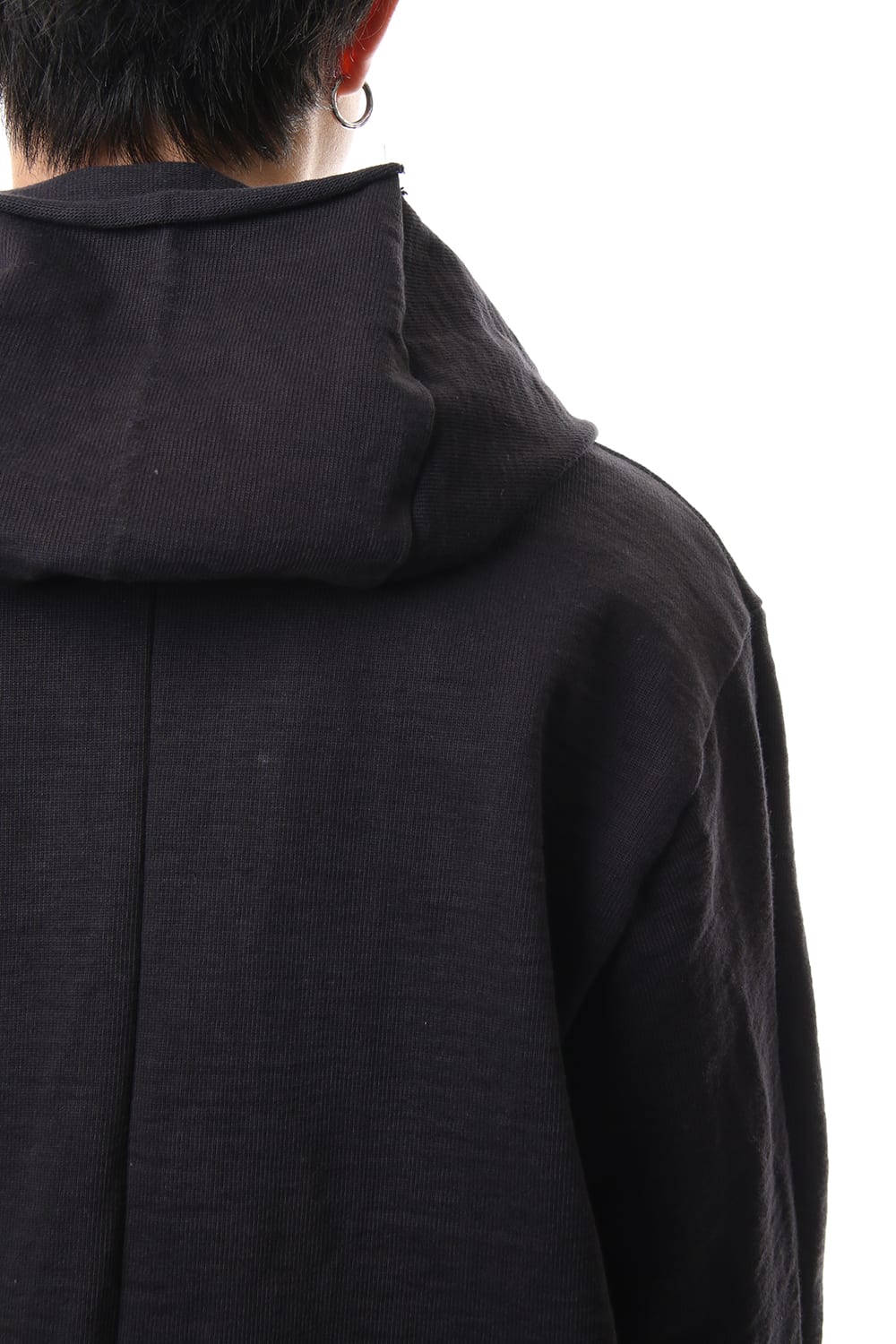 A hood jacket with a unique drape and hood volume. This item has a simple and versatile design that can be used daily with two hooks attached to the front. You can enjoy the change over the years with this tough and heavy jersey that is used in overseas Artisan brands. This item has a rough silhouette and can be worn outside of midsummer depending on the inner wear. Available in 2 colours: [Carbon] and [Black].