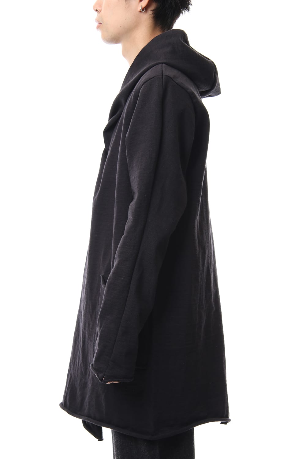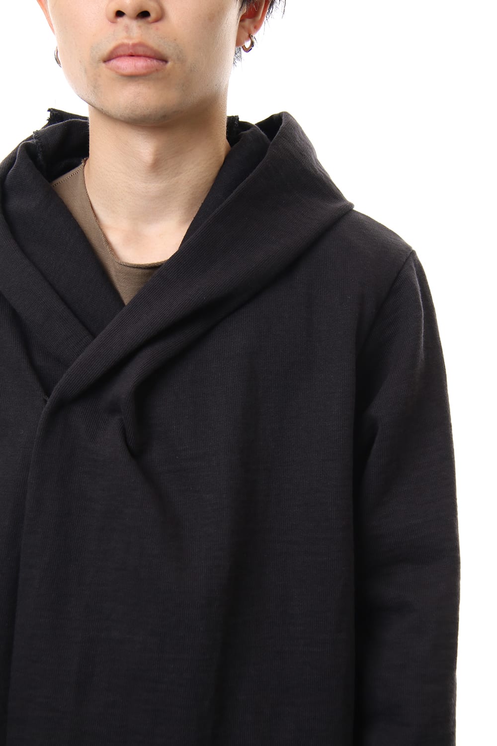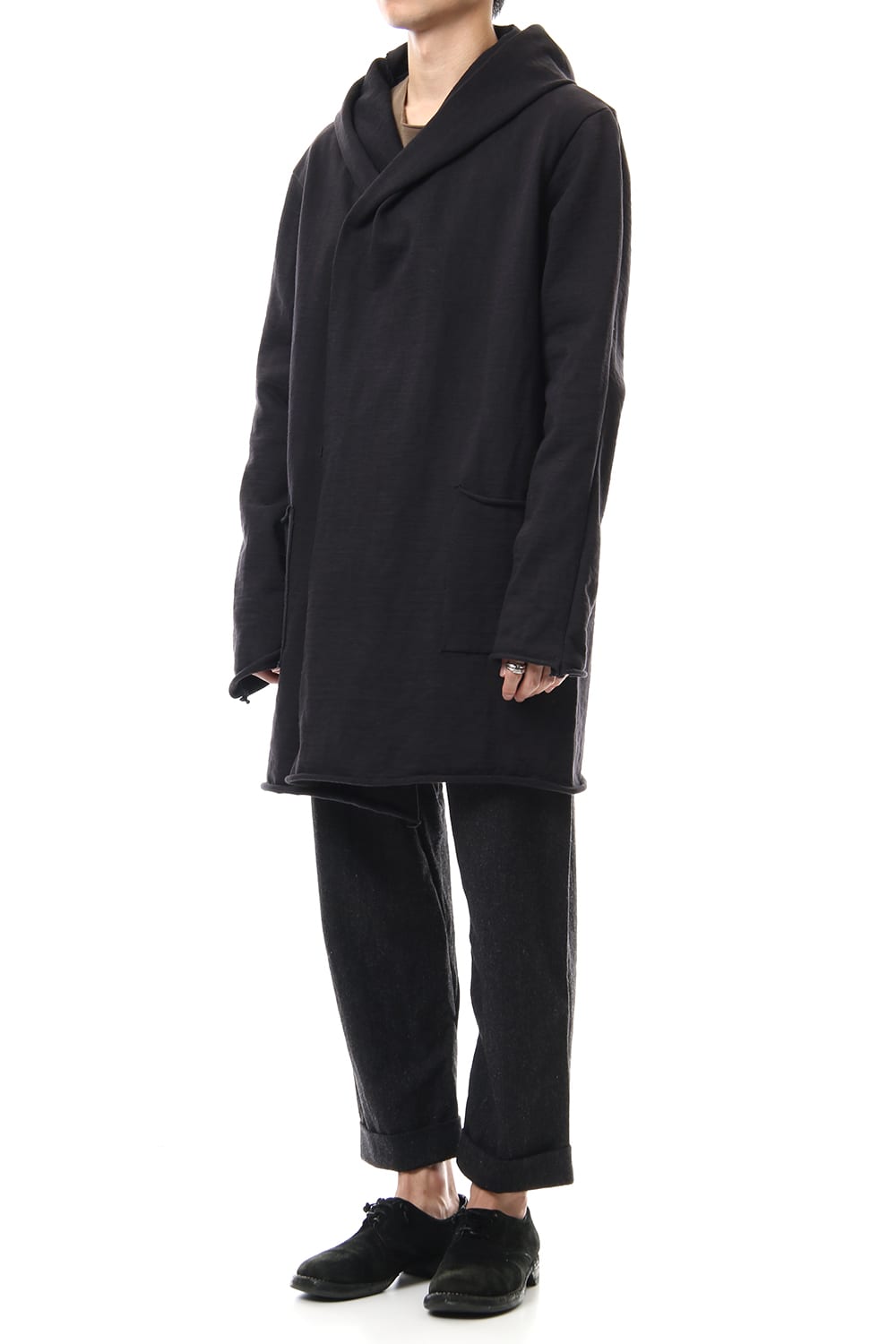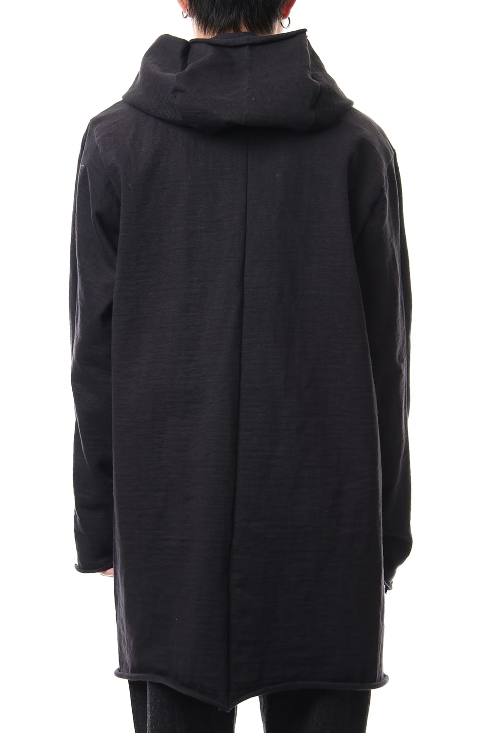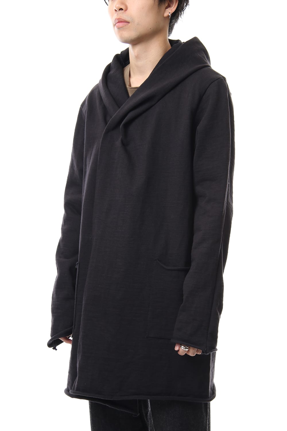 A hood jacket with a unique drape and hood volume. This item has a simple and versatile design that can be used daily with two hooks attached to the front. You can enjoy the change over the years with this tough and heavy jersey that is used in overseas Artisan brands. This item has a rough silhouette and can be worn outside of midsummer depending on the inner wear. Available in 2 colours: [Carbon] and [Black].