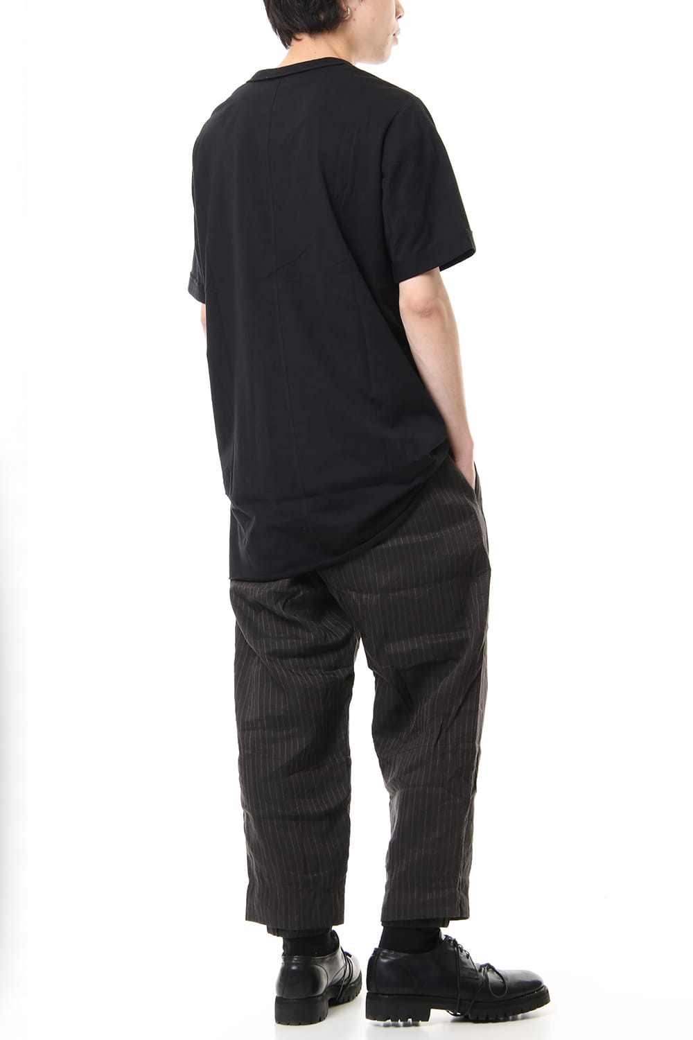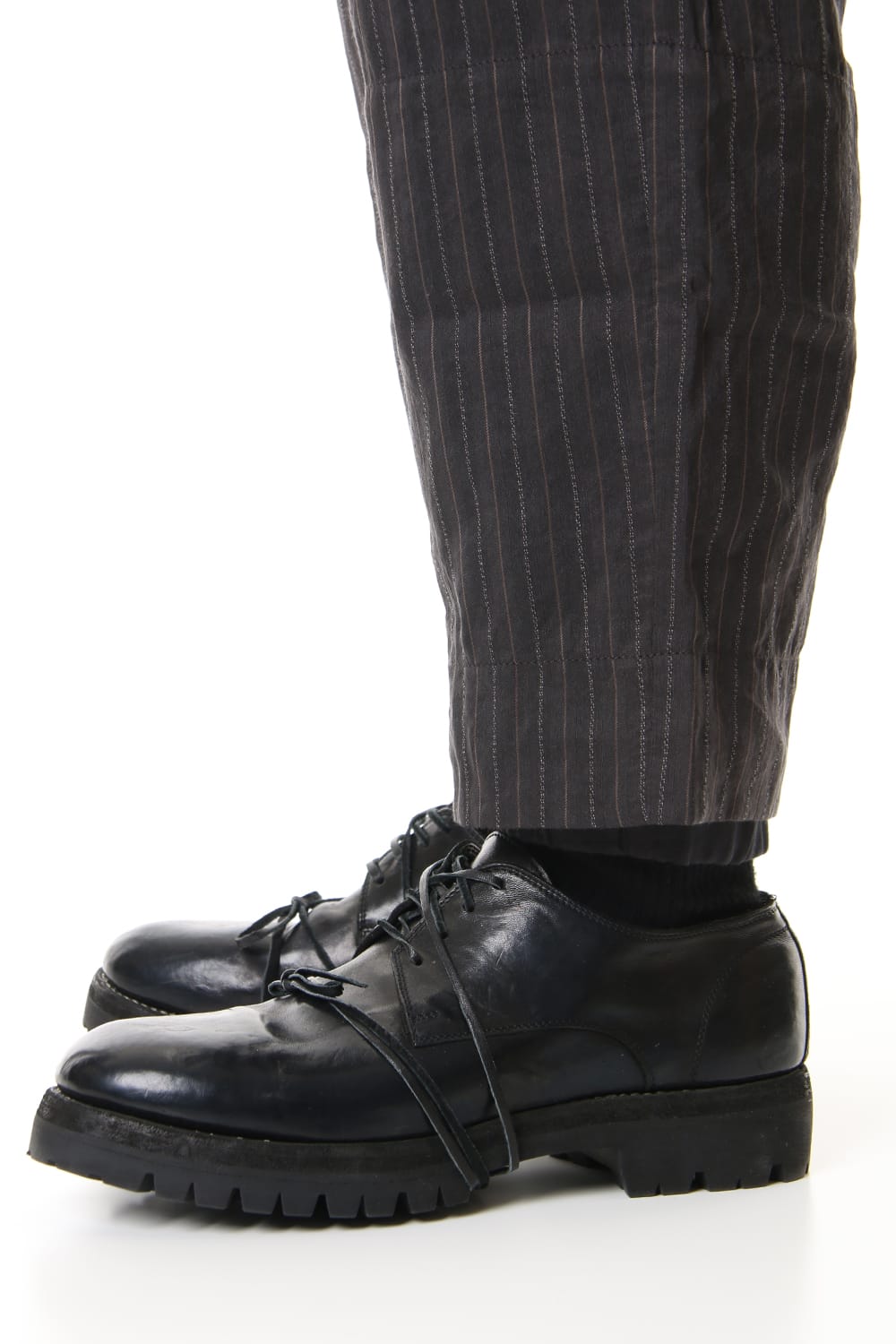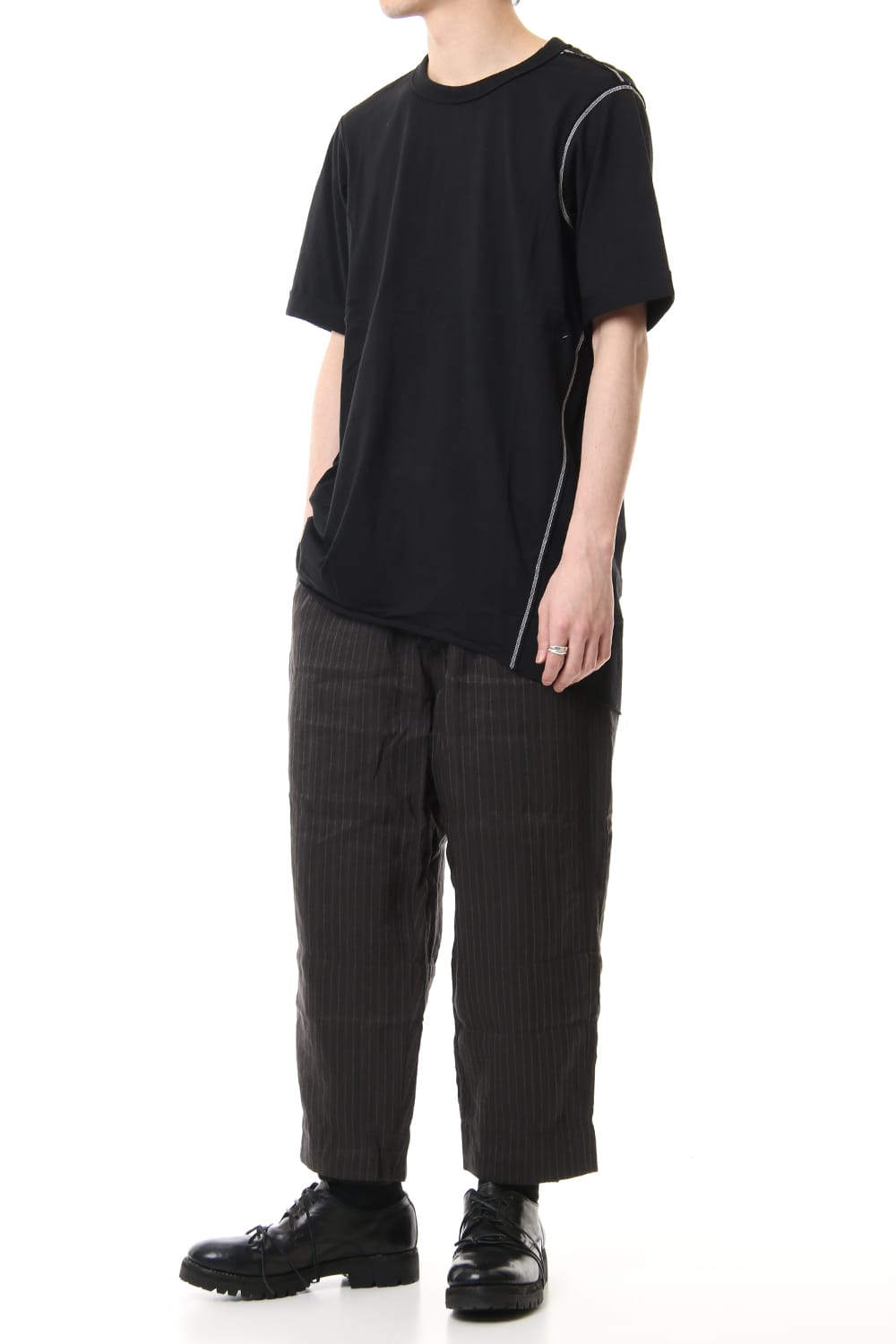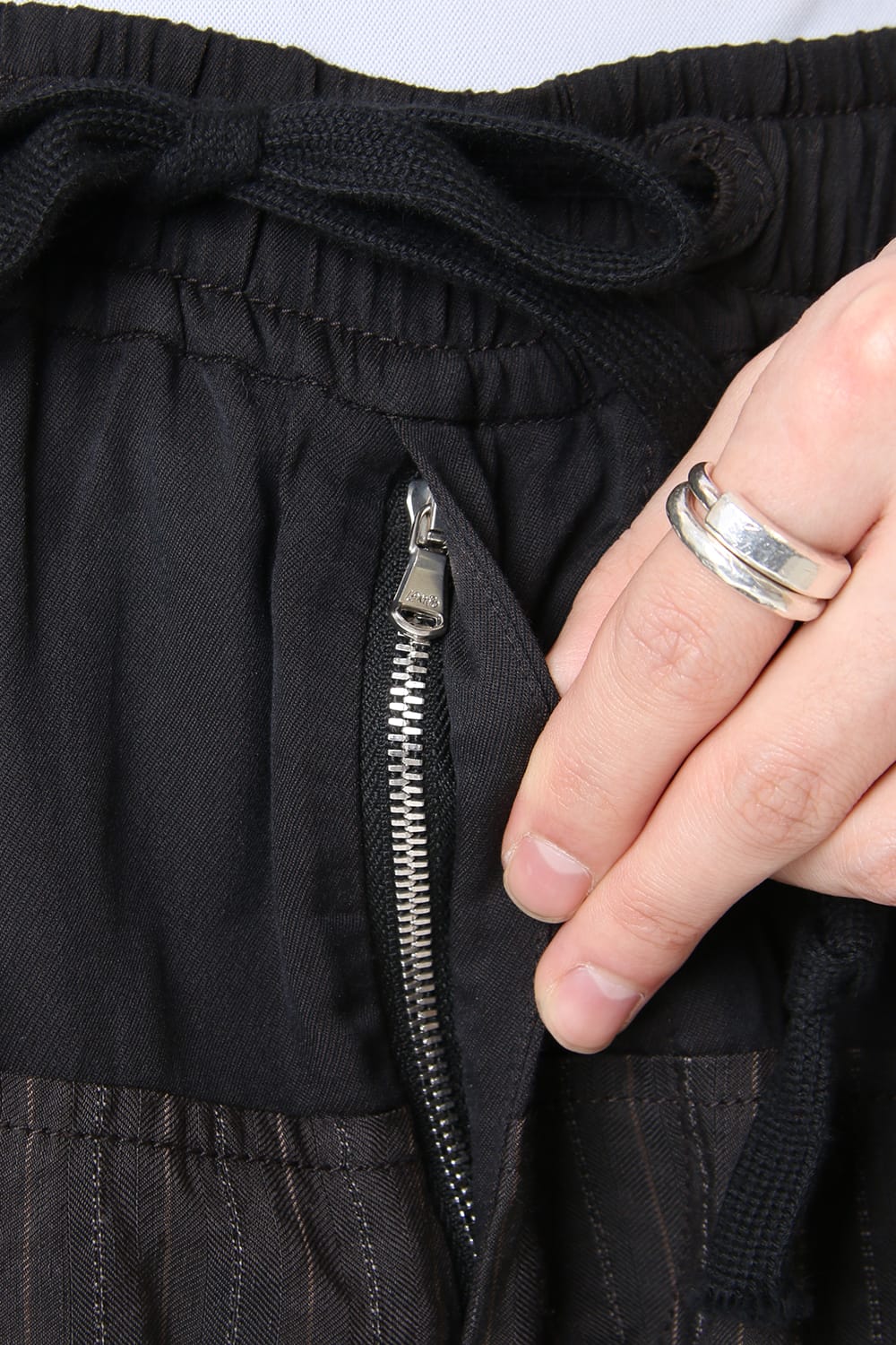 Easy pants featuring layered detail at the hem using striped fabric of Viscose cotton. You can enjoy the sense of balance of the hem by rolling it up to show the layered parts.