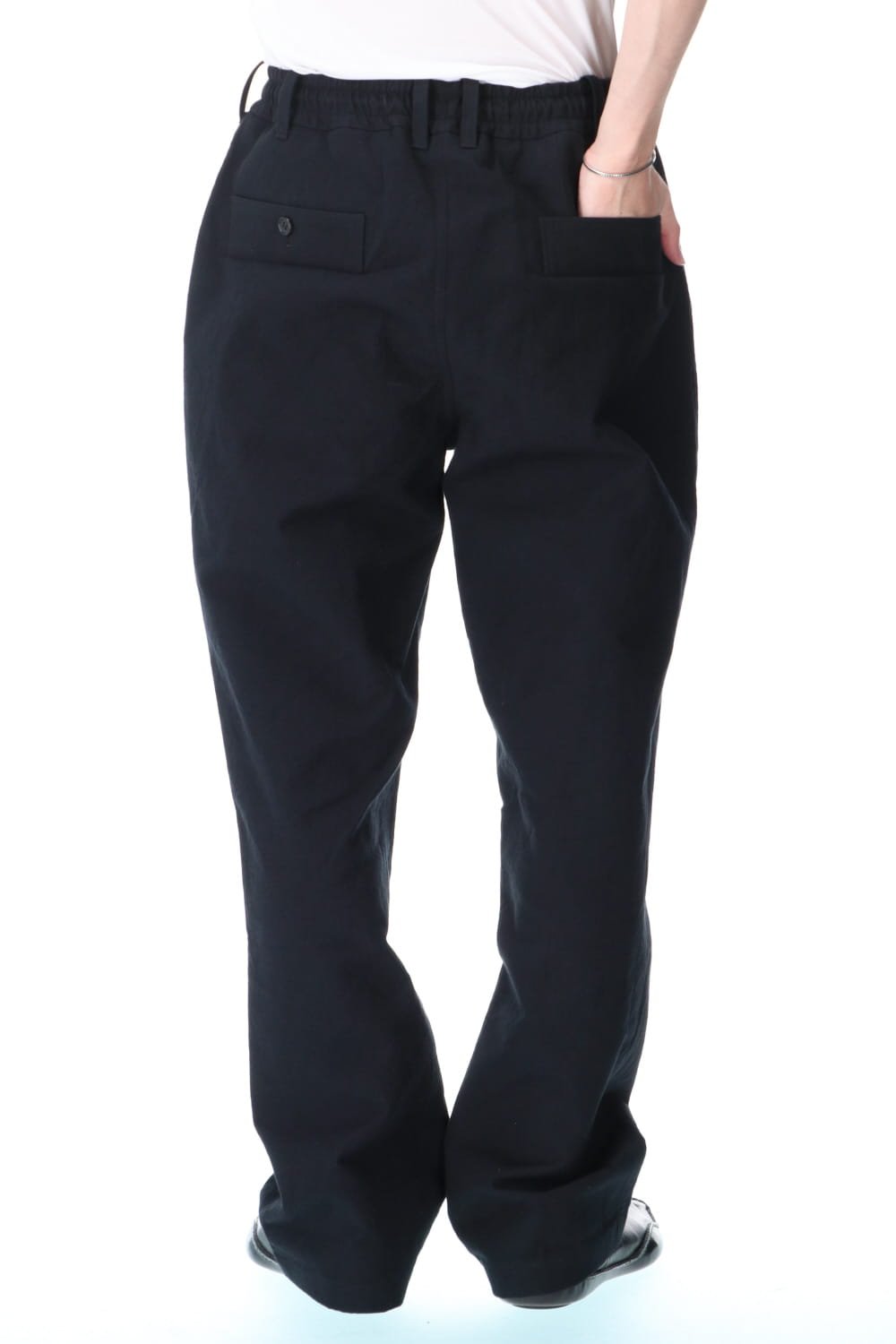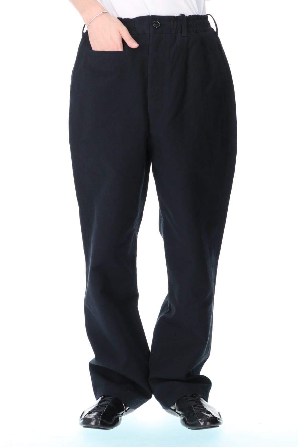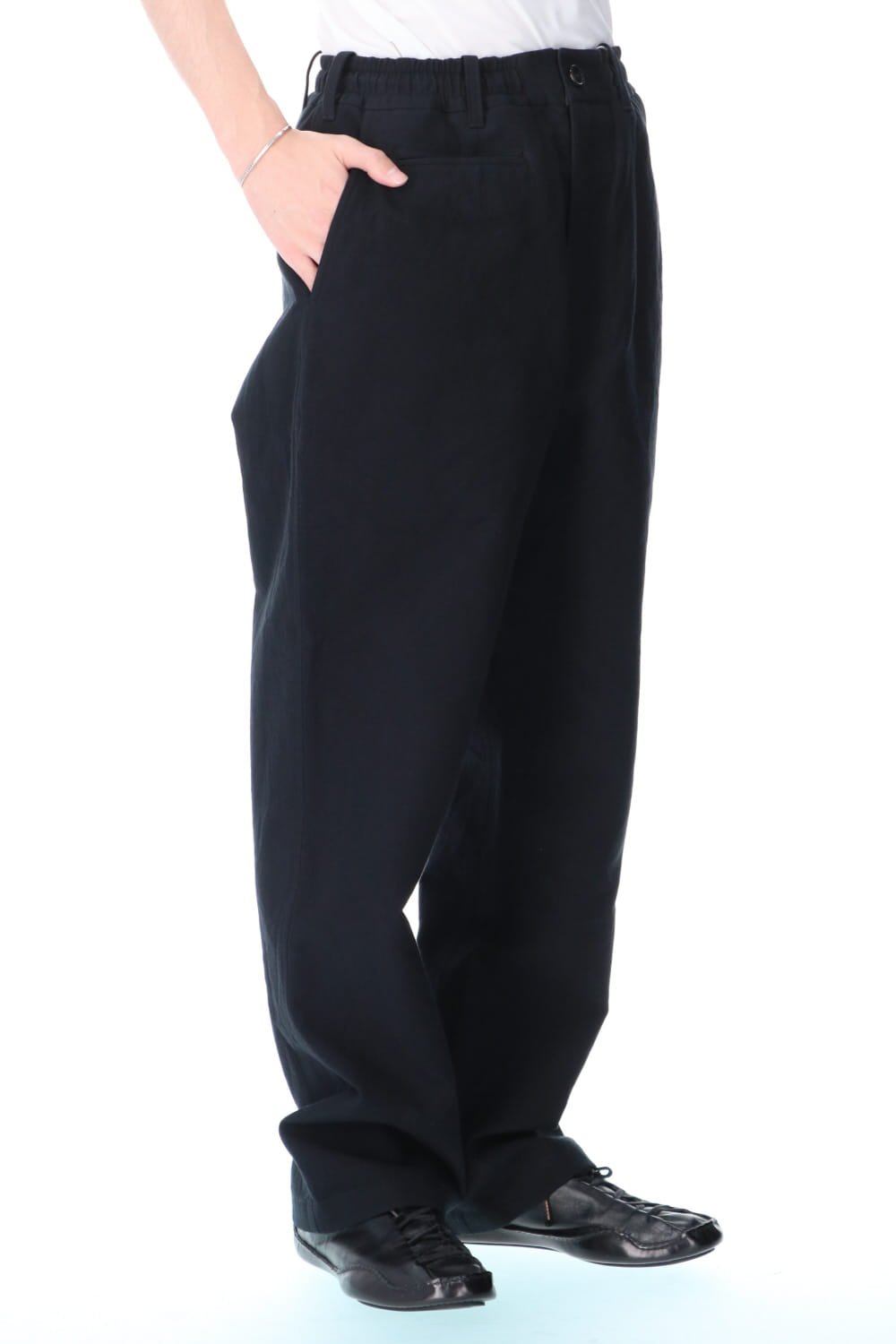 This is a pair of drawstring wide pants made of a standard double weave cotton from Yamauchi that is used regardless of the season. This item is made of densely woven double weave cotton from Enshu. The outer fabric and the lining are made of different fabric. The thermal processing will shrink only the lining and create a rough look on the outside. It looks simple and thick at first glance but it is actually a very thin high-density fabric. Usually, wool fabric has about 5000 warps, but this fabric has about 13000 warps.