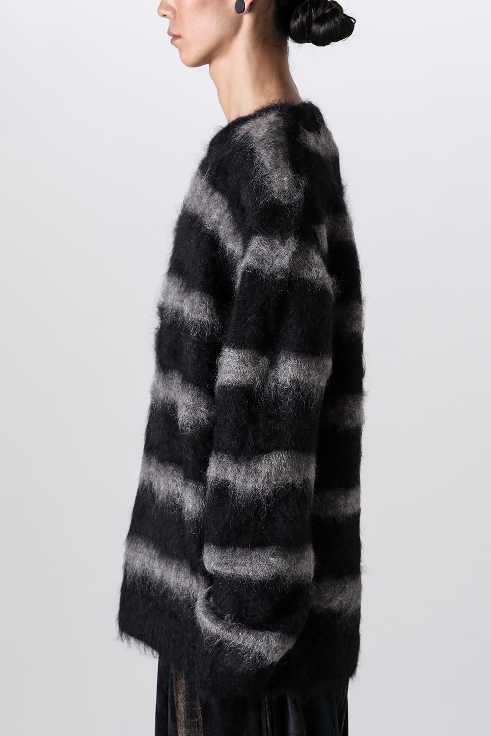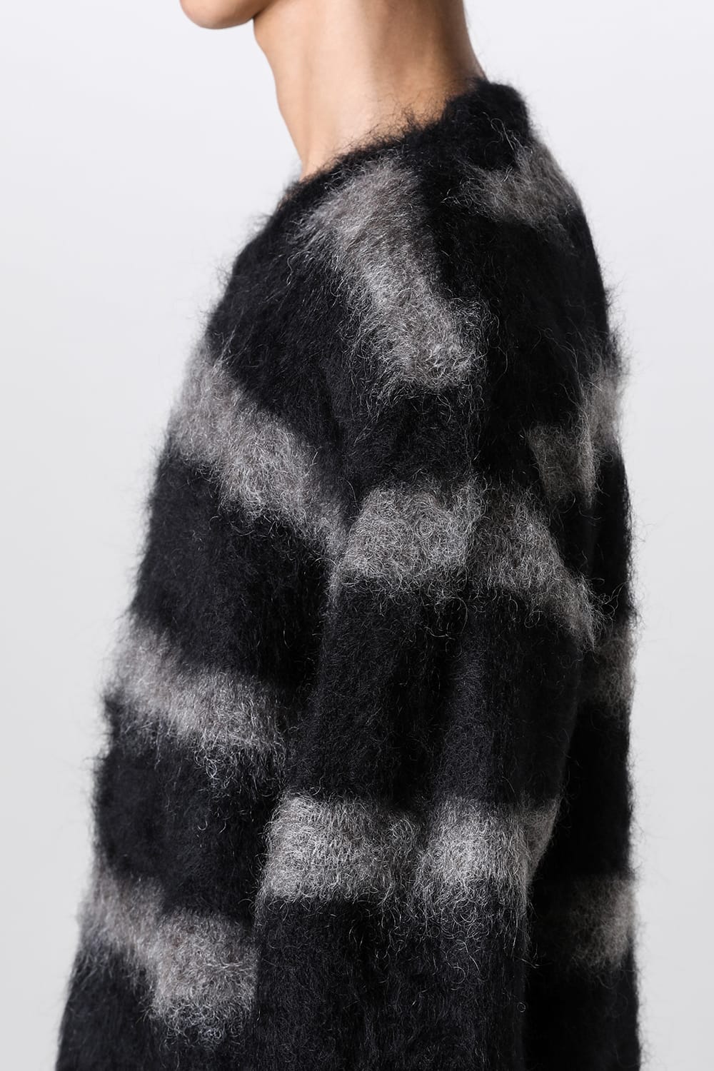 This crewneck knit is created by knitting yarn that is already brushed, resulting in a hairier and more textured mohair knit.