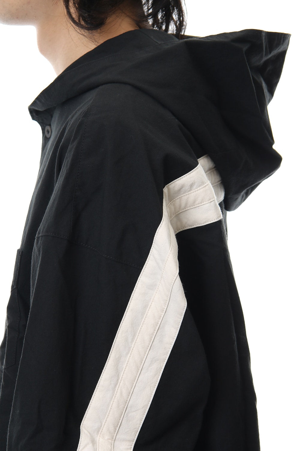 Hooded shirt blouson featuring a unique cocoon silhouette by taking darts above and below the waist of the front and overlapping towards the hem. All the buttons are water buffalo buttons, it has a round cut that was subjected to piping treatment in different fabrics, you can feel every pattern work was done with commitment and attention to detail.