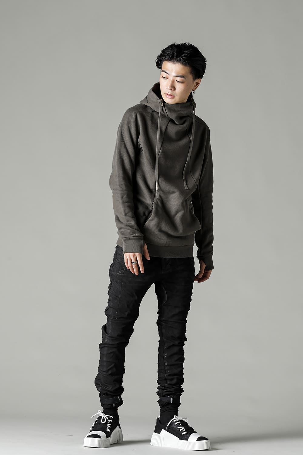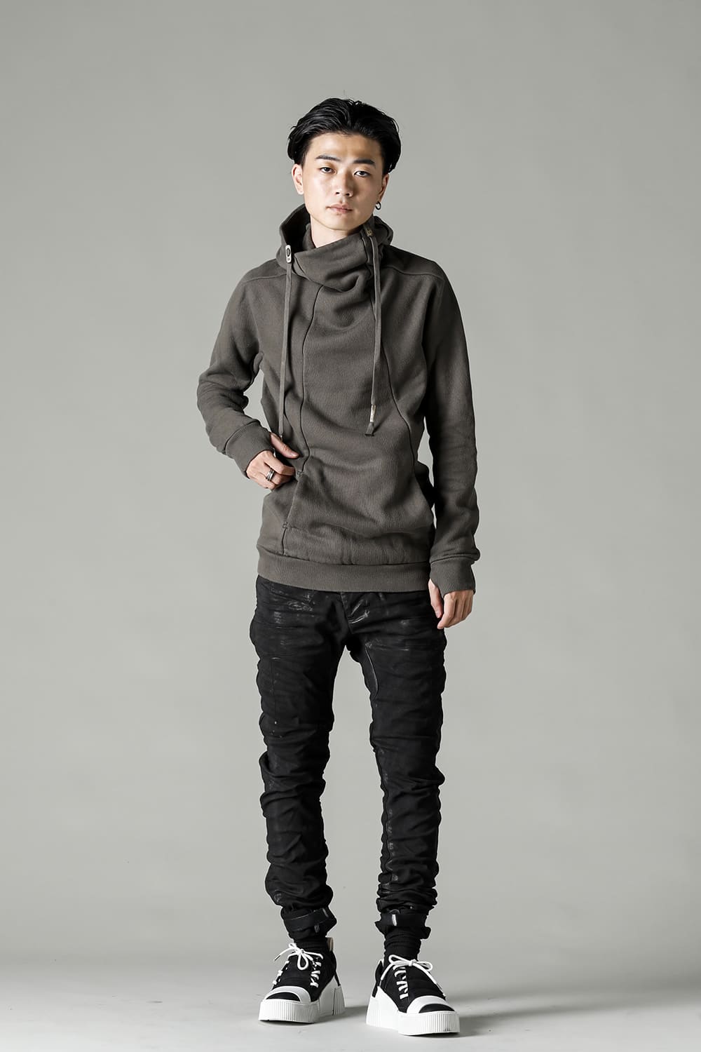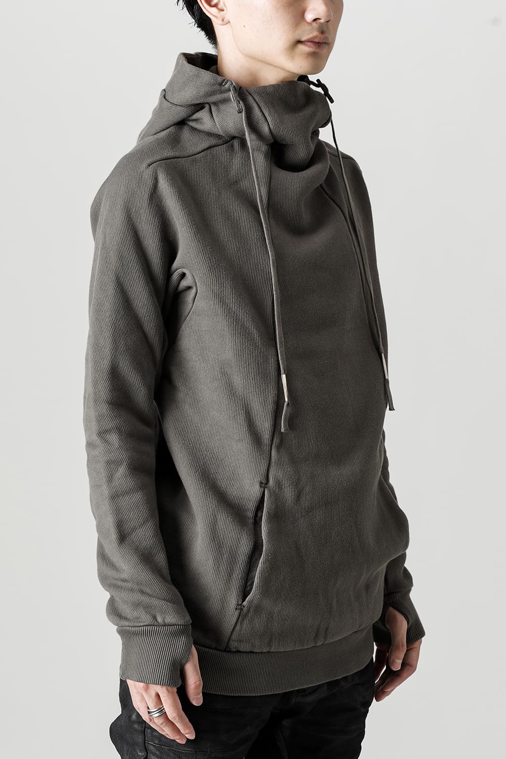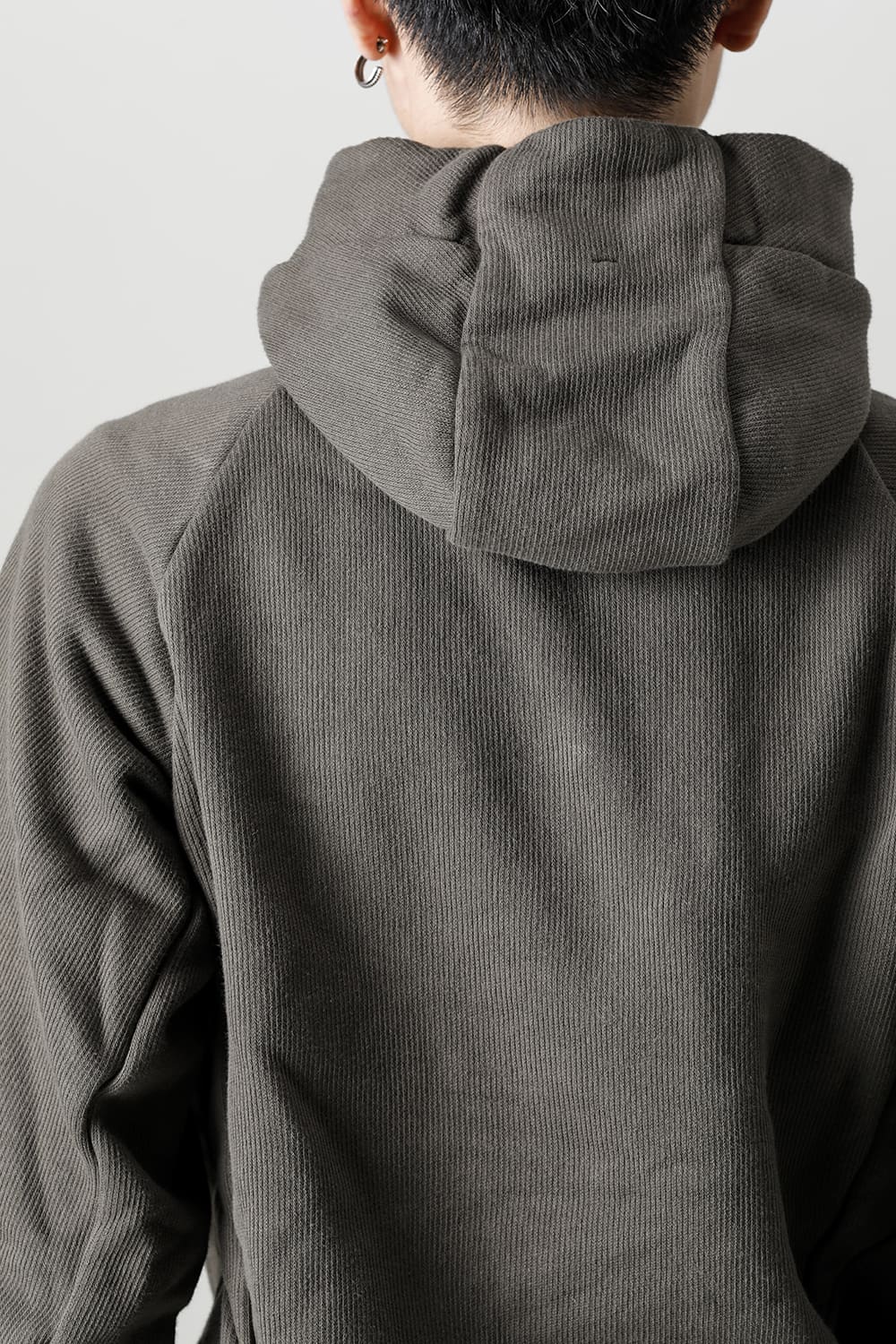 This hoodie 2, which has an impressive small hood and high neck design, is made of fleece lining sweat which is a standard material for autumn and winter. Slash pockets are placed along the diagonal seam, the cord hanging from the hood is set to be rather long, and the adjustable leather strap at the base and silver clasp on the cord serve as accents. The color named WEHR GRÜN is a deeply stagnant green khaki inspired by the military. The moderately loose silhouette creates a relaxed mood, and the details at key points create a solid BBS feel.