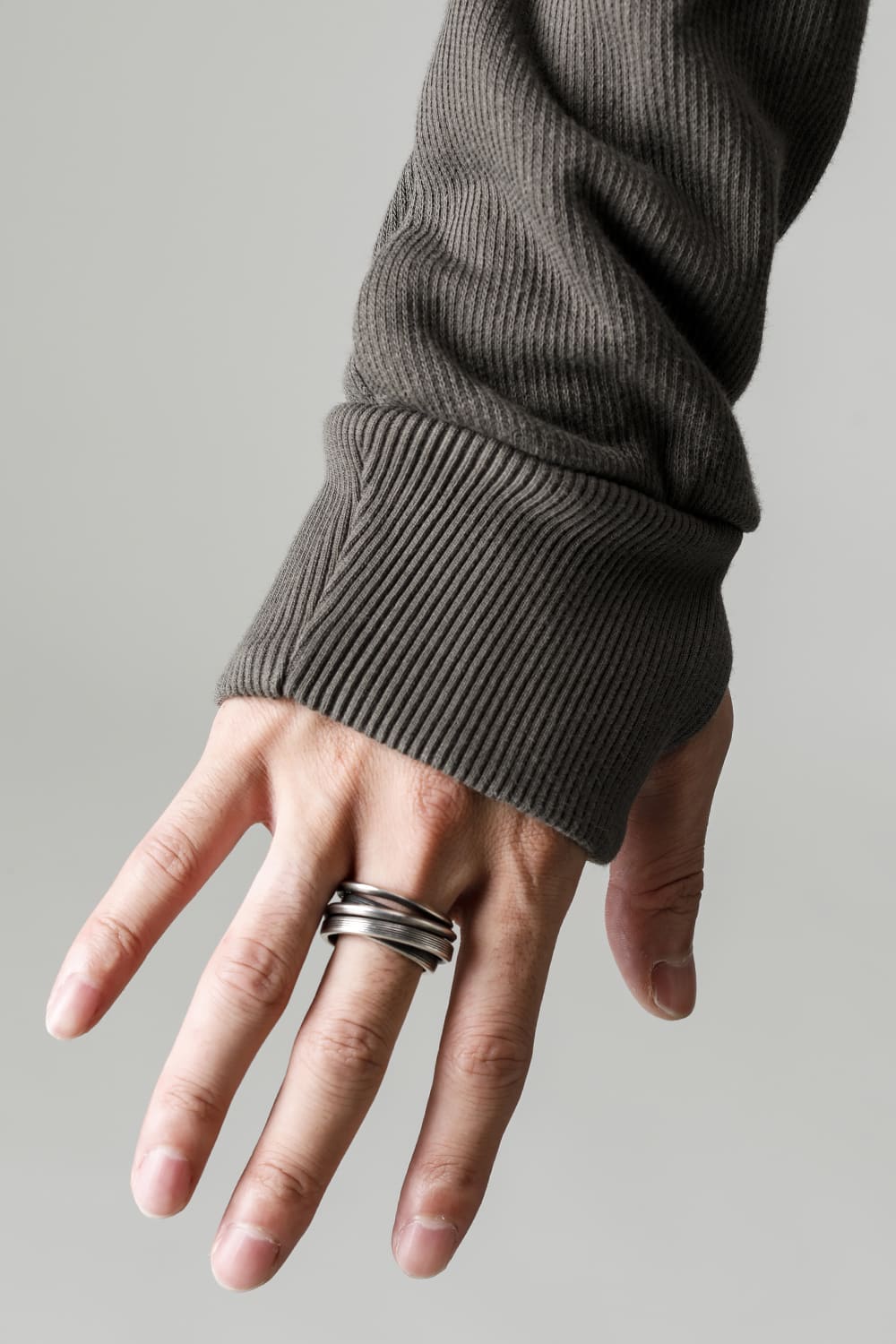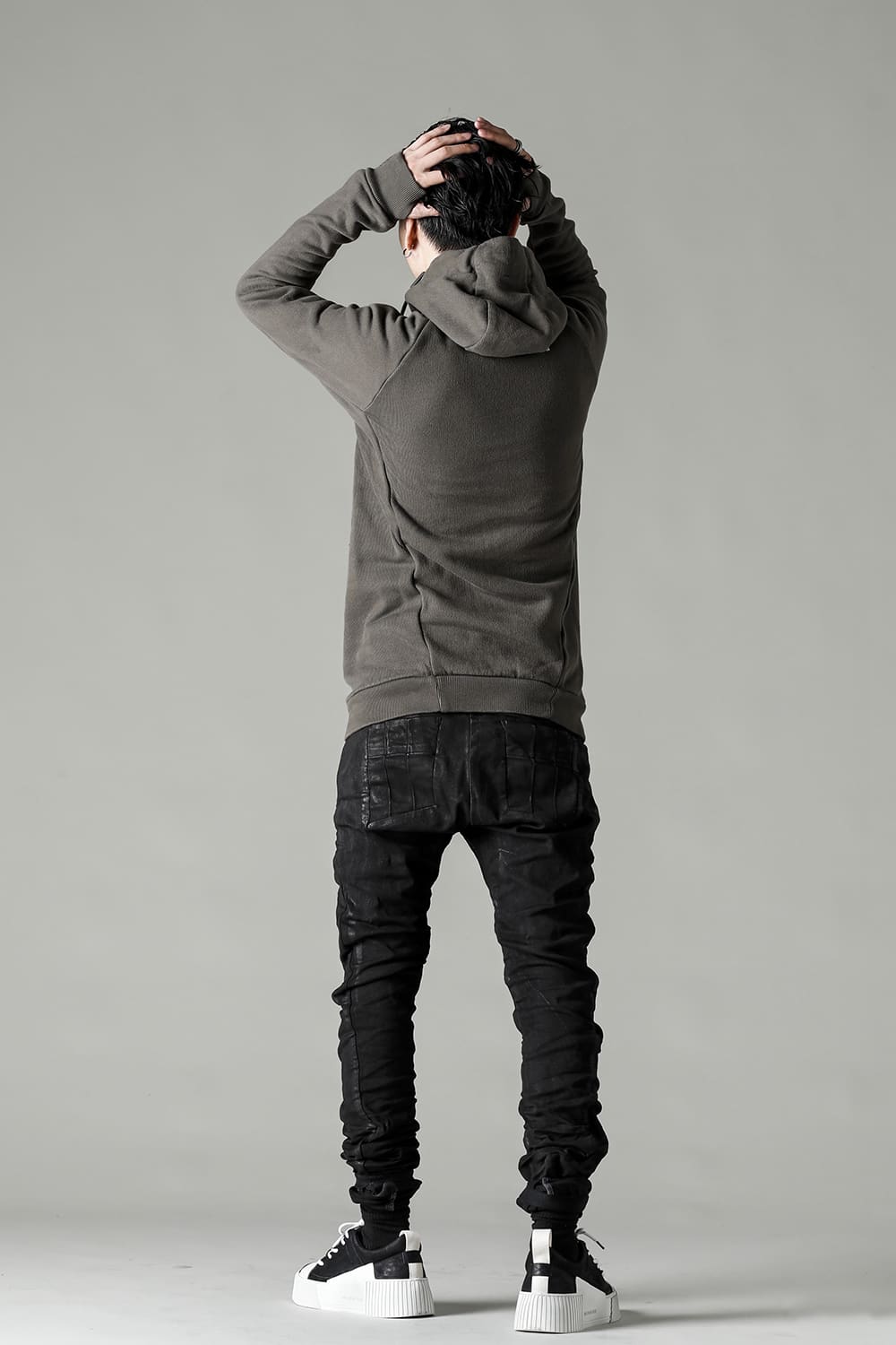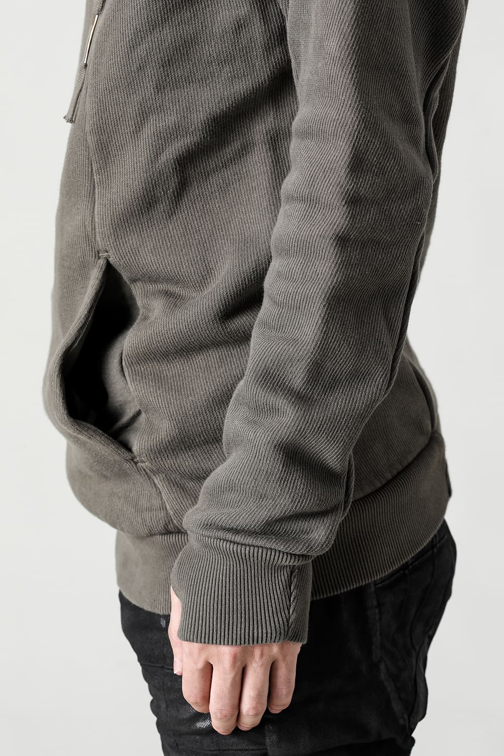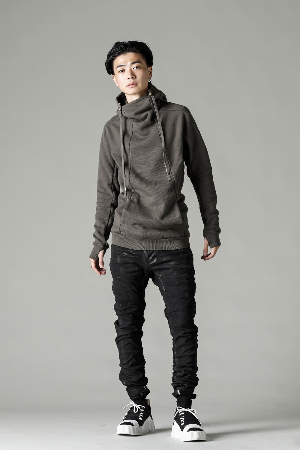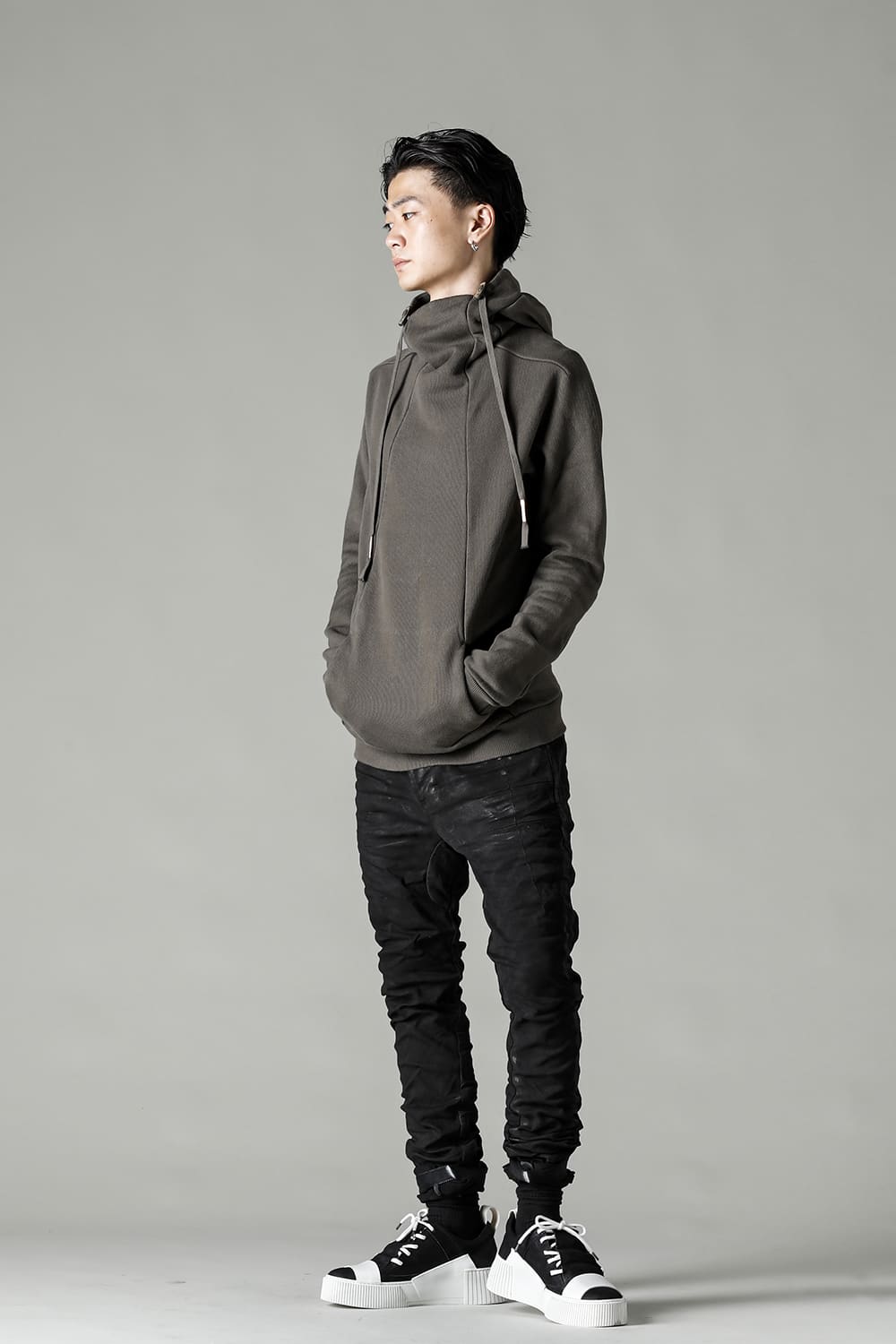 This hoodie 2, which has an impressive small hood and high neck design, is made of fleece lining sweat which is a standard material for autumn and winter. Slash pockets are placed along the diagonal seam, the cord hanging from the hood is set to be rather long, and the adjustable leather strap at the base and silver clasp on the cord serve as accents. The color named WEHR GRÜN is a deeply stagnant green khaki inspired by the military. The moderately loose silhouette creates a relaxed mood, and the details at key points create a solid BBS feel.