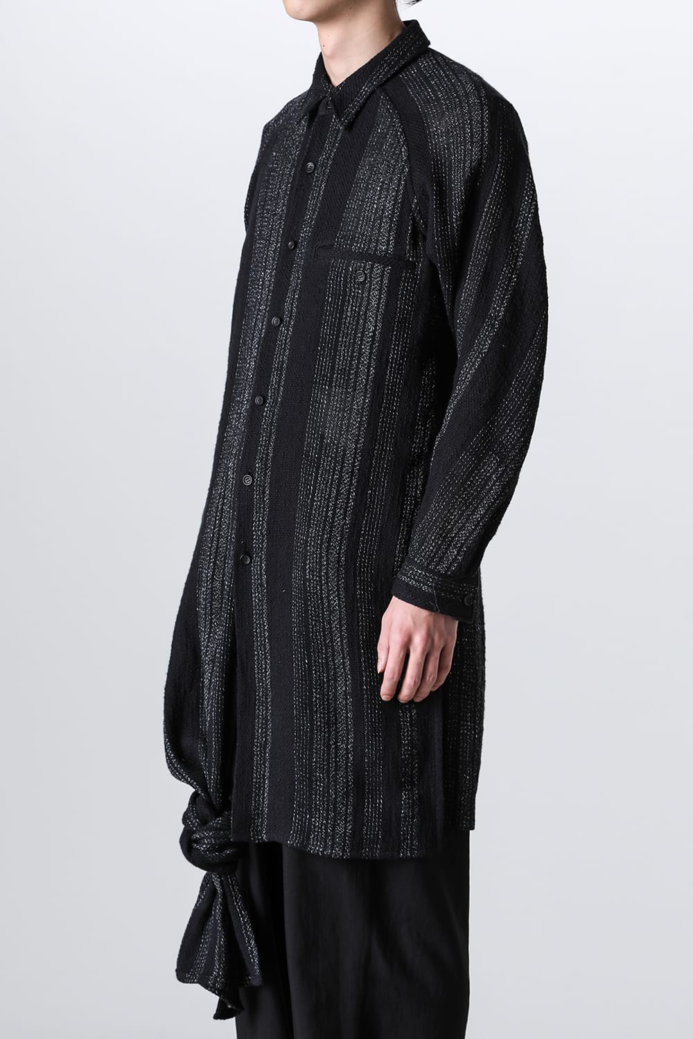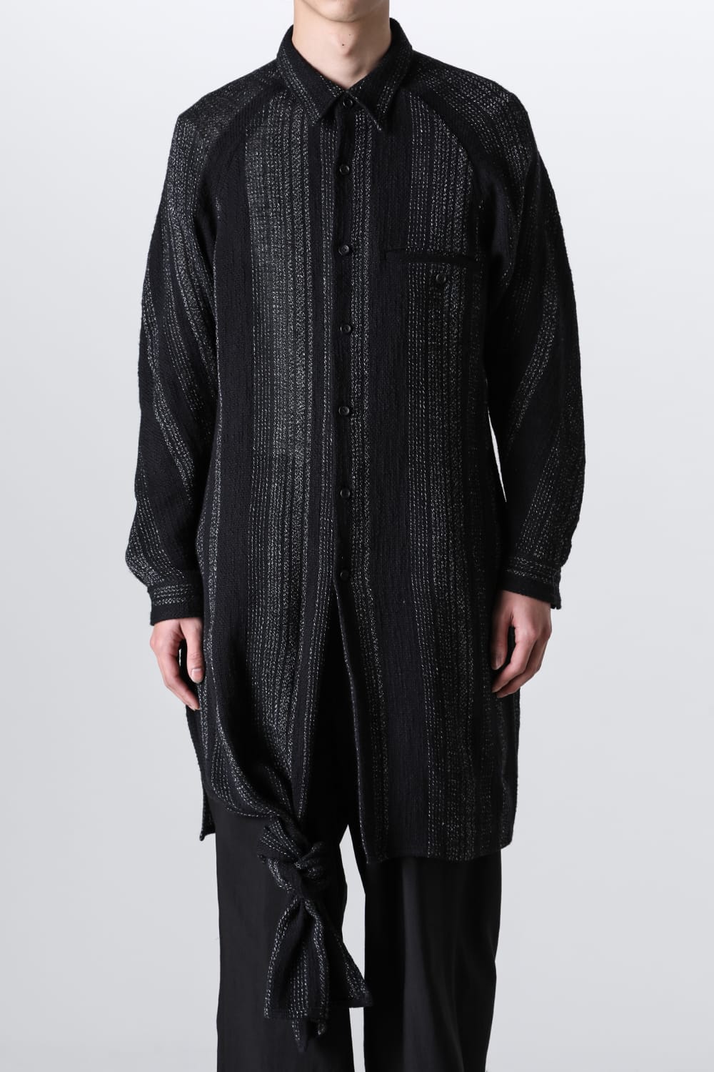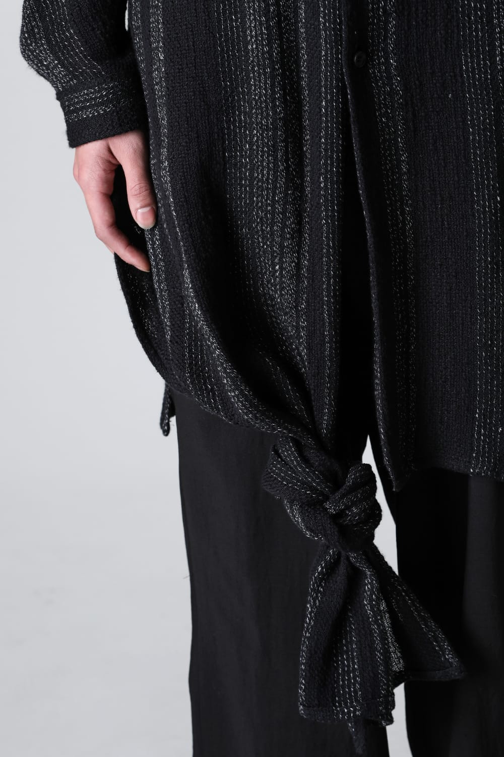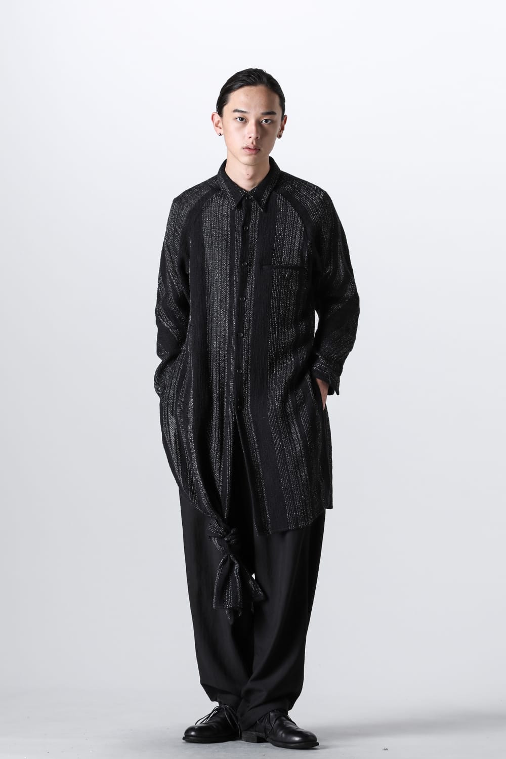 这是Runway LOOK 2上穿着的一款长款衬衫,带有下摆的结扎设计。