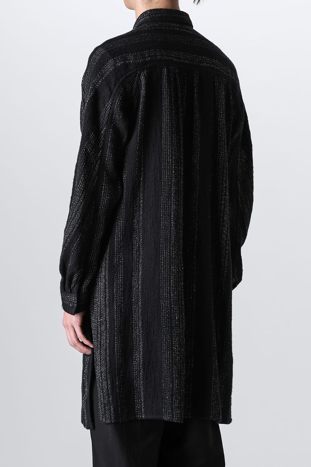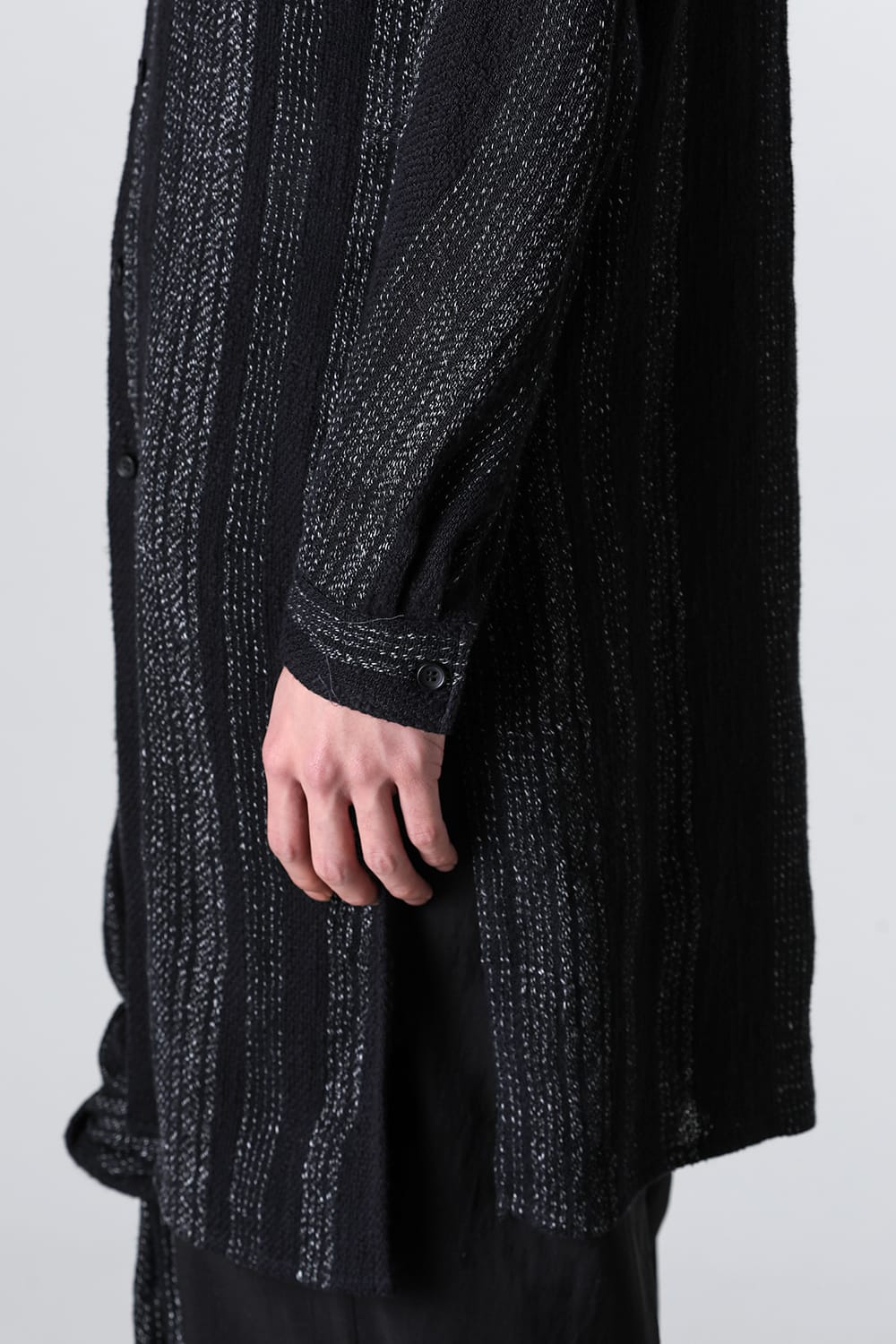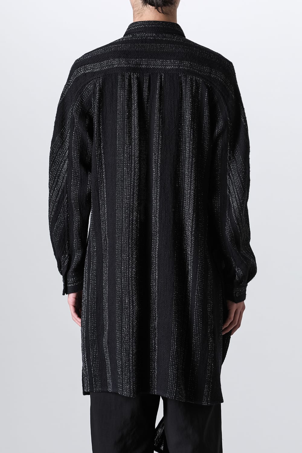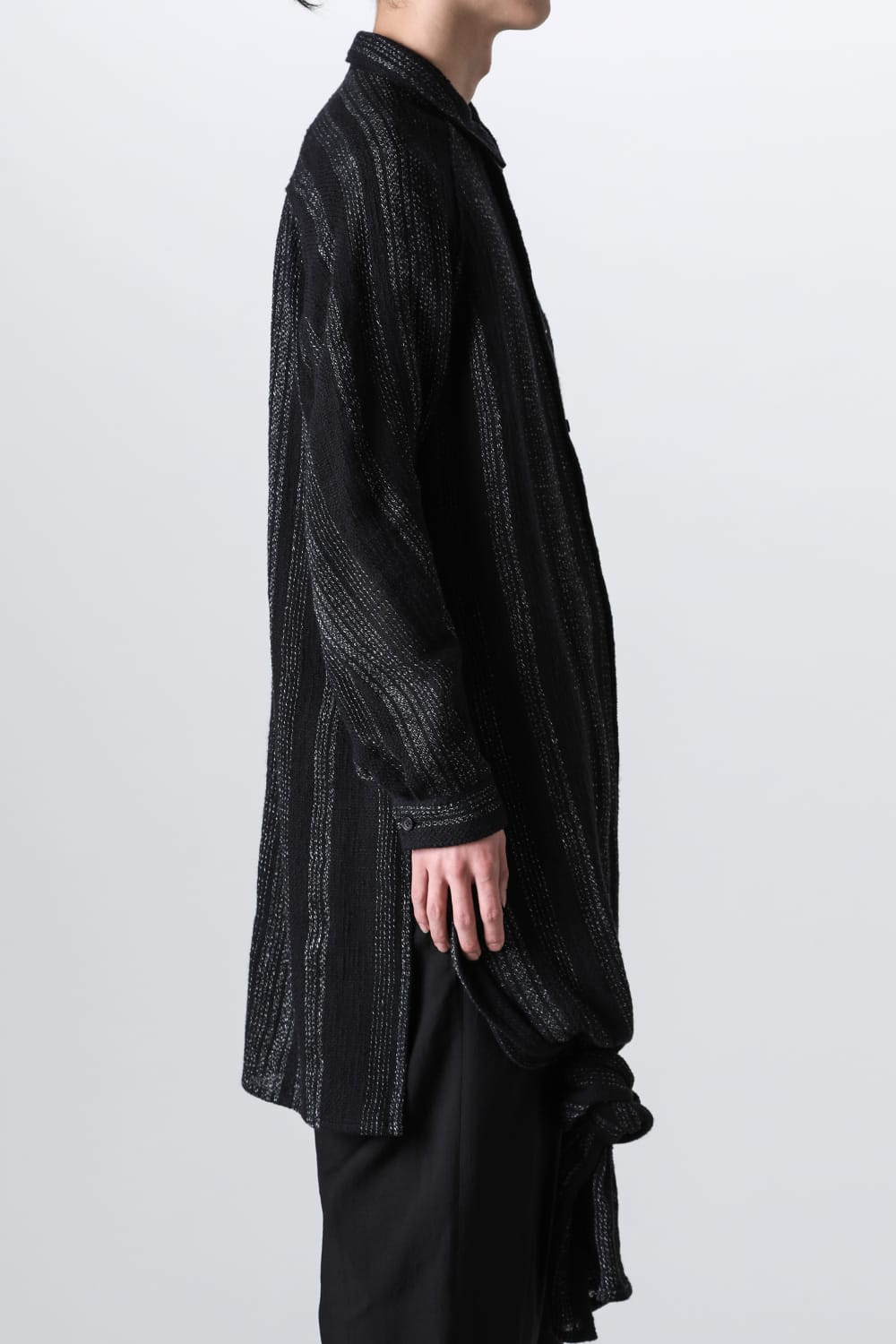 这是Runway LOOK 2上穿着的一款长款衬衫,带有下摆的结扎设计。