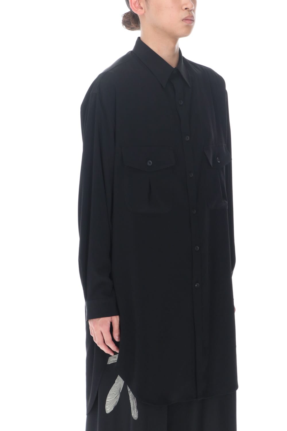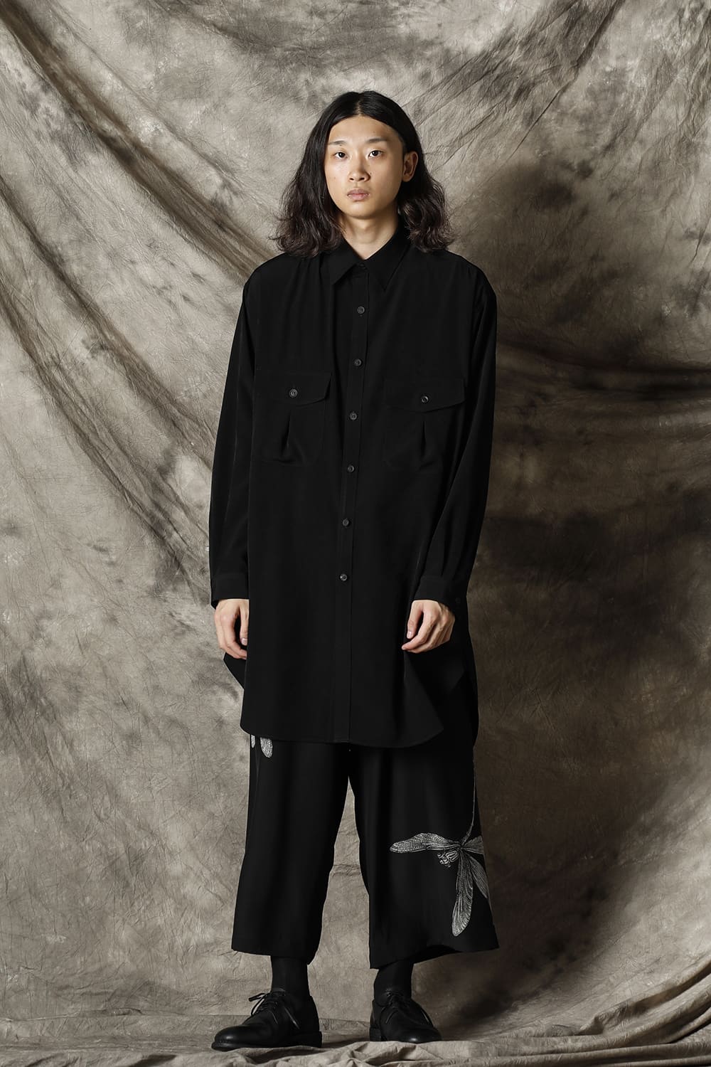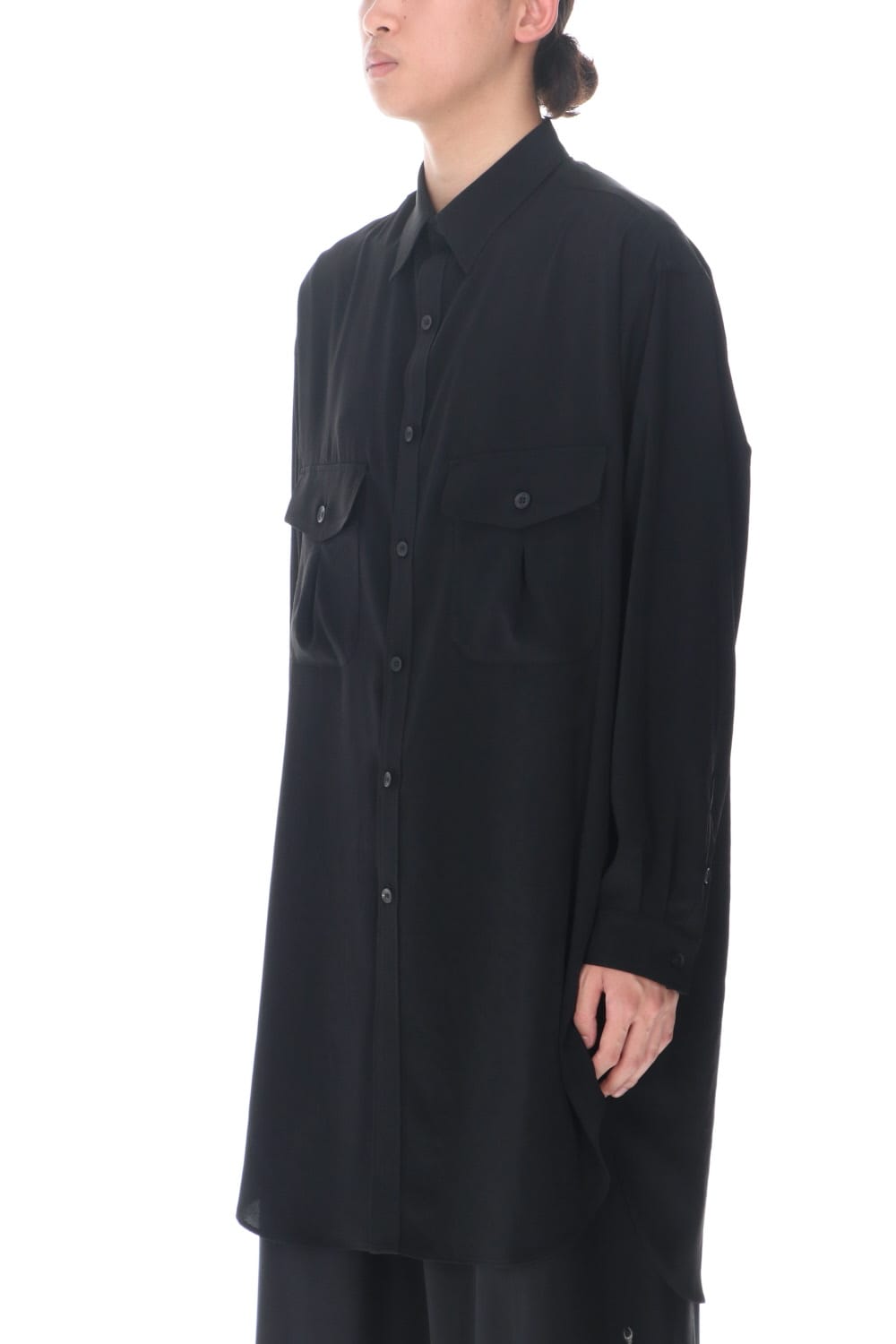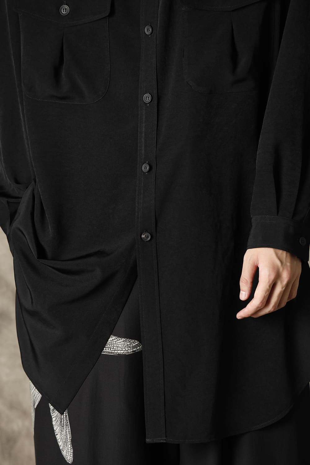 胸口的口袋是这款圆形裁剪衬衫的亮点。面料使用了现在作为经典面料推出的三醋酸纤维和涤纶的燕尾服面料,具有轻微的弹性和高雅的光泽是它的特色。