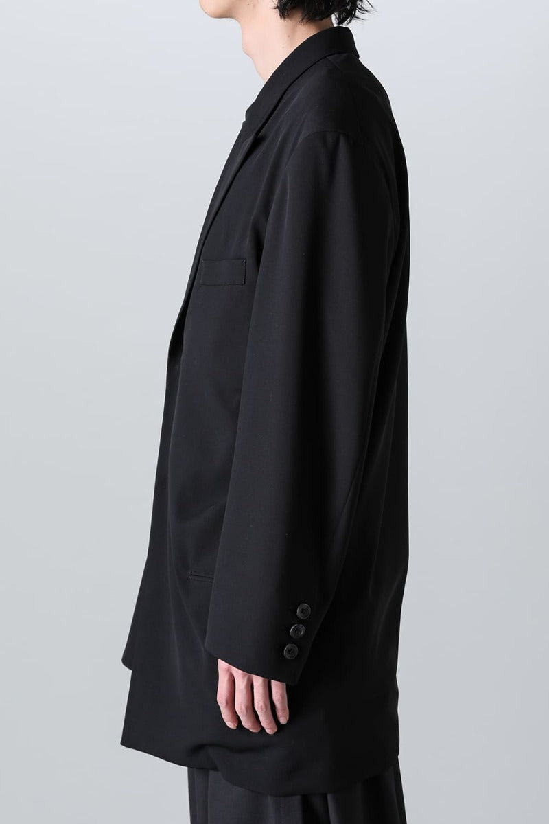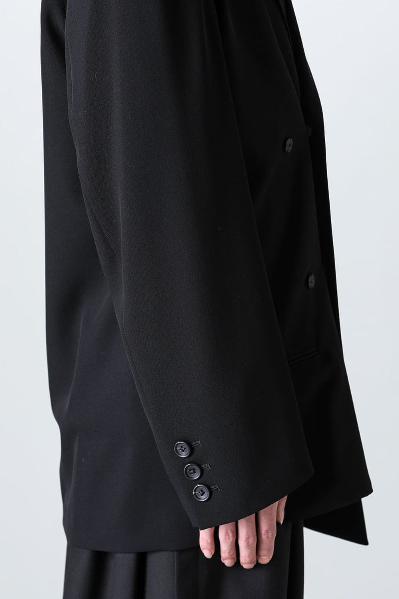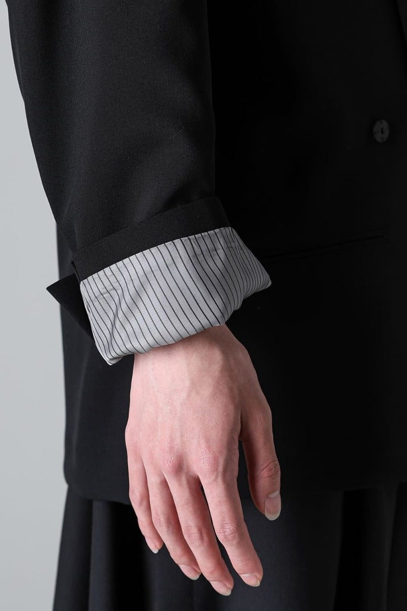 以右侧线为支点采用了一周面料,左右衣身的面料量稍有变化,从而在左衣身产生了褶皱,可以说是一款极具特色的设计,是本季系列的代表夹克之一。
