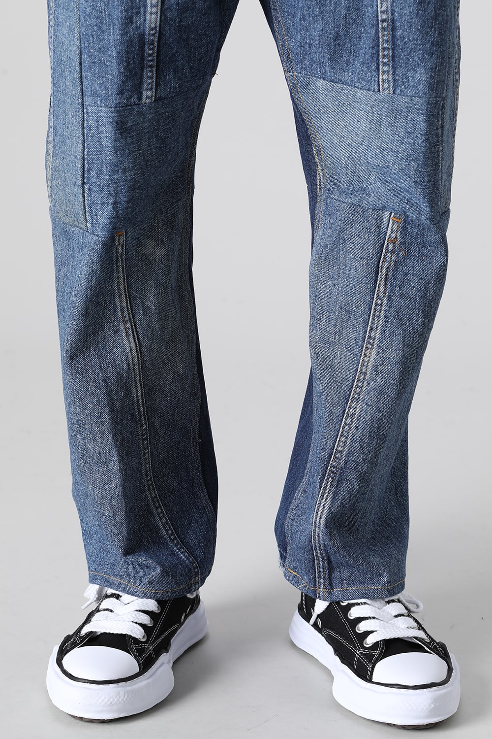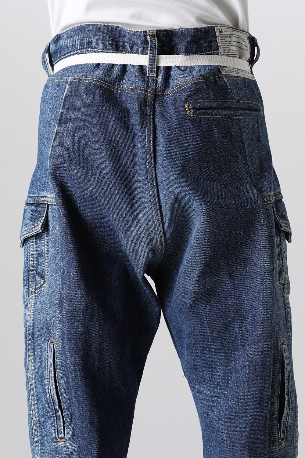 These denim pants are made by dismantling US-made denim jacket and reproducing cargo pants. The pockets of the jacket are reconstructed to look like cargo pockets, creating a playful design that is unique to ink. Different parts are colored differently, and the design incorporates the seams and details of the original denim jacket. The waist comes with herringbone tape as the belt, which also creates a skater-like atmosphere.