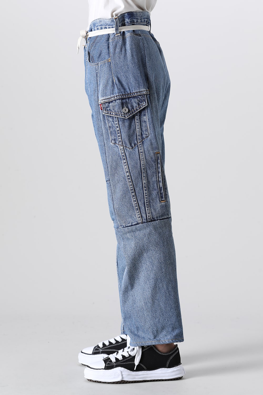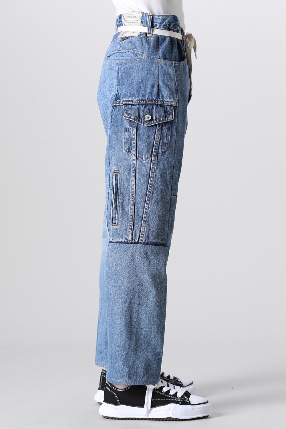These denim pants are made by dismantling US-made denim jacket and reproducing cargo pants. The pockets of the jacket are reconstructed to look like cargo pockets, creating a playful design that is unique to ink. Different parts are colored differently, and the design incorporates the seams and details of the original denim jacket. The waist comes with herringbone tape as the belt, which also creates a skater-like atmosphere.