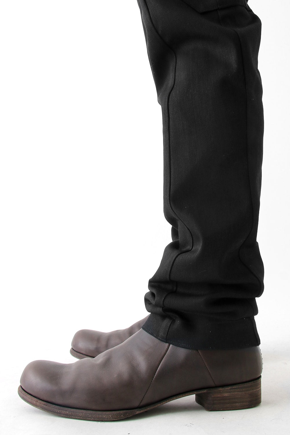 Strong reaction dying pure black dyed threads, for jodhpurs pants made with Kojima (Okayama) stretch denim. The rise is deeper this time, with a strong tapered and sharp pattern from the knee. The sides have flap pockets.