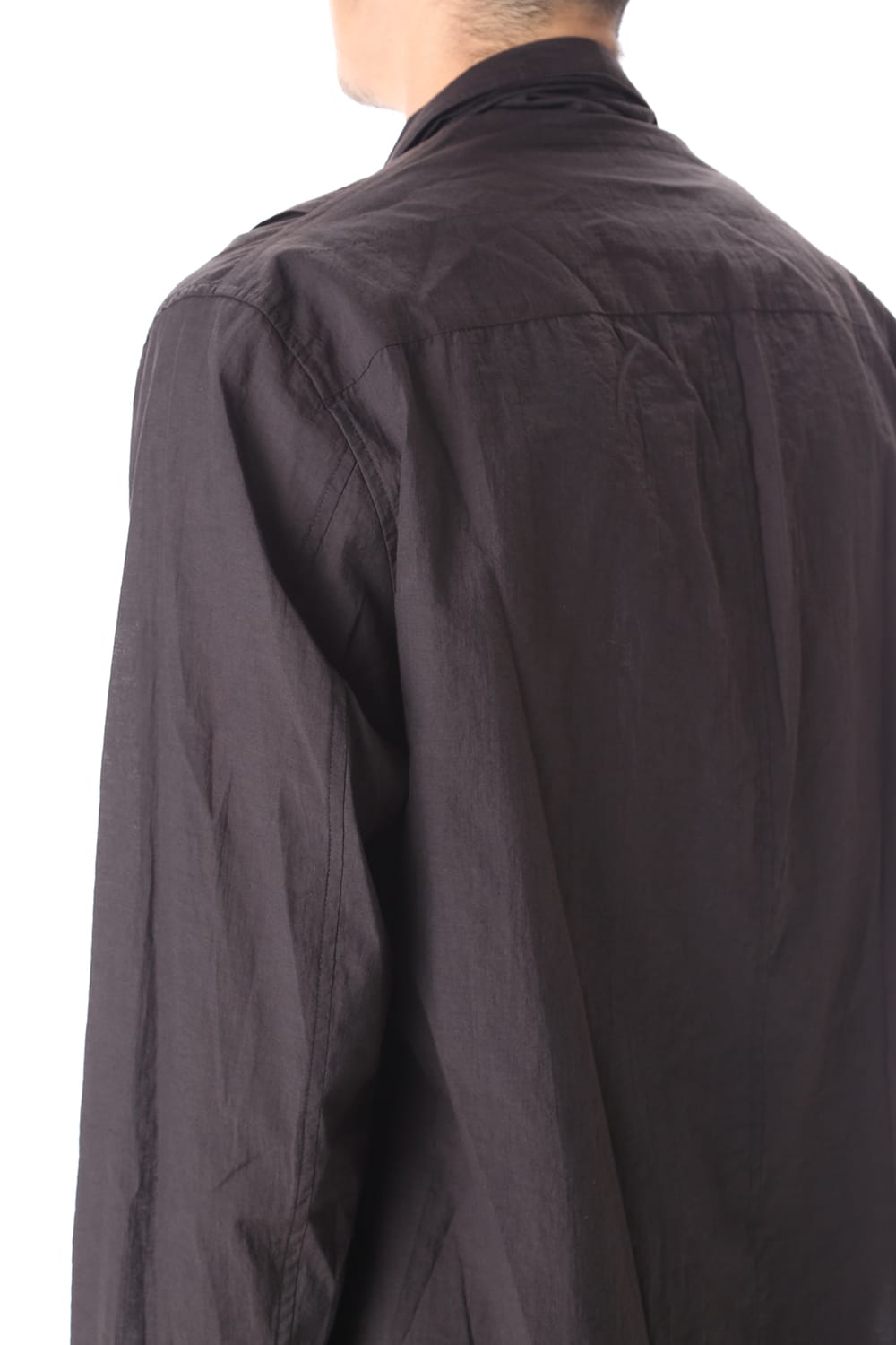 This shirt has a combined collar and stole design. The stole can be worn by hanging or tying it. The slightly see-through dry cotton nylon fabric is firm, and the wide fabric is taken large, with large tucks from the shoulders to the front, creating a unique crisp drape. With a loose silhouette and pockets, it can also be used as a shirt blouson.