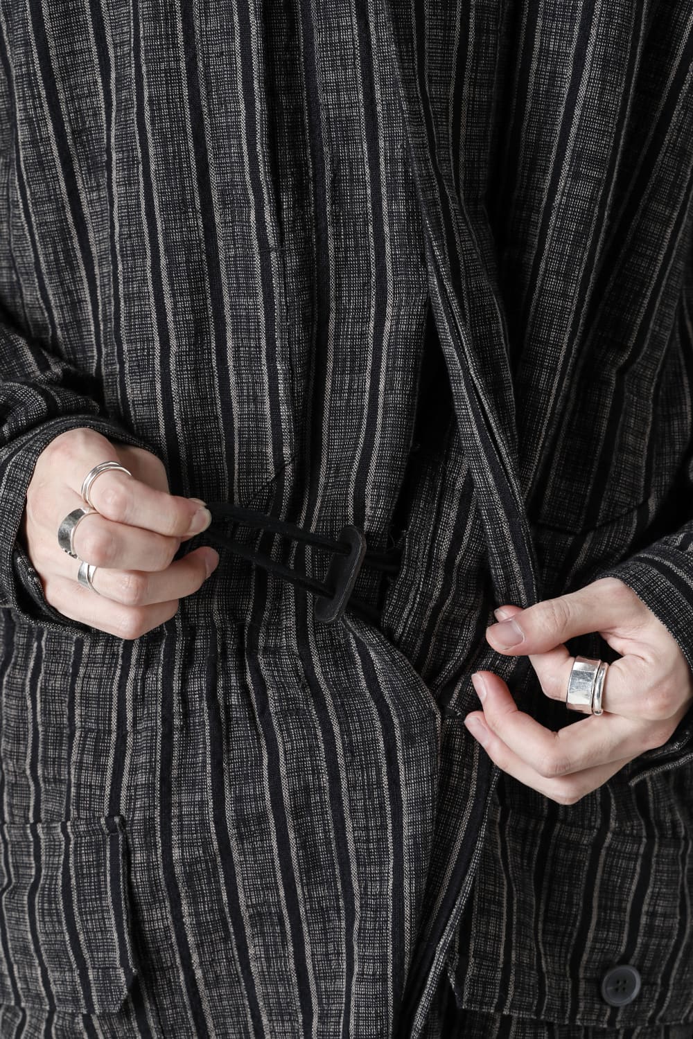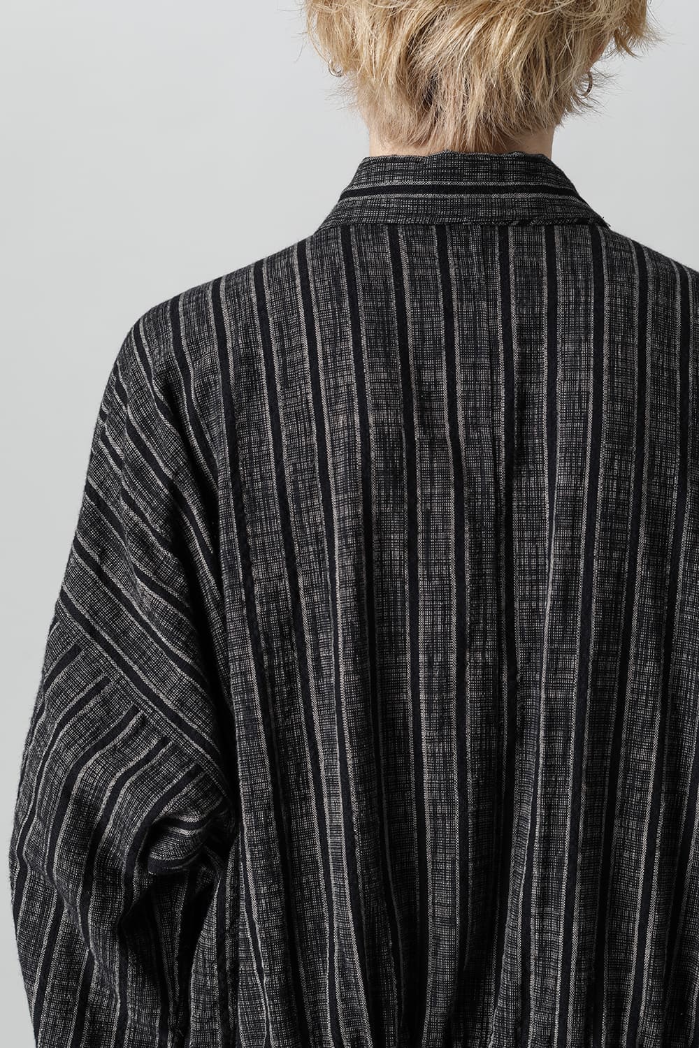 This over-sizing jumpsuit features a slightly rounded silhouette. This item is made of striped cotton cloth that can be worn all year round. You can enjoy various styles such as changing the silhouette by using 2 draw cords passing through the inside of the waist. JAN-JAN VAN ESSCHE's specialty is a jumpsuit with military taste and use of fabric with Asian ethnic essence.