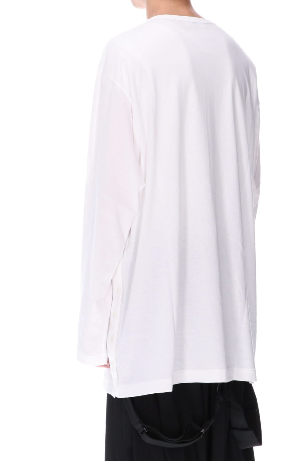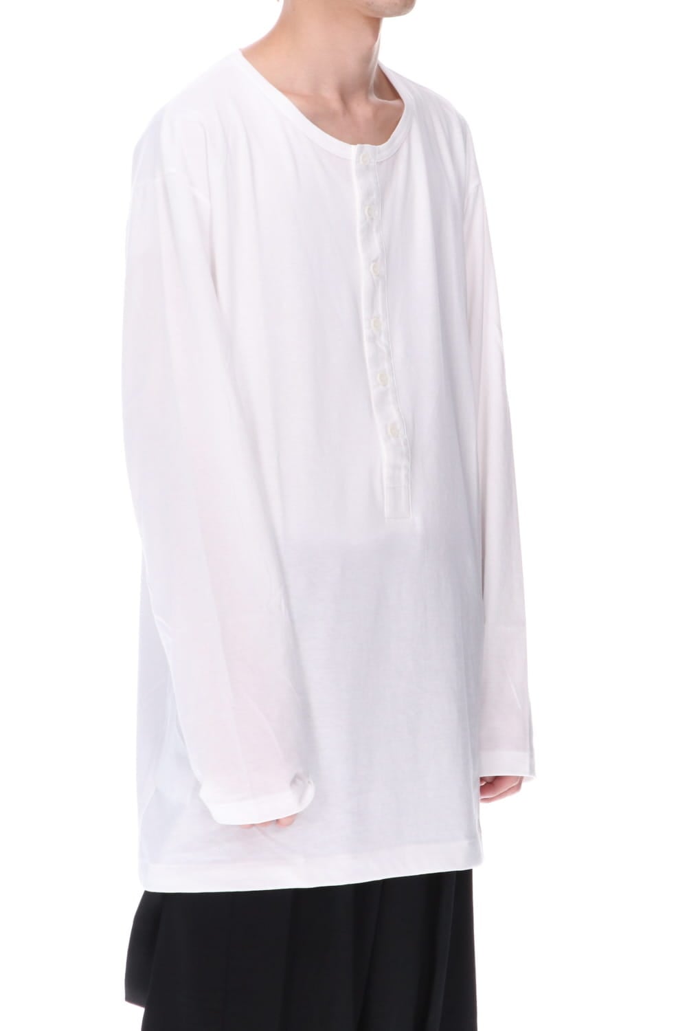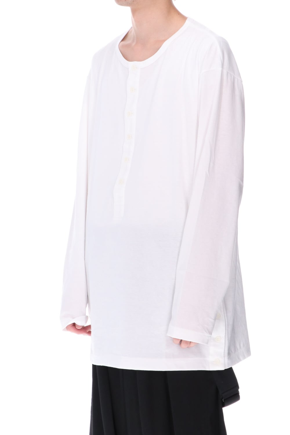 Henrey neck tee with long neck buttons. The left flank has a button that can be opened and closed, the slit can be opened to your preferred height for easy access to the pant pockets.
