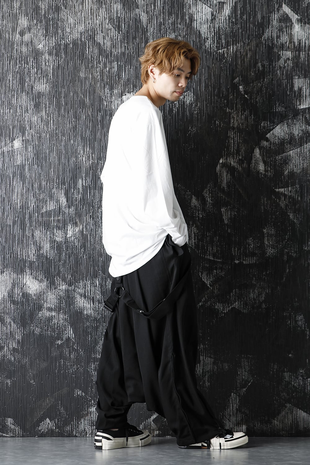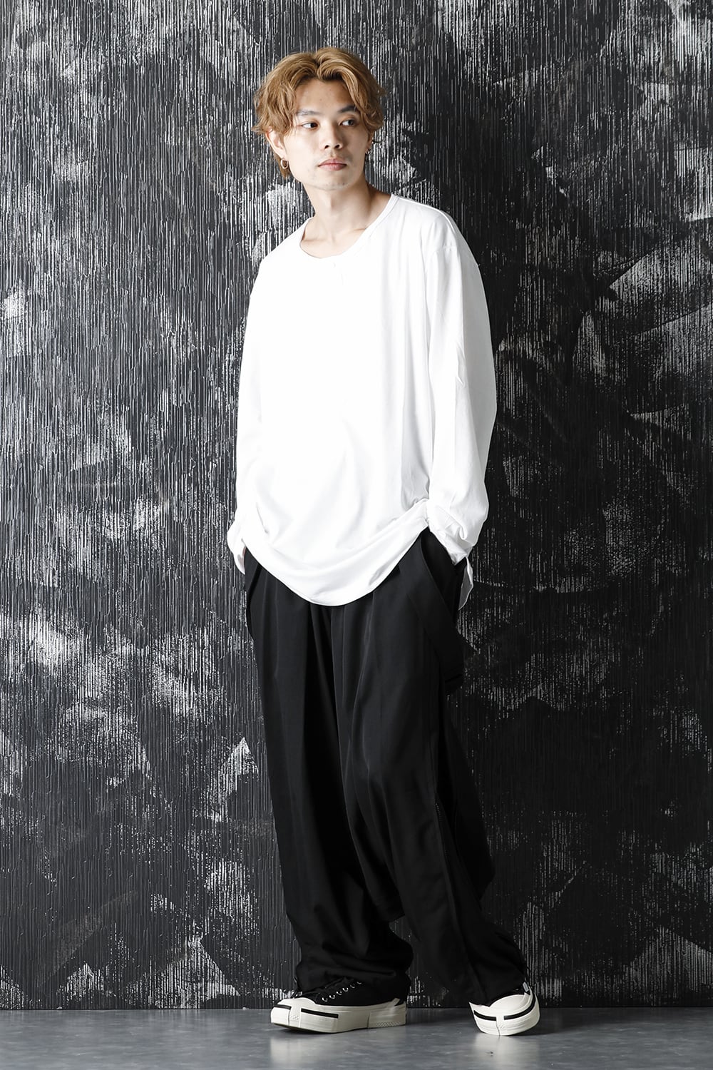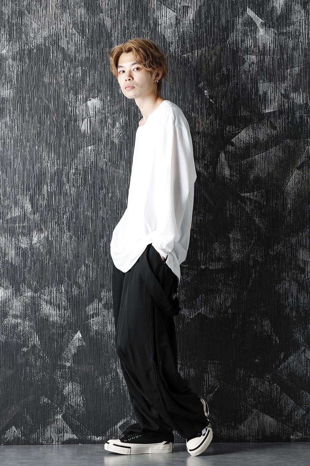 Henrey neck tee with long neck buttons. The left flank has a button that can be opened and closed, the slit can be opened to your preferred height for easy access to the pant pockets.