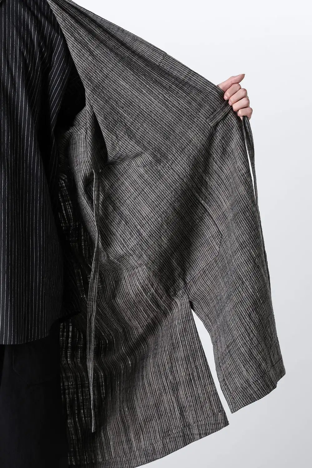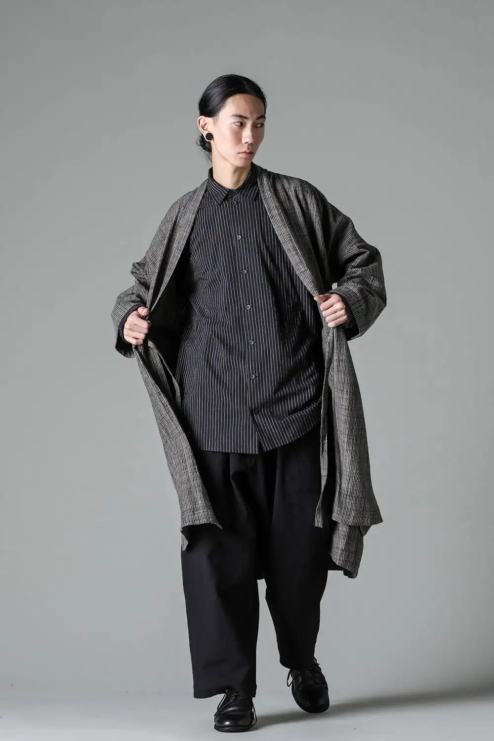The fabric, a striped cotton made with threads of varying thicknesses, has a unique appearance that can look like checks from different angles, providing a soft and fluffy texture.