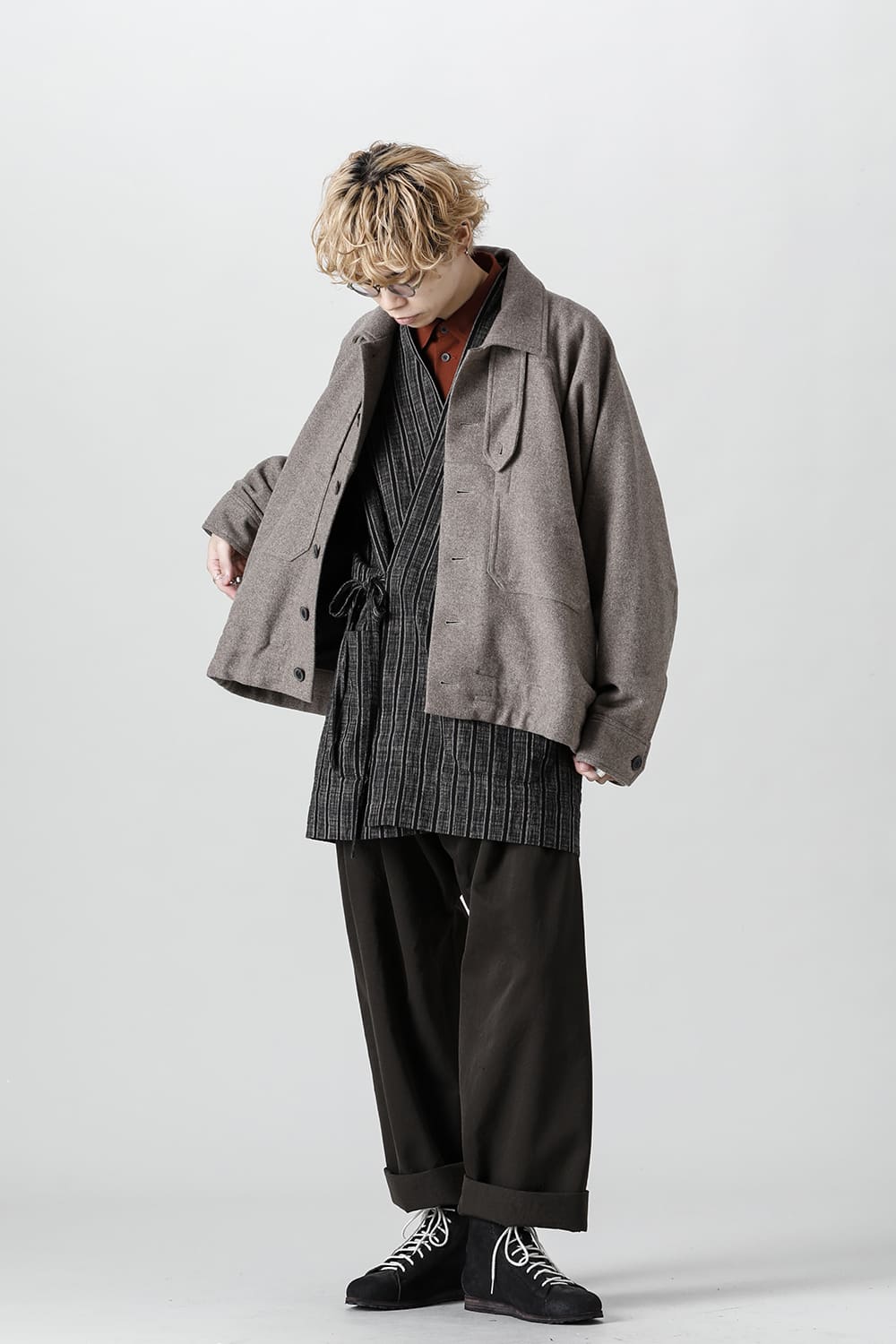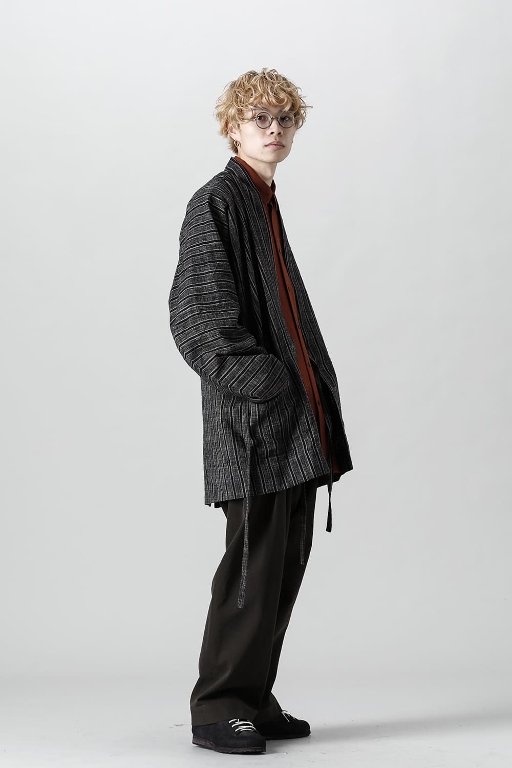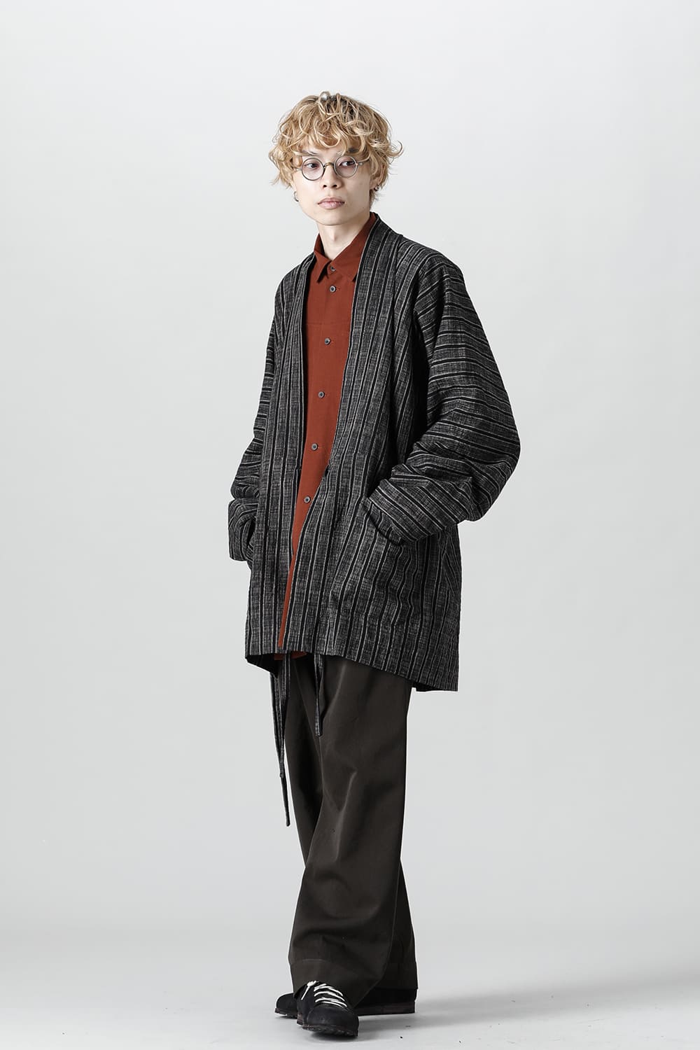 This is a striped cotton cloth kimono jacket that can be worn all year round. By layering the same item as the base throughout the year, this item can be changed into a seasonal look. This item is also well versed in JAN-JAN's own style. This versatile item can be worn as an inner like a shirt in the autumn and winter, or as a light jacket in the spring and summer, by developing a regular length that is easier to handle, while a long length kimono has been developed.