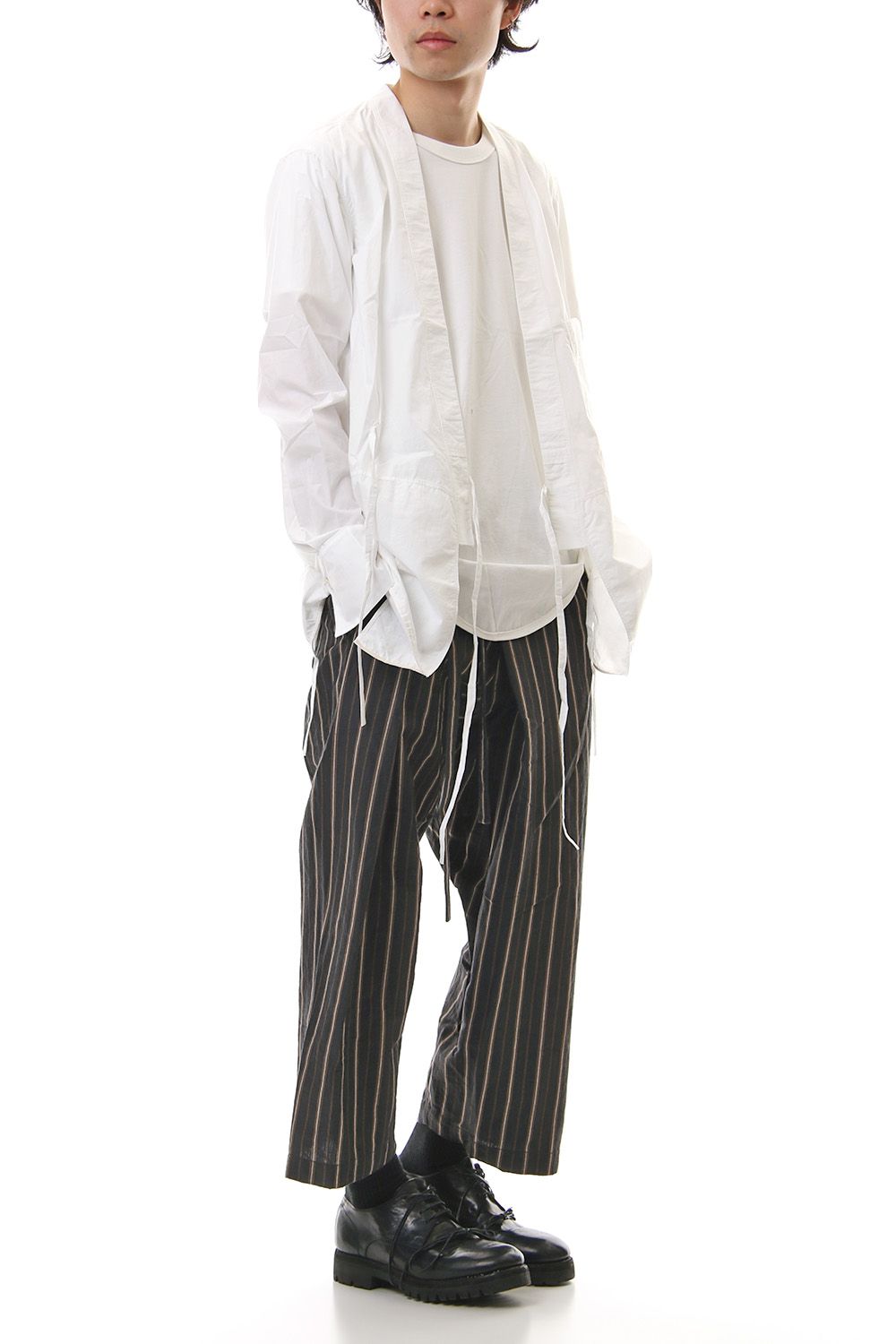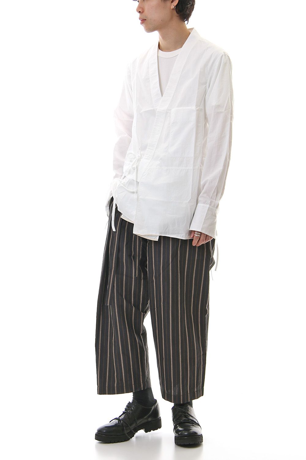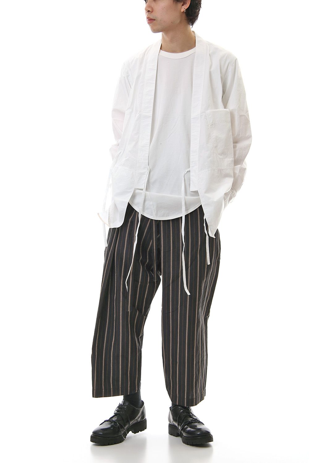 A Japanese style shirt jacket with a kimono-like silhouette. It is possible to wear the front with the cord of the left front body inside and the cord of the right body in front. It is a new design that you can wear as an inner or as a light outer.