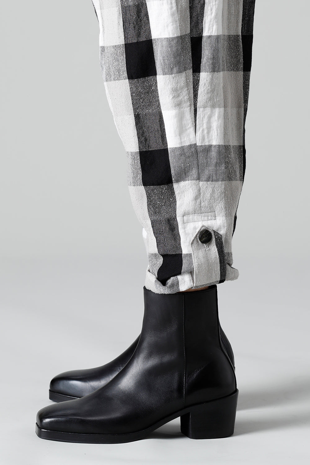 In the picture, the hem is folded back and the tabs on the left and right are attached to the hem.