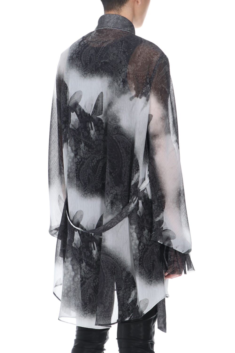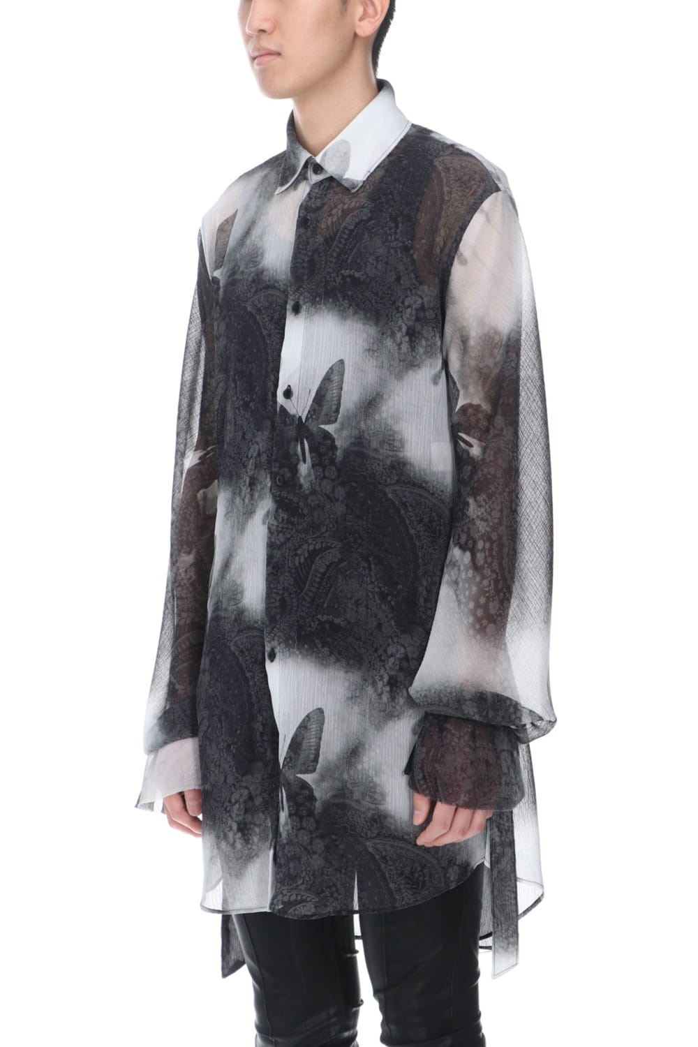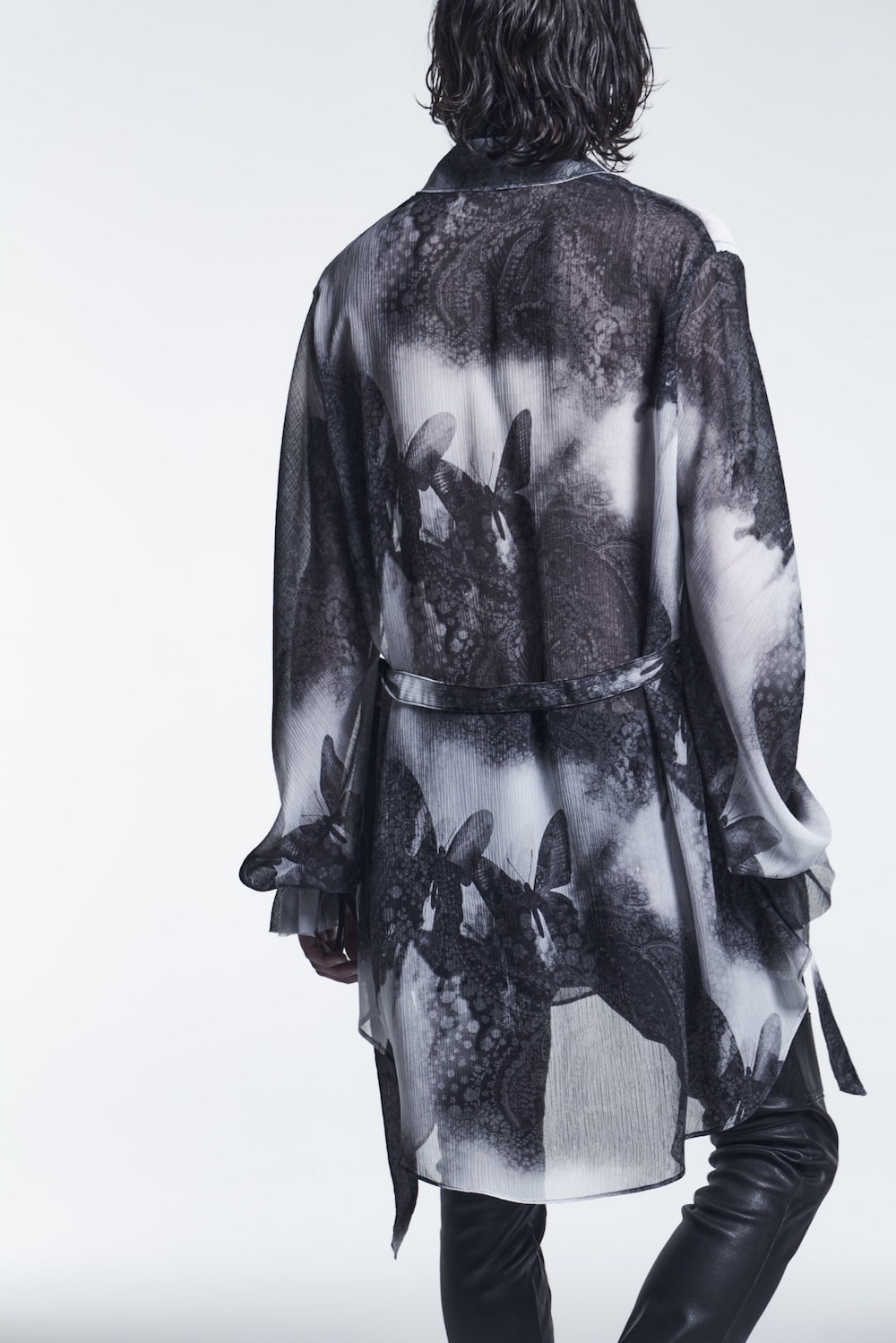 ボディ全体にデザインされた淡いストライプ柄とブランドのアイコンである蝶のシルエットがちりばめられたロングシャツ。