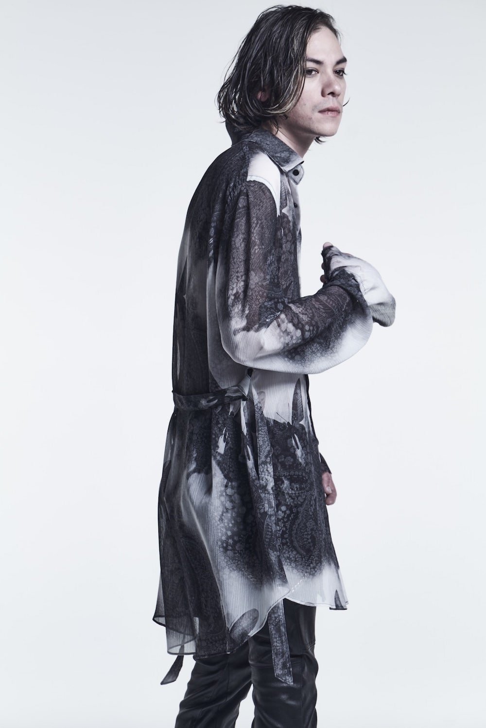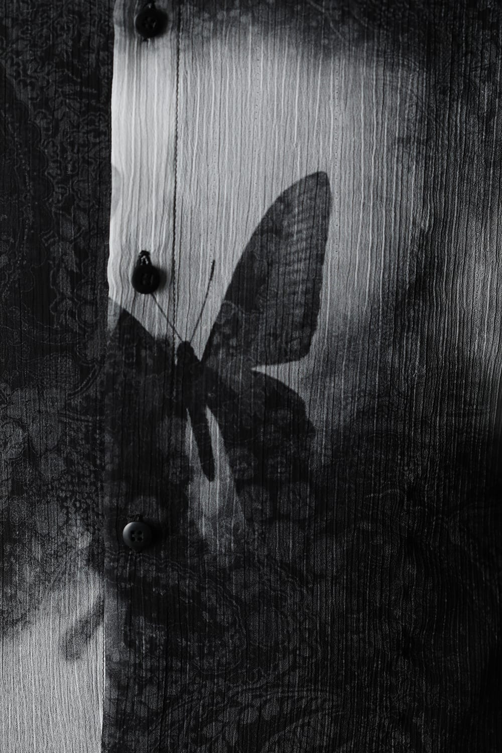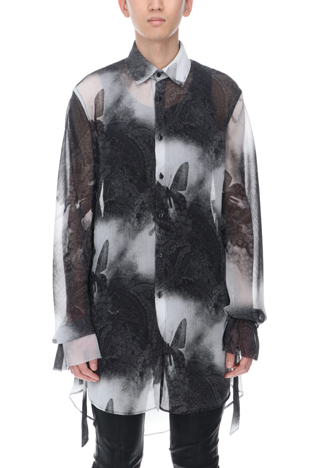 ボディ全体にデザインされた淡いストライプ柄とブランドのアイコンである蝶のシルエットがちりばめられたロングシャツ。