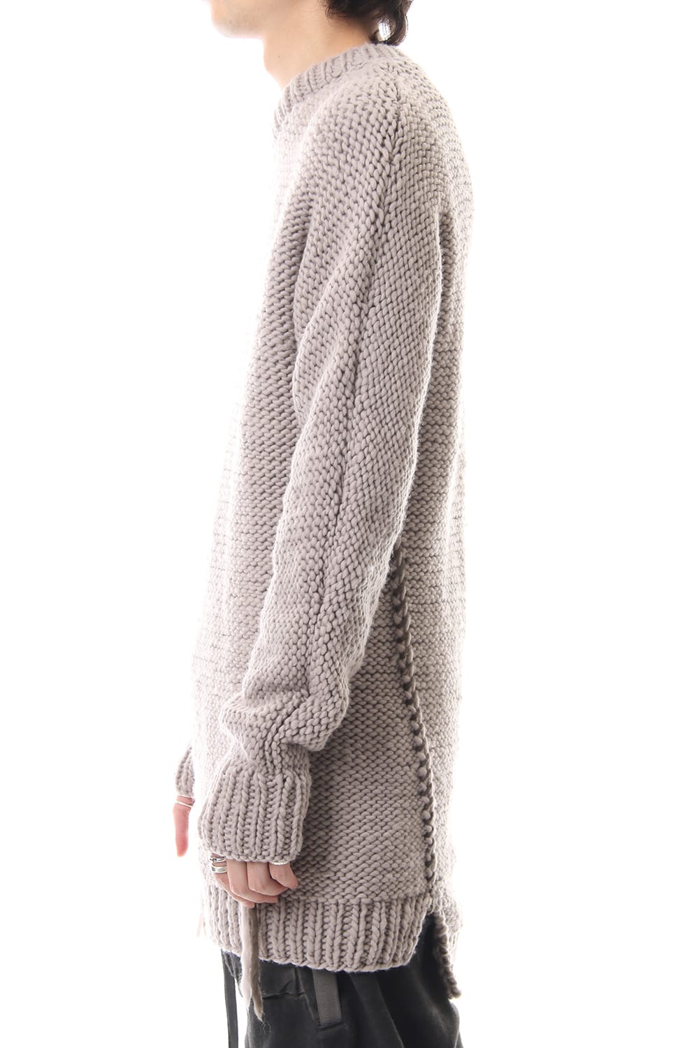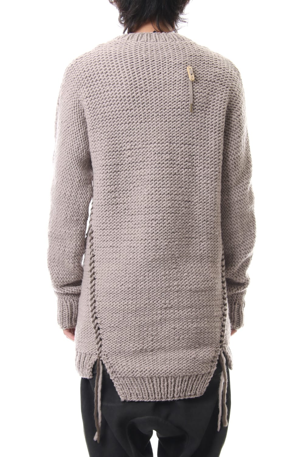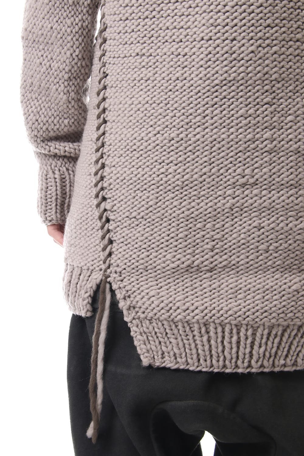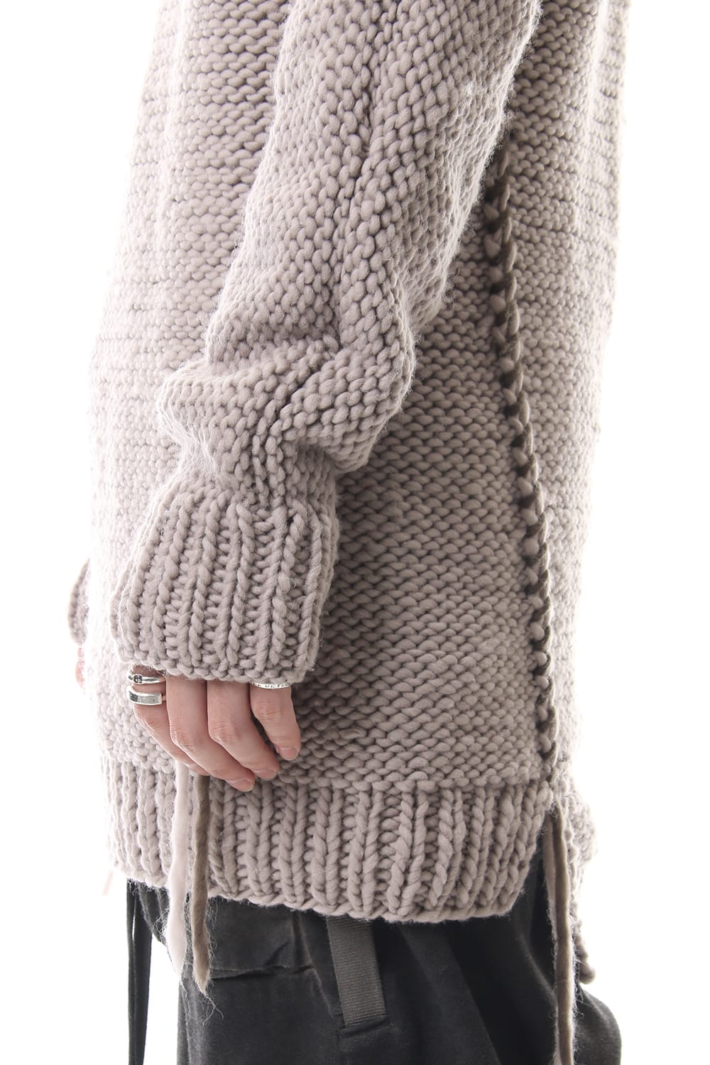 This hand knit series was impressive in this season's runway collection. This knit is a simple V-neck type that is easier to wear in a real style than the one used for the runway. The body and sleeves are knitted with the same parts to create a beautiful silhouette that blends well with the body. Wool of a different colour is woven on both sides and it also creates an accent. It's a thick knit but very light when worn.