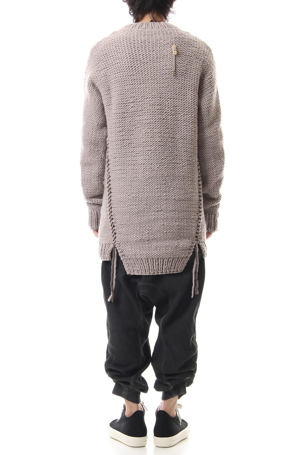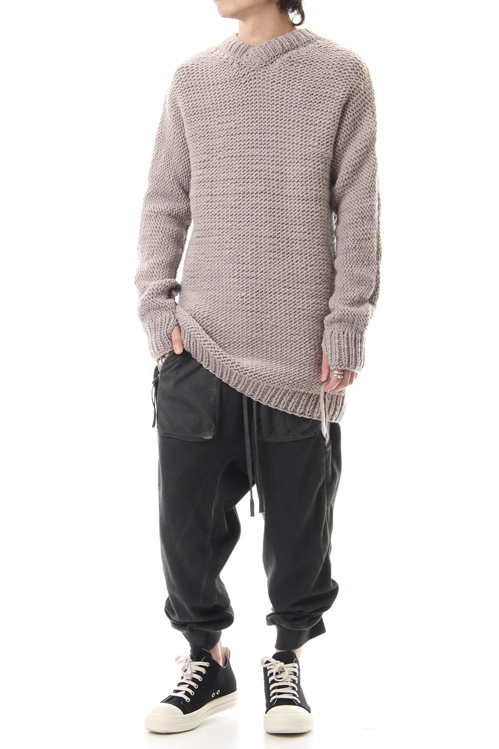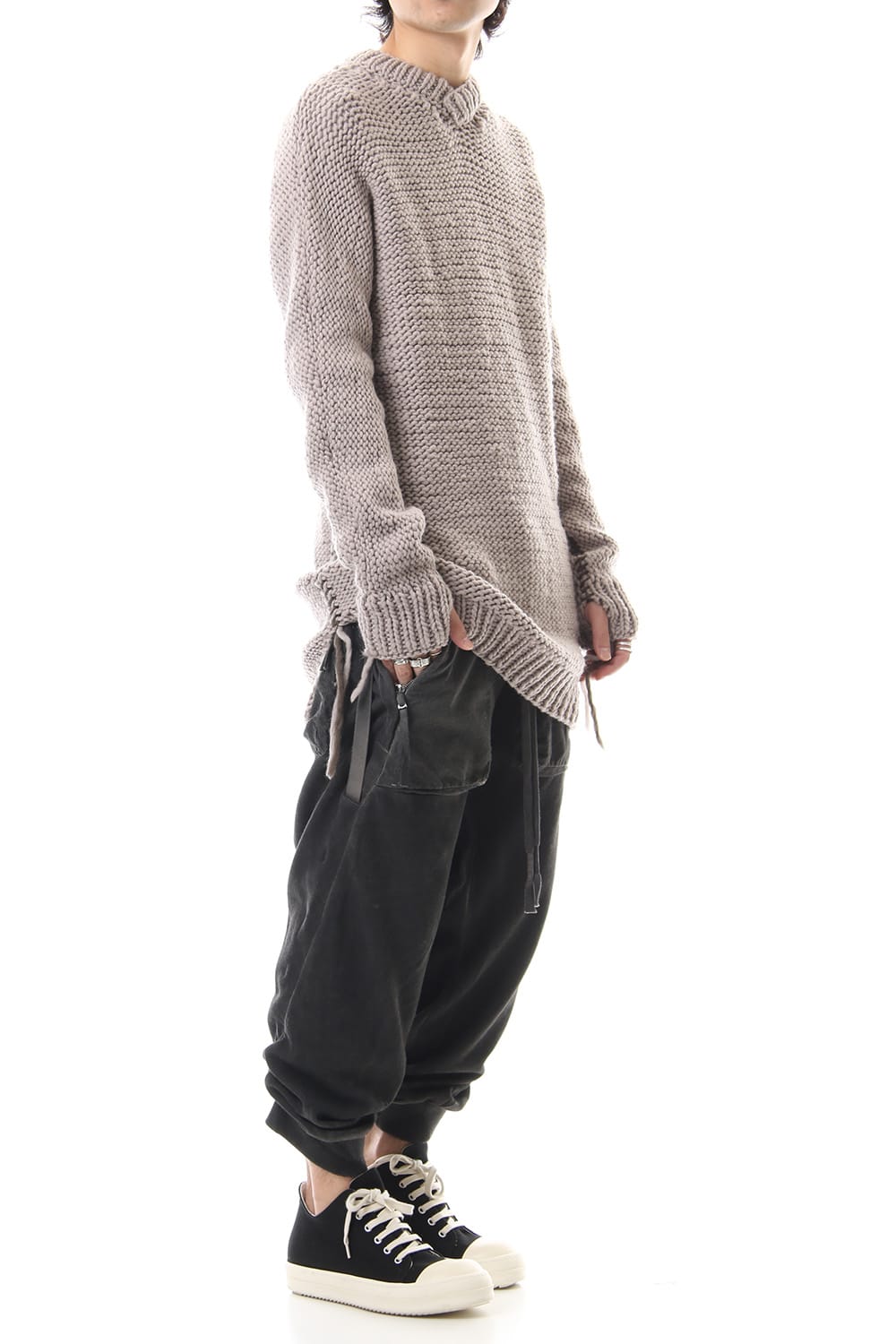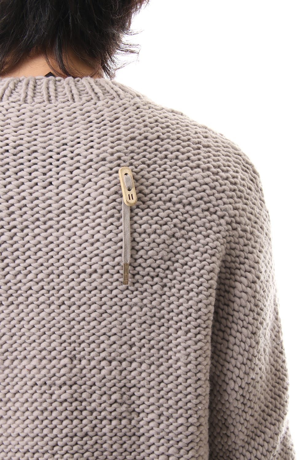 This hand knit series was impressive in this season's runway collection. This knit is a simple V-neck type that is easier to wear in a real style than the one used for the runway. The body and sleeves are knitted with the same parts to create a beautiful silhouette that blends well with the body. Wool of a different colour is woven on both sides and it also creates an accent. It's a thick knit but very light when worn.