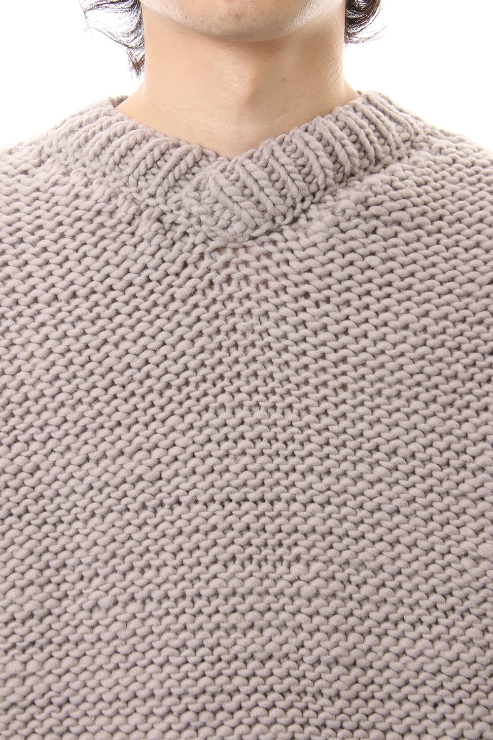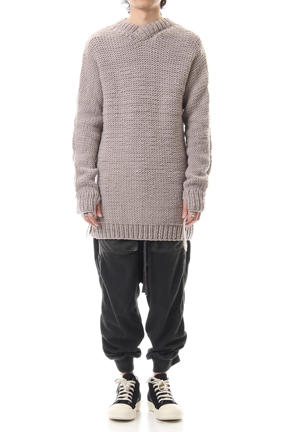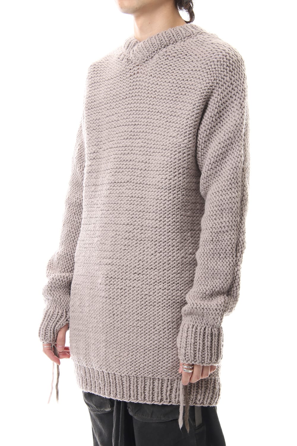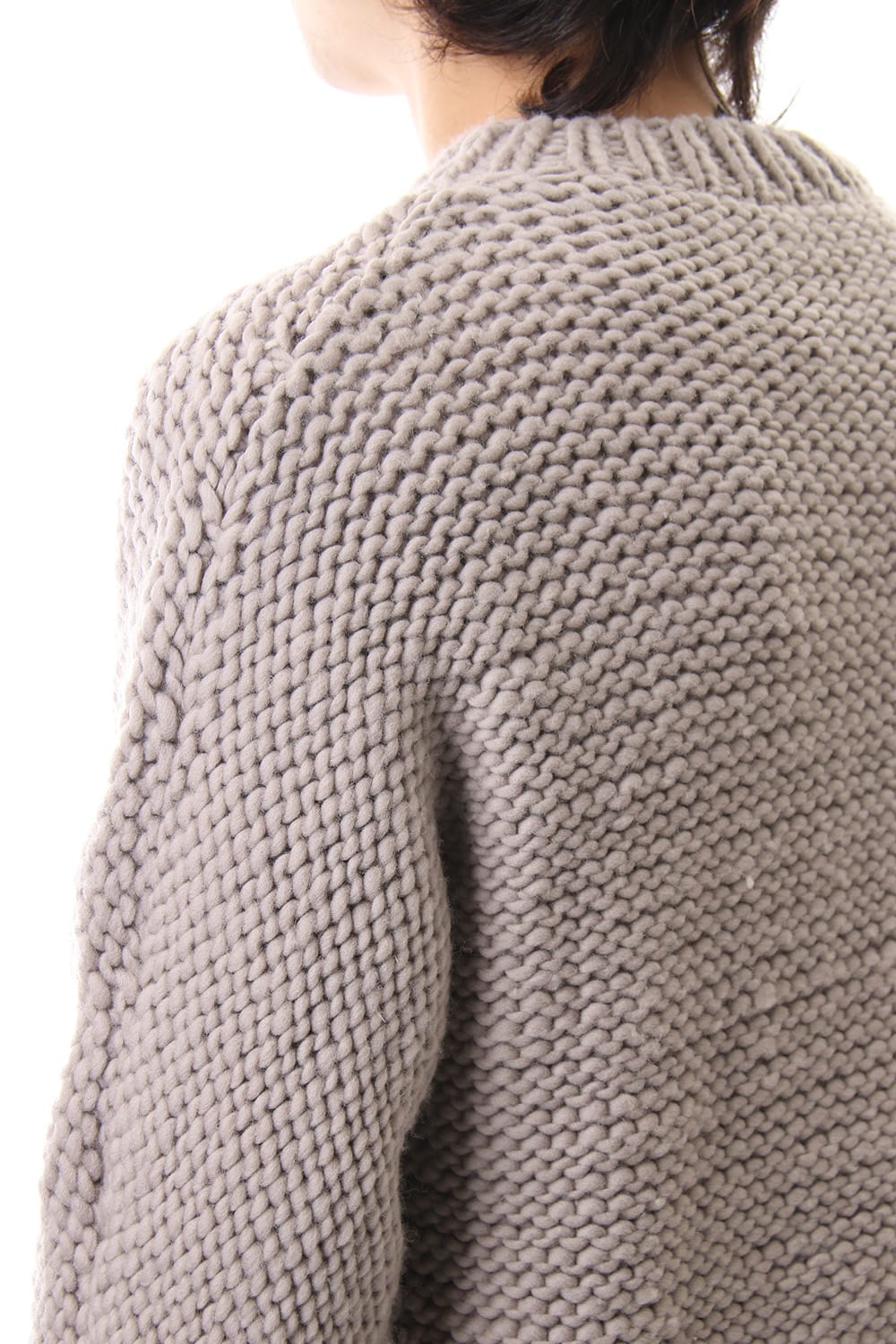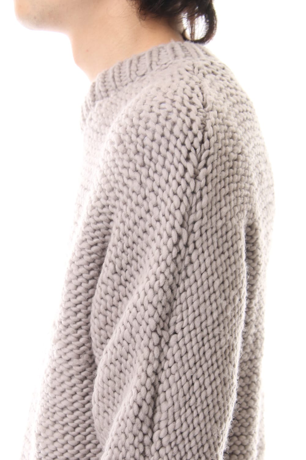 This hand knit series was impressive in this season's runway collection. This knit is a simple V-neck type that is easier to wear in a real style than the one used for the runway. The body and sleeves are knitted with the same parts to create a beautiful silhouette that blends well with the body. Wool of a different colour is woven on both sides and it also creates an accent. It's a thick knit but very light when worn.